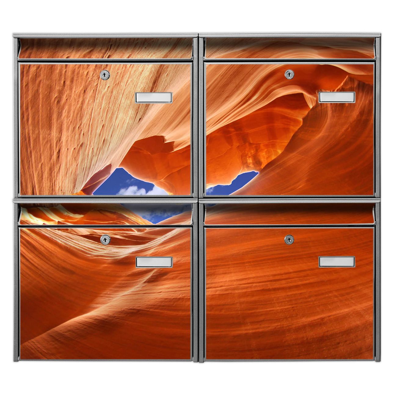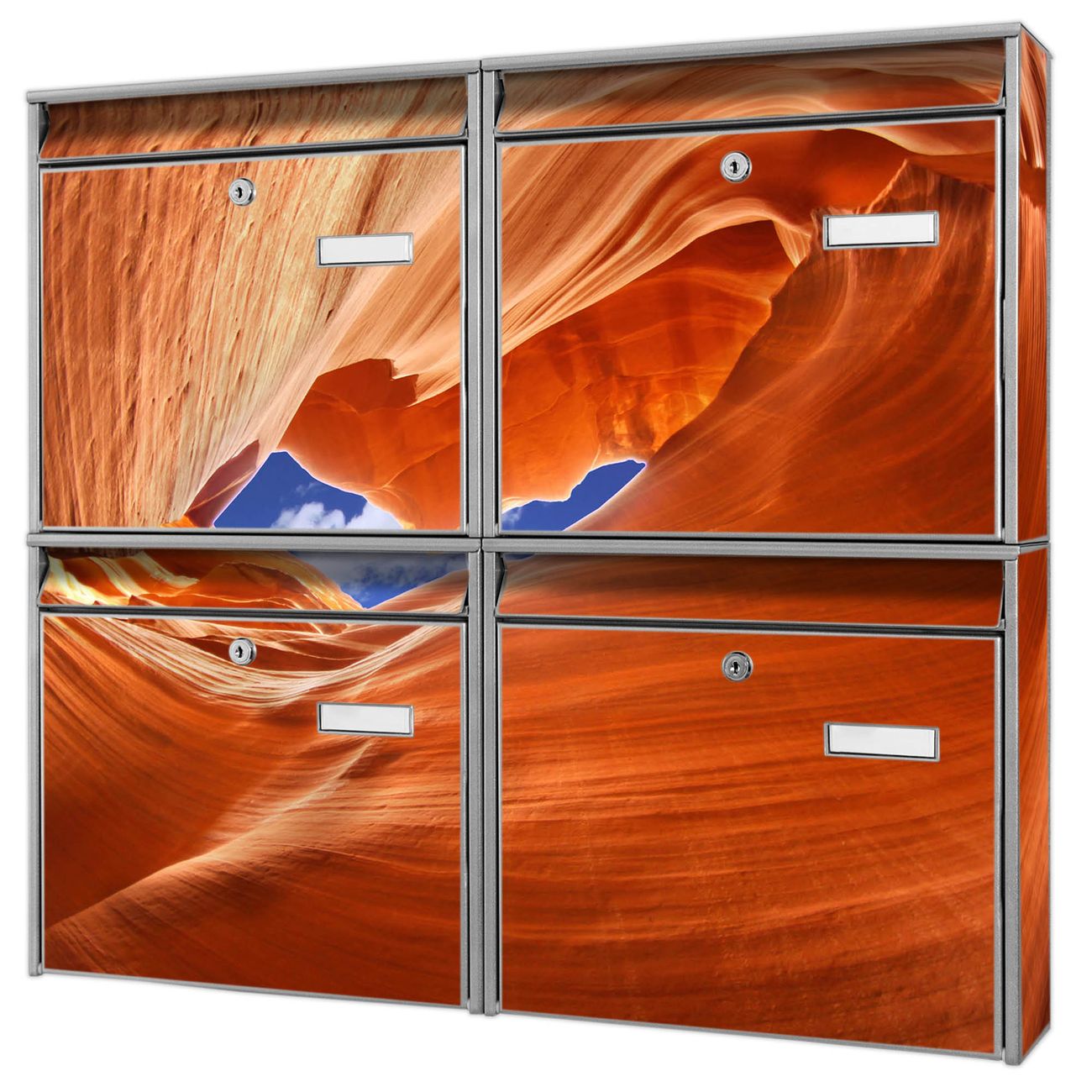 FUNKTION: Die Burg-Wächter Briefkastenanlage mit Motiv Antelope Canyon 3 bietet Ihnen ausreichend Fassungsvermögen um auch A4 und C4 Sendungen zu empfangen. Das integrierte Namensschild lässt sich individuell beschriften. Wählen Sie aus den Grundfarben weiß, silber und schwarz. DESIGN: Die 4 Briefkästen haben ein ansprechendes und zeitloses Design, ohne dabei auf Funktionalität zu verzichten. Das Material ist sehr stabil, wetterfest und rostfrei. Durch das Motiv Antelope Canyon 3 werden die Postkästen zu einem Blickfang. DETAILS: Die Postkästen bestehen aus verzinktem Stahl der zusätzlich mit Klarlack versiegelt wurde. Die Kästen sind gesamt 64,5cm hoch, 72,5cm breit und 10cm tief. Das Motiv besteht aus einer wetter- und UV-festen Folie, die Ihren Briefkasten zusätzlich vor Kratzern schützt. Die Postkästen werden mit Montagematerial, je einem Namensschild und je zwei Schlüsseln geliefert. NUTZEN: Das Briefkastenset eignet sich für die Wandmontage, die Größe bietet genügend Platz für Sendungen aller Art. Das zeitlose Design sowie die stabile Bauart bieten Ihnen einen treuen Begleiter für Ihre Post. BANJADO: