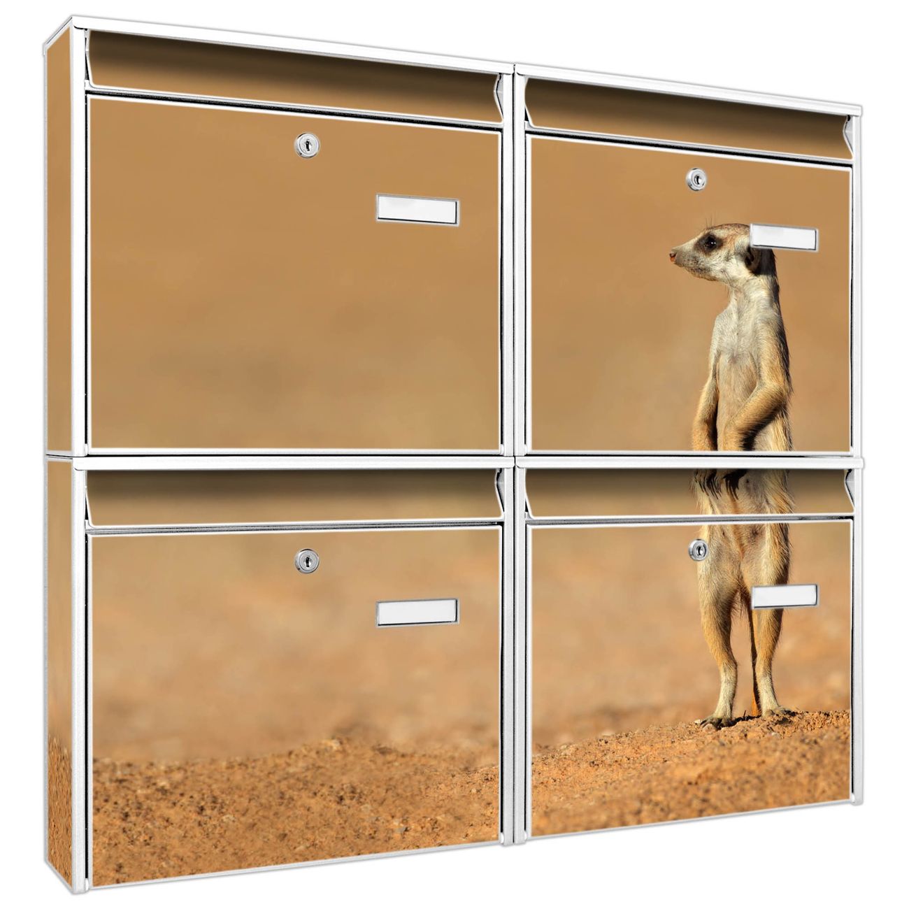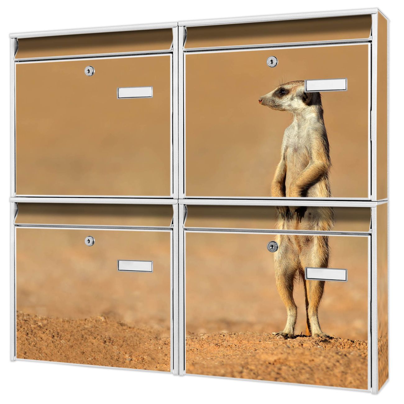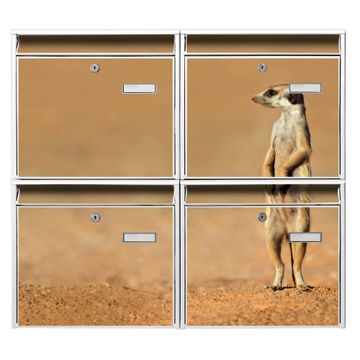 FUNKTION: Die Burg-Wächter Briefkastenanlage mit Motiv Henryk 2 bietet Ihnen ausreichend Fassungsvermögen um auch A4 und C4 Sendungen zu empfangen. Das integrierte Namensschild lässt sich individuell beschriften. Wählen Sie aus den Grundfarben weiß, silber und schwarz. DESIGN: Die 4 Briefkästen haben ein ansprechendes und zeitloses Design, ohne dabei auf Funktionalität zu verzichten. Das Material ist sehr stabil, wetterfest und rostfrei. Durch das Motiv Henryk 2 werden die Postkästen zu einem Blickfang. DETAILS: Die Postkästen bestehen aus verzinktem Stahl der zusätzlich mit Klarlack versiegelt wurde. Die Kästen sind gesamt 64,5cm hoch, 72,5cm breit und 10cm tief. Das Motiv besteht aus einer wetter- und UV-festen Folie, die Ihren Briefkasten zusätzlich vor Kratzern schützt. Die Postkästen werden mit Montagematerial, je einem Namensschild und je zwei Schlüsseln geliefert. NUTZEN: Das Briefkastenset eignet sich für die Wandmontage, die Größe bietet genügend Platz für Sendungen aller Art. Das zeitlose Design sowie die stabile Bauart bieten Ihnen einen treuen Begleiter für Ihre Post. BANJADO: