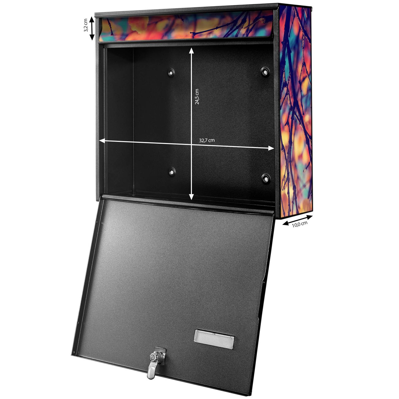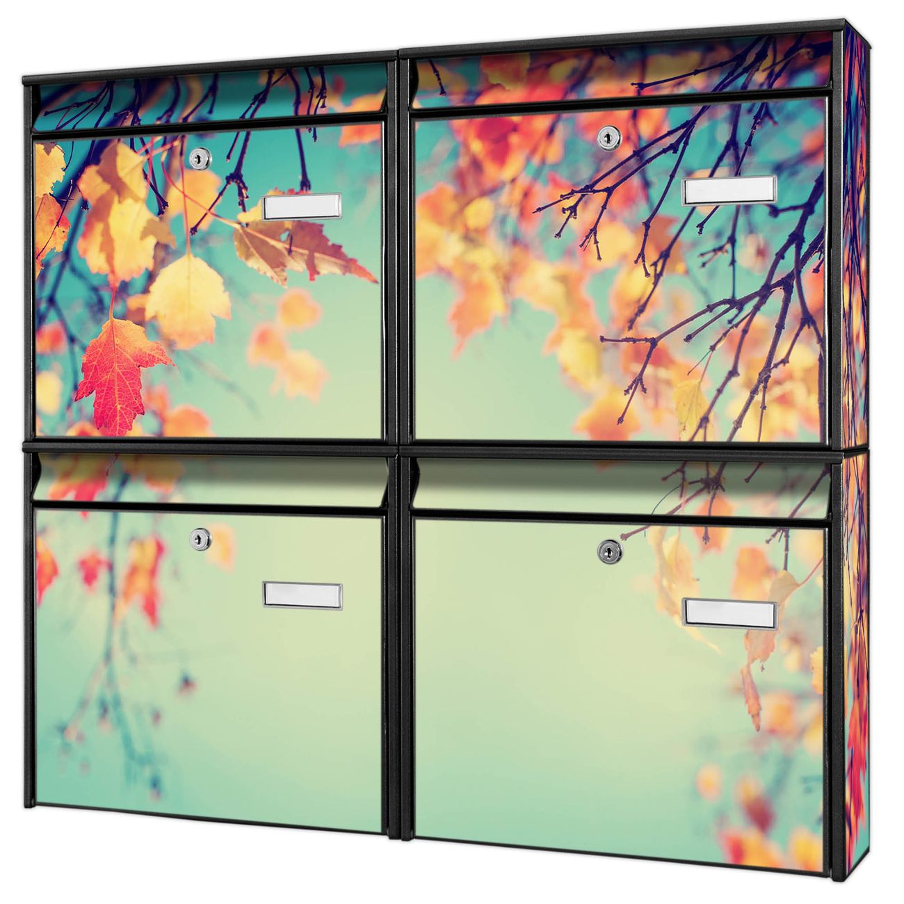 FUNKTION: Die Burg-Wächter Briefkastenanlage mit Motiv Herbst bietet Ihnen ausreichend Fassungsvermögen um auch A4 und C4 Sendungen zu empfangen. Das integrierte Namensschild lässt sich individuell beschriften. Wählen Sie aus den Grundfarben weiß, silber und schwarz. DESIGN: Die 4 Briefkästen haben ein ansprechendes und zeitloses Design, ohne dabei auf Funktionalität zu verzichten. Das Material ist sehr stabil, wetterfest und rostfrei. Durch das Motiv Herbst werden die Postkästen zu einem Blickfang. DETAILS: Die Postkästen bestehen aus verzinktem Stahl der zusätzlich mit Klarlack versiegelt wurde. Die Kästen sind gesamt 64,5cm hoch, 72,5cm breit und 10cm tief. Das Motiv besteht aus einer wetter- und UV-festen Folie, die Ihren Briefkasten zusätzlich vor Kratzern schützt. Die Postkästen werden mit Montagematerial, je einem Namensschild und je zwei Schlüsseln geliefert. NUTZEN: Das Briefkastenset eignet sich für die Wandmontage, die Größe bietet genügend Platz für Sendungen aller Art. Das zeitlose Design sowie die stabile Bauart bieten Ihnen einen treuen Begleiter für Ihre Post. BANJADO: