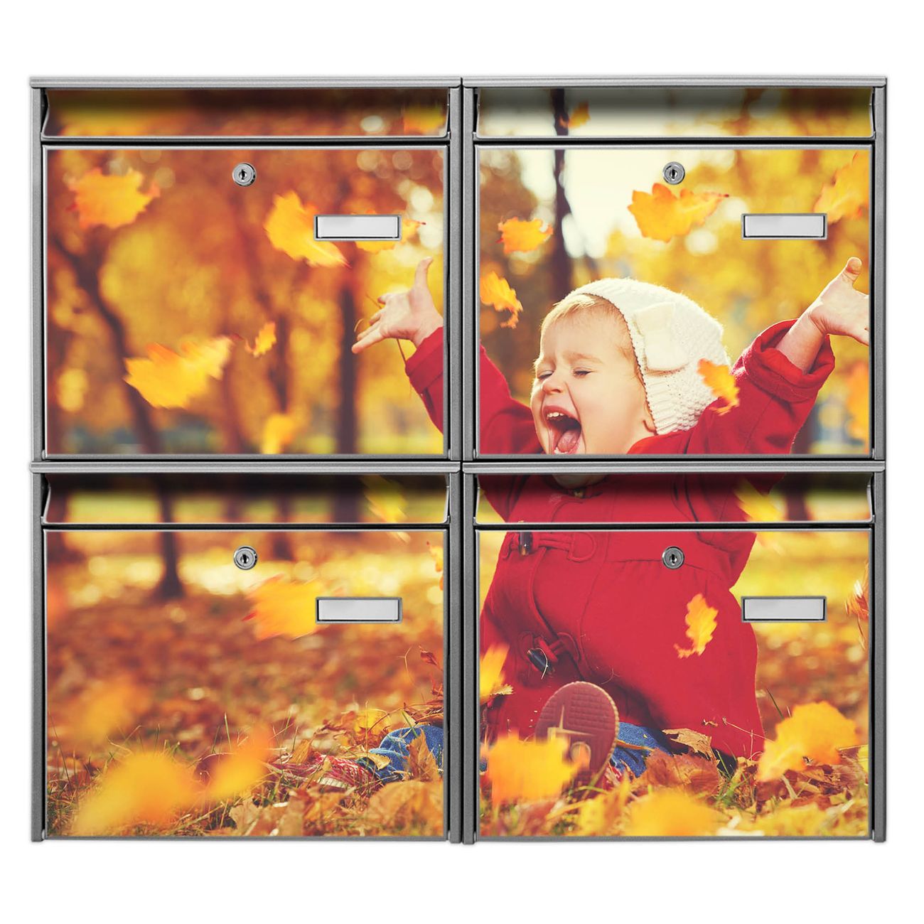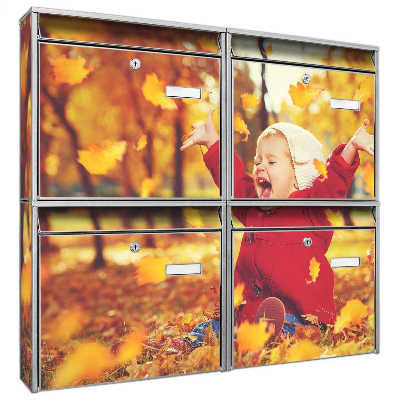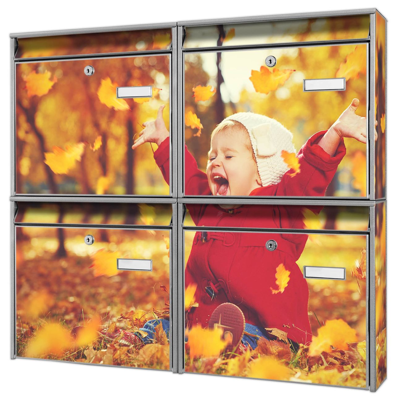 FUNKTION: Die Burg-Wächter Briefkastenanlage mit Motiv Herbstfreude bietet Ihnen ausreichend Fassungsvermögen um auch A4 und C4 Sendungen zu empfangen. Das integrierte Namensschild lässt sich individuell beschriften. Wählen Sie aus den Grundfarben weiß, silber und schwarz. DESIGN: Die 4 Briefkästen haben ein ansprechendes und zeitloses Design, ohne dabei auf Funktionalität zu verzichten. Das Material ist sehr stabil, wetterfest und rostfrei. Durch das Motiv Herbstfreude werden die Postkästen zu einem Blickfang. DETAILS: Die Postkästen bestehen aus verzinktem Stahl der zusätzlich mit Klarlack versiegelt wurde. Die Kästen sind gesamt 64,5cm hoch, 72,5cm breit und 10cm tief. Das Motiv besteht aus einer wetter- und UV-festen Folie, die Ihren Briefkasten zusätzlich vor Kratzern schützt. Die Postkästen werden mit Montagematerial, je einem Namensschild und je zwei Schlüsseln geliefert. NUTZEN: Das Briefkastenset eignet sich für die Wandmontage, die Größe bietet genügend Platz für Sendungen aller Art. Das zeitlose Design sowie die stabile Bauart bieten Ihnen einen treuen Begleiter für Ihre Post. BANJADO: