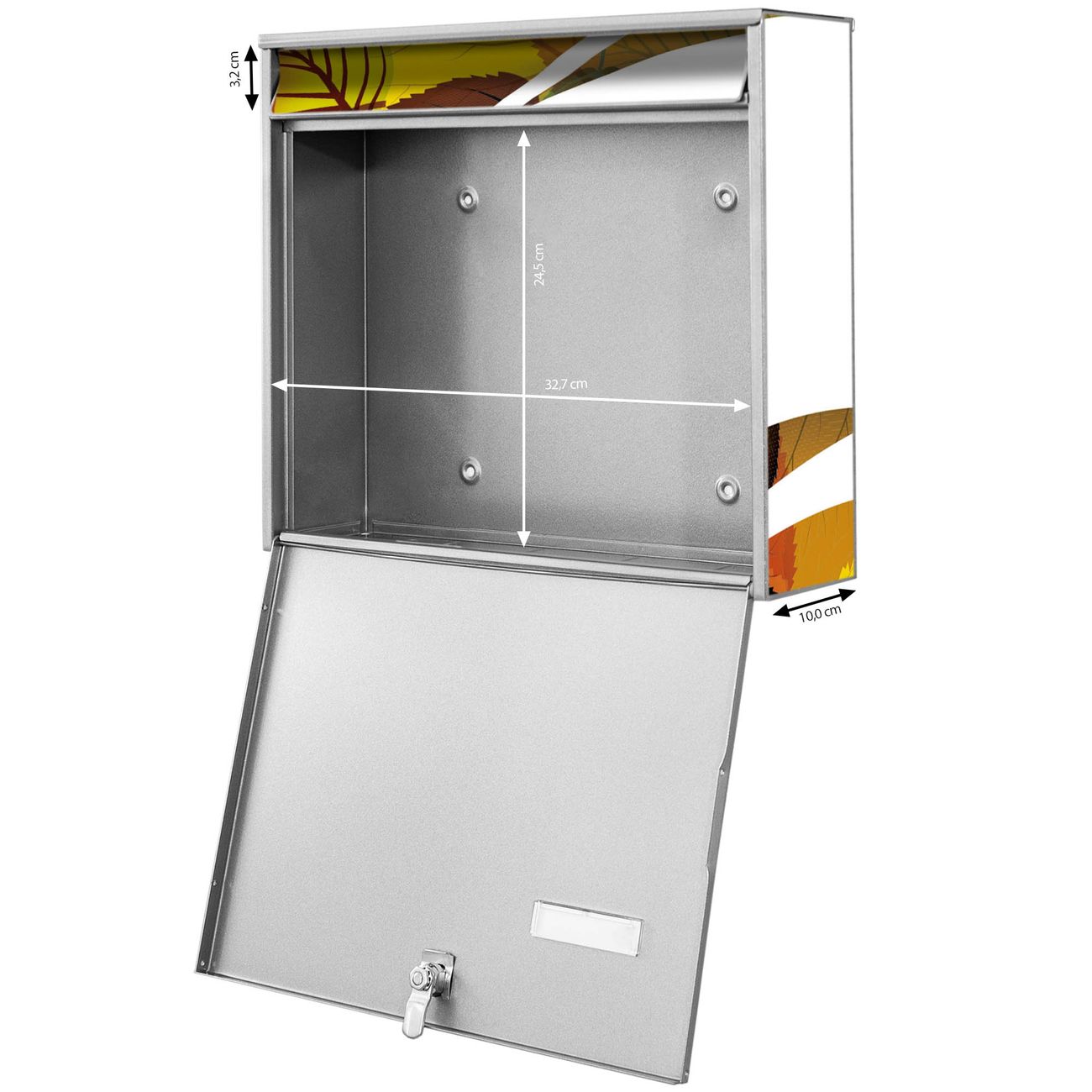 FUNKTION: Die Burg-Wächter Briefkastenanlage mit Motiv Herbstlaub bietet Ihnen ausreichend Fassungsvermögen um auch A4 und C4 Sendungen zu empfangen. Das integrierte Namensschild lässt sich individuell beschriften. Wählen Sie aus den Grundfarben weiß, silber und schwarz. DESIGN: Die 4 Briefkästen haben ein ansprechendes und zeitloses Design, ohne dabei auf Funktionalität zu verzichten. Das Material ist sehr stabil, wetterfest und rostfrei. Durch das Motiv Herbstlaub werden die Postkästen zu einem Blickfang. DETAILS: Die Postkästen bestehen aus verzinktem Stahl der zusätzlich mit Klarlack versiegelt wurde. Die Kästen sind gesamt 64,5cm hoch, 72,5cm breit und 10cm tief. Das Motiv besteht aus einer wetter- und UV-festen Folie, die Ihren Briefkasten zusätzlich vor Kratzern schützt. Die Postkästen werden mit Montagematerial, je einem Namensschild und je zwei Schlüsseln geliefert. NUTZEN: Das Briefkastenset eignet sich für die Wandmontage, die Größe bietet genügend Platz für Sendungen aller Art. Das zeitlose Design sowie die stabile Bauart bieten Ihnen einen treuen Begleiter für Ihre Post. BANJADO: