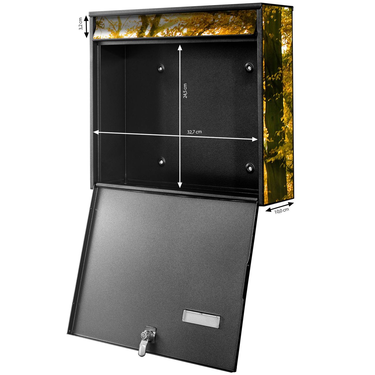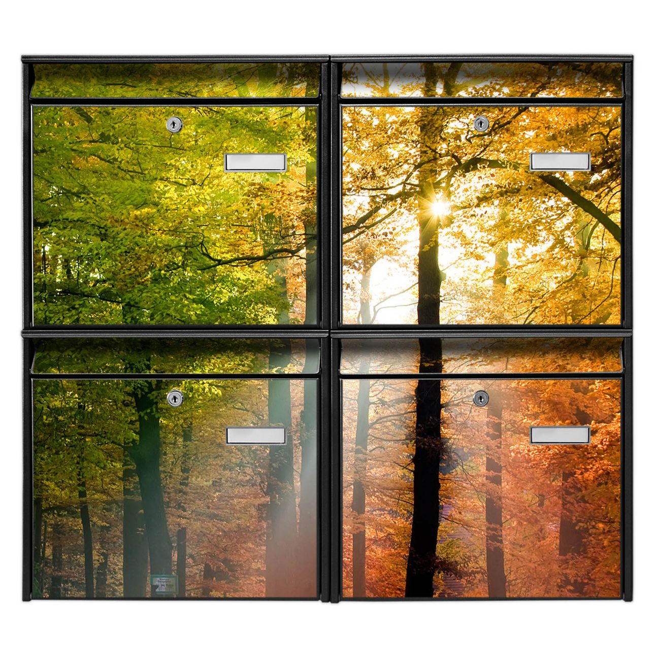 FUNKTION: Die Burg-Wächter Briefkastenanlage mit Motiv Herbstwald bietet Ihnen ausreichend Fassungsvermögen um auch A4 und C4 Sendungen zu empfangen. Das integrierte Namensschild lässt sich individuell beschriften. Wählen Sie aus den Grundfarben weiß, silber und schwarz. DESIGN: Die 4 Briefkästen haben ein ansprechendes und zeitloses Design, ohne dabei auf Funktionalität zu verzichten. Das Material ist sehr stabil, wetterfest und rostfrei. Durch das Motiv Herbstwald werden die Postkästen zu einem Blickfang. DETAILS: Die Postkästen bestehen aus verzinktem Stahl der zusätzlich mit Klarlack versiegelt wurde. Die Kästen sind gesamt 64,5cm hoch, 72,5cm breit und 10cm tief. Das Motiv besteht aus einer wetter- und UV-festen Folie, die Ihren Briefkasten zusätzlich vor Kratzern schützt. Die Postkästen werden mit Montagematerial, je einem Namensschild und je zwei Schlüsseln geliefert. NUTZEN: Das Briefkastenset eignet sich für die Wandmontage, die Größe bietet genügend Platz für Sendungen aller Art. Das zeitlose Design sowie die stabile Bauart bieten Ihnen einen treuen Begleiter für Ihre Post. BANJADO: