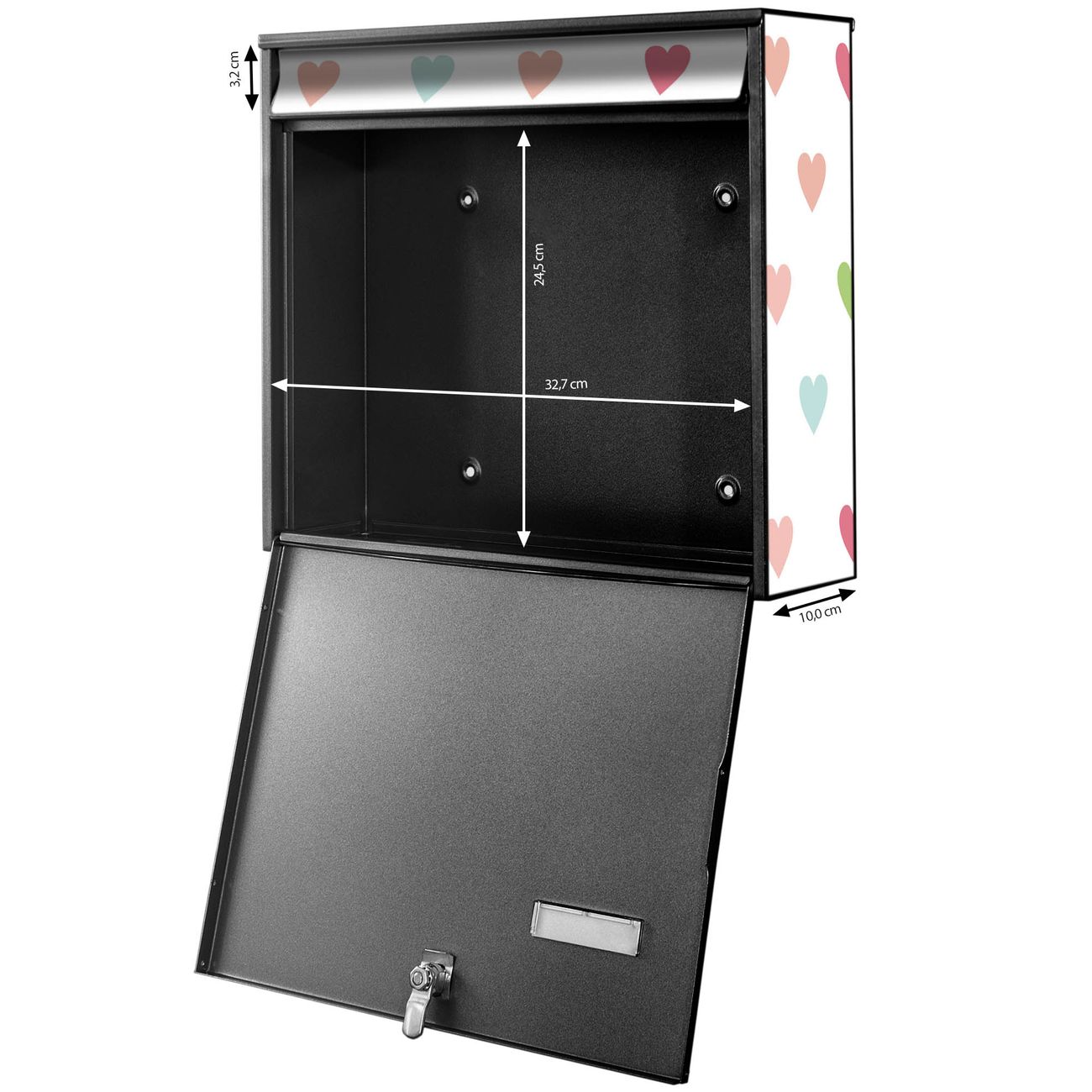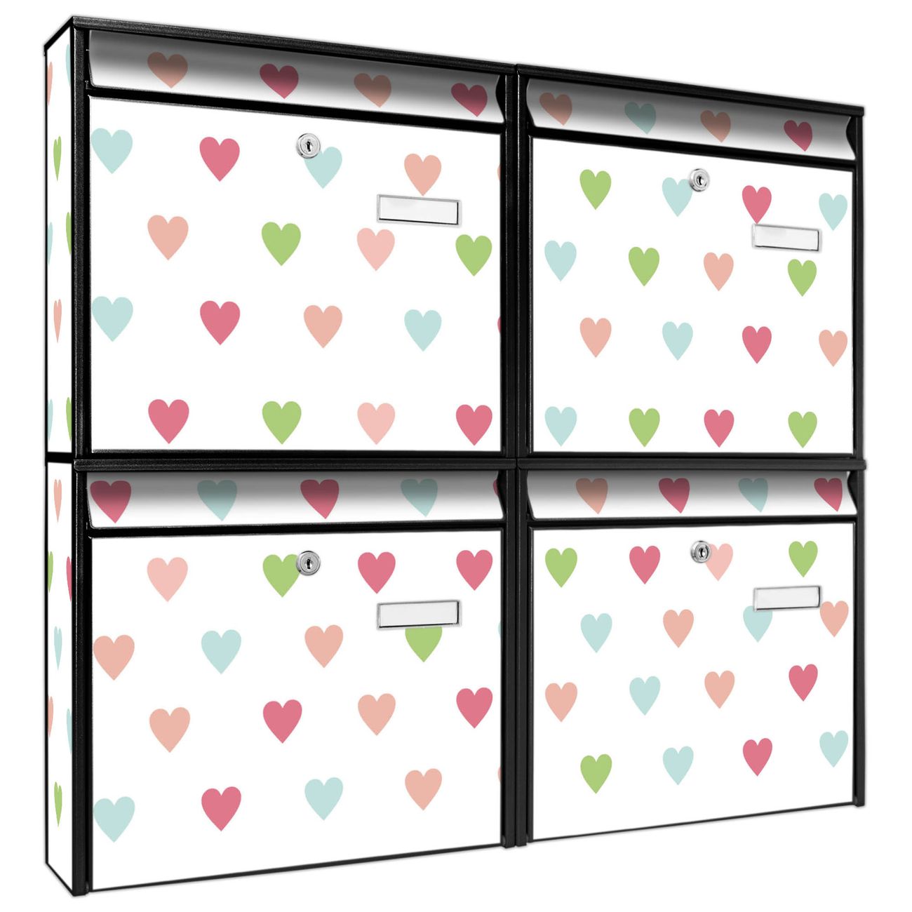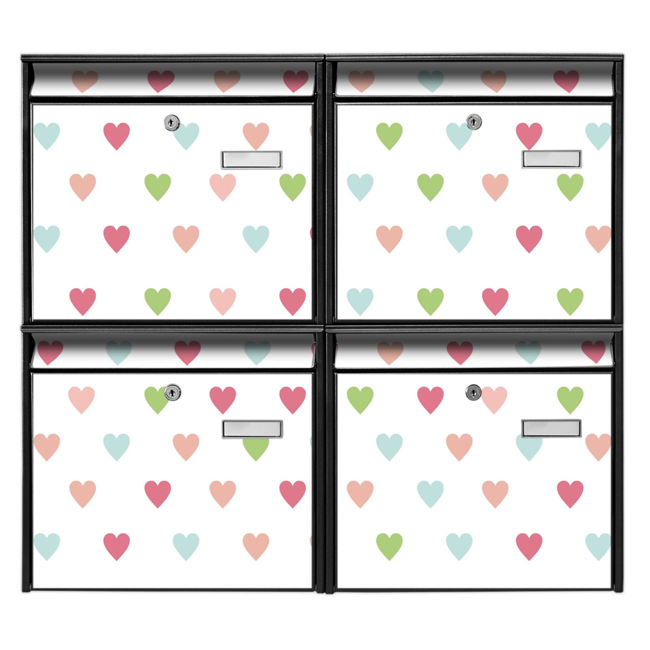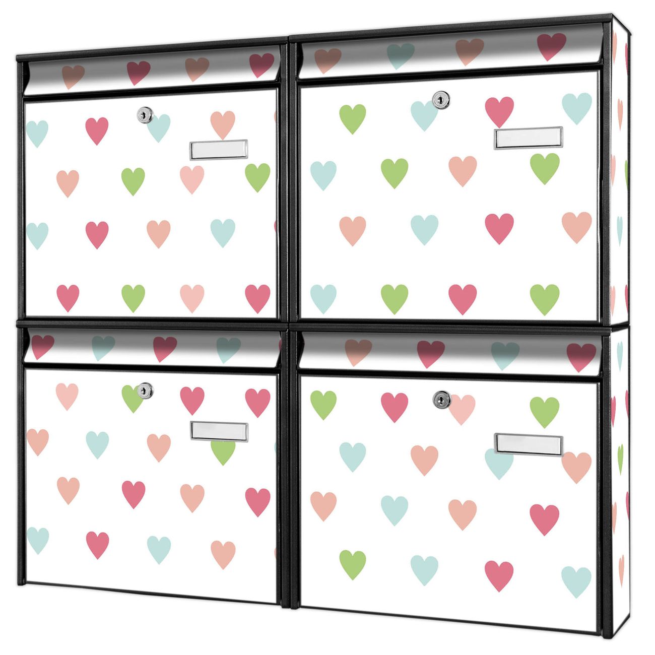 FUNKTION: Die Burg-Wächter Briefkastenanlage mit Motiv Herzen Auf Weiß bietet Ihnen ausreichend Fassungsvermögen um auch A4 und C4 Sendungen zu empfangen. Das integrierte Namensschild lässt sich individuell beschriften. Wählen Sie aus den Grundfarben weiß, silber und schwarz. DESIGN: Die 4 Briefkästen haben ein ansprechendes und zeitloses Design, ohne dabei auf Funktionalität zu verzichten. Das Material ist sehr stabil, wetterfest und rostfrei. Durch das Motiv Herzen Auf Weiß werden die Postkästen zu einem Blickfang. DETAILS: Die Postkästen bestehen aus verzinktem Stahl der zusätzlich mit Klarlack versiegelt wurde. Die Kästen sind gesamt 64,5cm hoch, 72,5cm breit und 10cm tief. Das Motiv besteht aus einer wetter- und UV-festen Folie, die Ihren Briefkasten zusätzlich vor Kratzern schützt. Die Postkästen werden mit Montagematerial, je einem Namensschild und je zwei Schlüsseln geliefert. NUTZEN: Das Briefkastenset eignet sich für die Wandmontage, die Größe bietet genügend Platz für Sendungen aller Art. Das zeitlose Design sowie die stabile Bauart bieten Ihnen einen treuen Begleiter für Ihre Post. BANJADO: