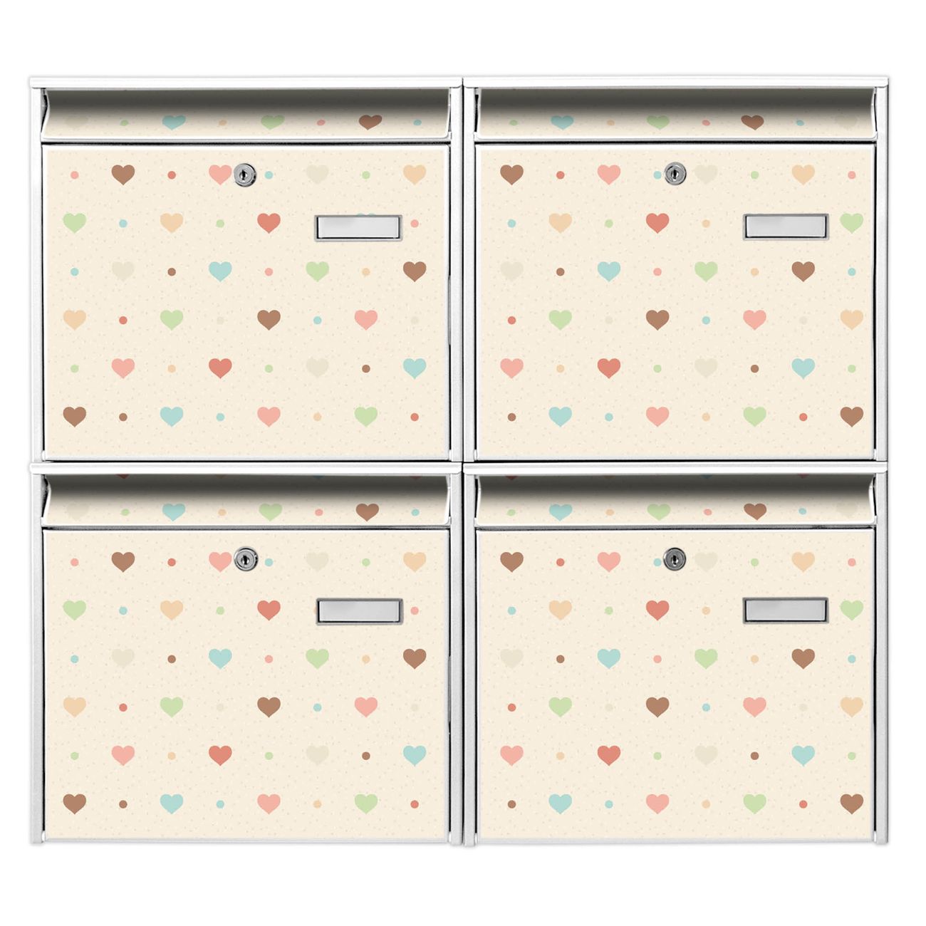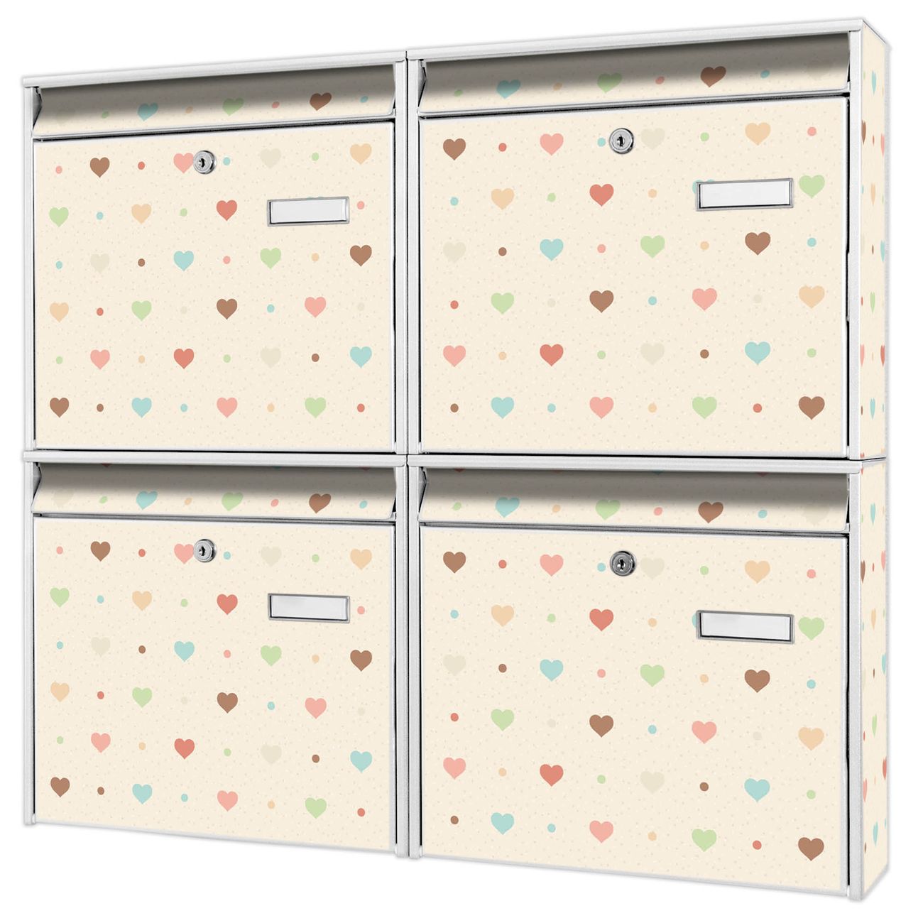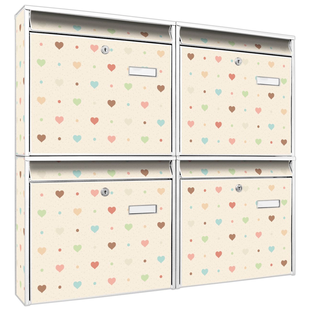 FUNKTION: Die Burg-Wächter Briefkastenanlage mit Motiv Herzen bunt bietet Ihnen ausreichend Fassungsvermögen um auch A4 und C4 Sendungen zu empfangen. Das integrierte Namensschild lässt sich individuell beschriften. Wählen Sie aus den Grundfarben weiß, silber und schwarz. DESIGN: Die 4 Briefkästen haben ein ansprechendes und zeitloses Design, ohne dabei auf Funktionalität zu verzichten. Das Material ist sehr stabil, wetterfest und rostfrei. Durch das Motiv Herzen bunt werden die Postkästen zu einem Blickfang. DETAILS: Die Postkästen bestehen aus verzinktem Stahl der zusätzlich mit Klarlack versiegelt wurde. Die Kästen sind gesamt 64,5cm hoch, 72,5cm breit und 10cm tief. Das Motiv besteht aus einer wetter- und UV-festen Folie, die Ihren Briefkasten zusätzlich vor Kratzern schützt. Die Postkästen werden mit Montagematerial, je einem Namensschild und je zwei Schlüsseln geliefert. NUTZEN: Das Briefkastenset eignet sich für die Wandmontage, die Größe bietet genügend Platz für Sendungen aller Art. Das zeitlose Design sowie die stabile Bauart bieten Ihnen einen treuen Begleiter für Ihre Post. BANJADO: