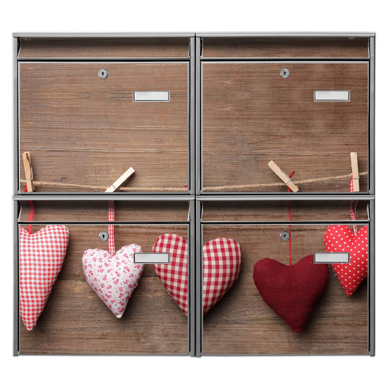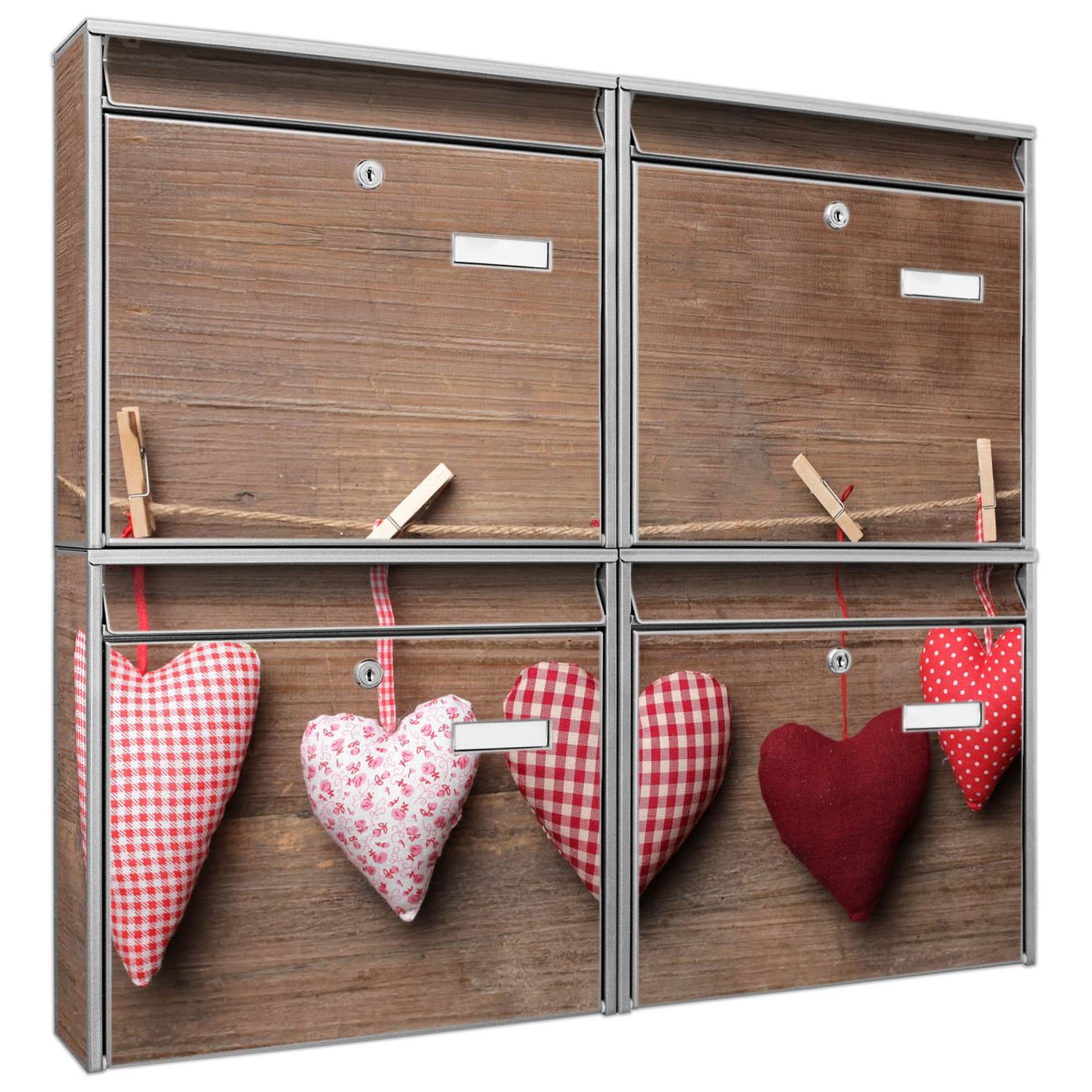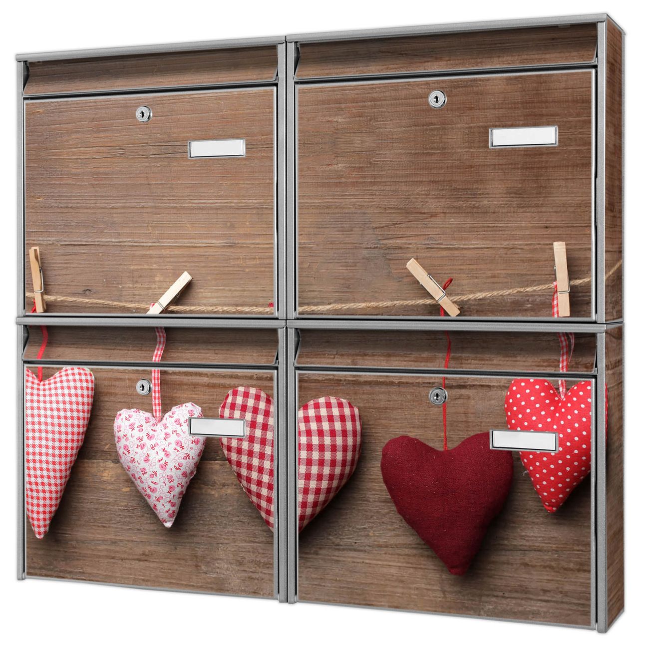 FUNKTION: Die Burg-Wächter Briefkastenanlage mit Motiv Herzen bietet Ihnen ausreichend Fassungsvermögen um auch A4 und C4 Sendungen zu empfangen. Das integrierte Namensschild lässt sich individuell beschriften. Wählen Sie aus den Grundfarben weiß, silber und schwarz. DESIGN: Die 4 Briefkästen haben ein ansprechendes und zeitloses Design, ohne dabei auf Funktionalität zu verzichten. Das Material ist sehr stabil, wetterfest und rostfrei. Durch das Motiv Herzen werden die Postkästen zu einem Blickfang. DETAILS: Die Postkästen bestehen aus verzinktem Stahl der zusätzlich mit Klarlack versiegelt wurde. Die Kästen sind gesamt 64,5cm hoch, 72,5cm breit und 10cm tief. Das Motiv besteht aus einer wetter- und UV-festen Folie, die Ihren Briefkasten zusätzlich vor Kratzern schützt. Die Postkästen werden mit Montagematerial, je einem Namensschild und je zwei Schlüsseln geliefert. NUTZEN: Das Briefkastenset eignet sich für die Wandmontage, die Größe bietet genügend Platz für Sendungen aller Art. Das zeitlose Design sowie die stabile Bauart bieten Ihnen einen treuen Begleiter für Ihre Post. BANJADO: