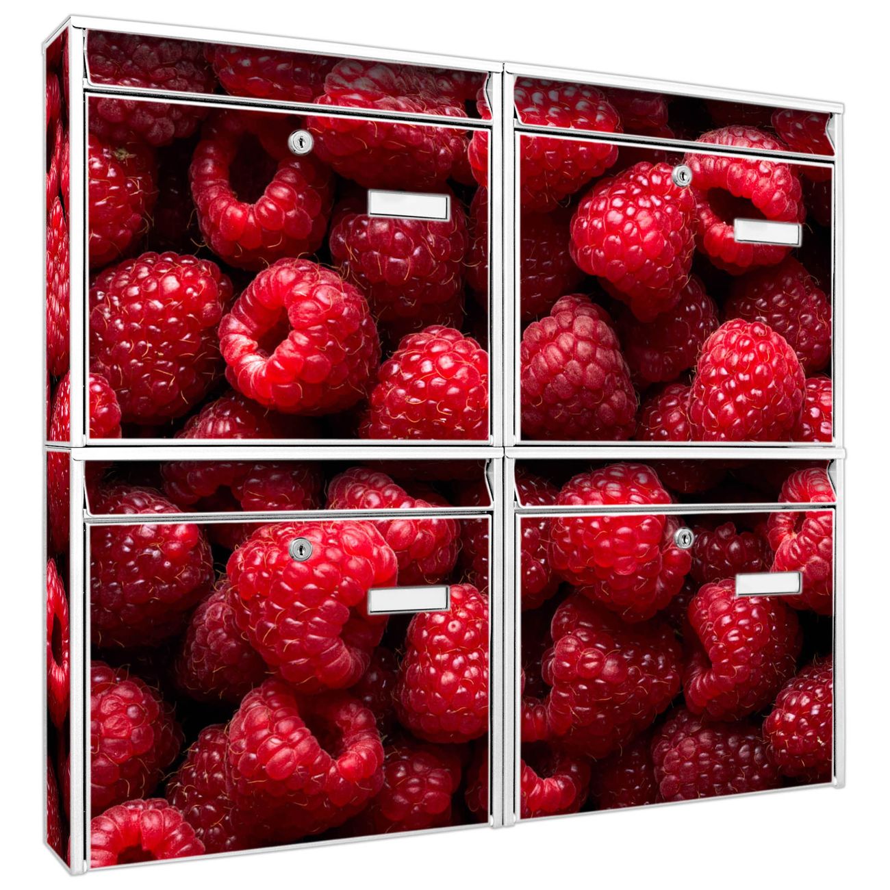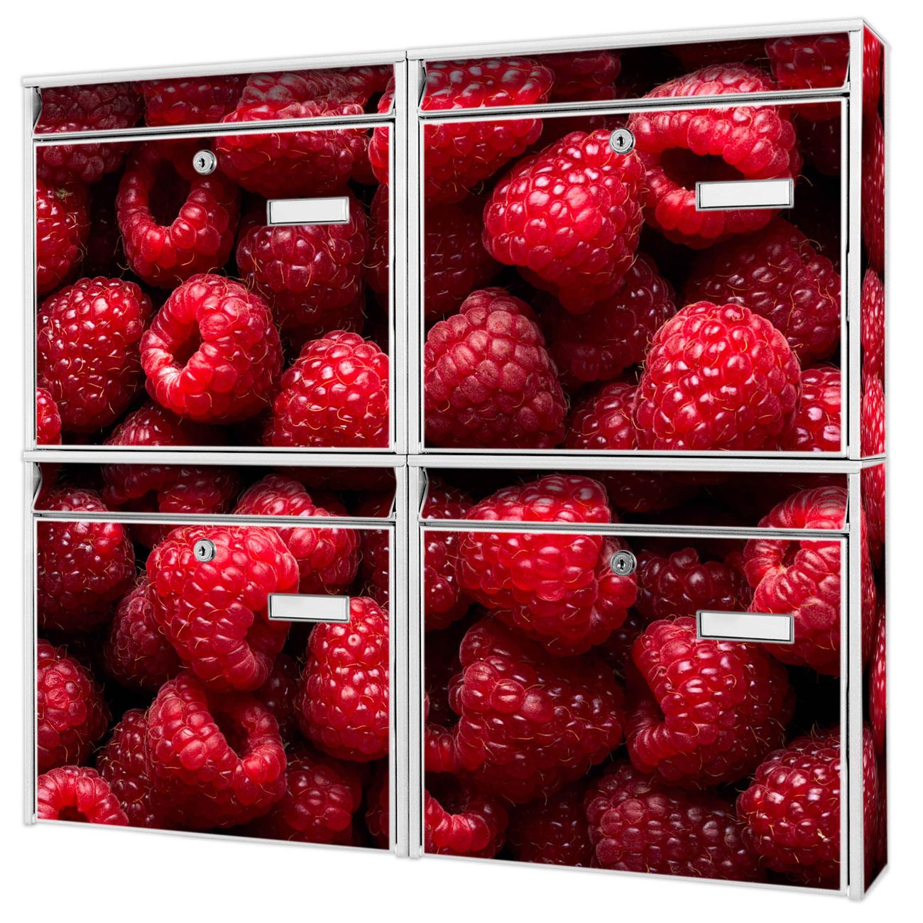 FUNKTION: Die Burg-Wächter Briefkastenanlage mit Motiv Himbeeren bietet Ihnen ausreichend Fassungsvermögen um auch A4 und C4 Sendungen zu empfangen. Das integrierte Namensschild lässt sich individuell beschriften. Wählen Sie aus den Grundfarben weiß, silber und schwarz. DESIGN: Die 4 Briefkästen haben ein ansprechendes und zeitloses Design, ohne dabei auf Funktionalität zu verzichten. Das Material ist sehr stabil, wetterfest und rostfrei. Durch das Motiv Himbeeren werden die Postkästen zu einem Blickfang. DETAILS: Die Postkästen bestehen aus verzinktem Stahl der zusätzlich mit Klarlack versiegelt wurde. Die Kästen sind gesamt 64,5cm hoch, 72,5cm breit und 10cm tief. Das Motiv besteht aus einer wetter- und UV-festen Folie, die Ihren Briefkasten zusätzlich vor Kratzern schützt. Die Postkästen werden mit Montagematerial, je einem Namensschild und je zwei Schlüsseln geliefert. NUTZEN: Das Briefkastenset eignet sich für die Wandmontage, die Größe bietet genügend Platz für Sendungen aller Art. Das zeitlose Design sowie die stabile Bauart bieten Ihnen einen treuen Begleiter für Ihre Post. BANJADO: