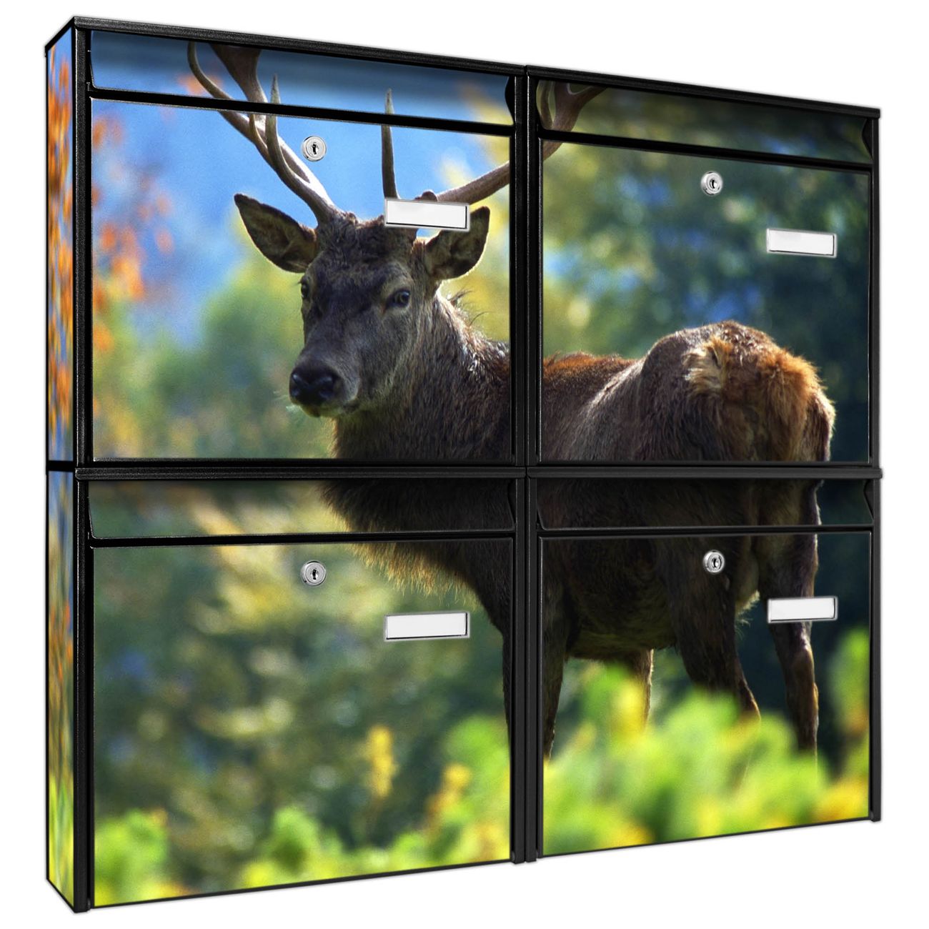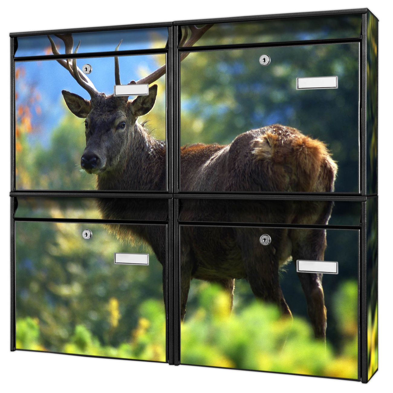 FUNKTION: Die Burg-Wächter Briefkastenanlage mit Motiv Hirsch bietet Ihnen ausreichend Fassungsvermögen um auch A4 und C4 Sendungen zu empfangen. Das integrierte Namensschild lässt sich individuell beschriften. Wählen Sie aus den Grundfarben weiß, silber und schwarz. DESIGN: Die 4 Briefkästen haben ein ansprechendes und zeitloses Design, ohne dabei auf Funktionalität zu verzichten. Das Material ist sehr stabil, wetterfest und rostfrei. Durch das Motiv Hirsch werden die Postkästen zu einem Blickfang. DETAILS: Die Postkästen bestehen aus verzinktem Stahl der zusätzlich mit Klarlack versiegelt wurde. Die Kästen sind gesamt 64,5cm hoch, 72,5cm breit und 10cm tief. Das Motiv besteht aus einer wetter- und UV-festen Folie, die Ihren Briefkasten zusätzlich vor Kratzern schützt. Die Postkästen werden mit Montagematerial, je einem Namensschild und je zwei Schlüsseln geliefert. NUTZEN: Das Briefkastenset eignet sich für die Wandmontage, die Größe bietet genügend Platz für Sendungen aller Art. Das zeitlose Design sowie die stabile Bauart bieten Ihnen einen treuen Begleiter für Ihre Post. BANJADO: