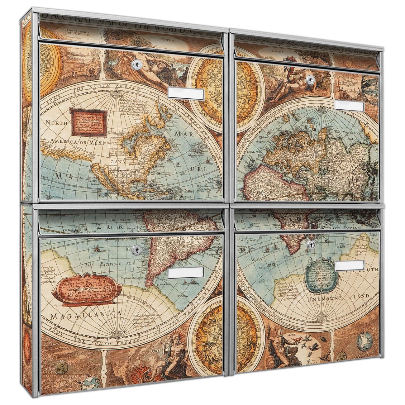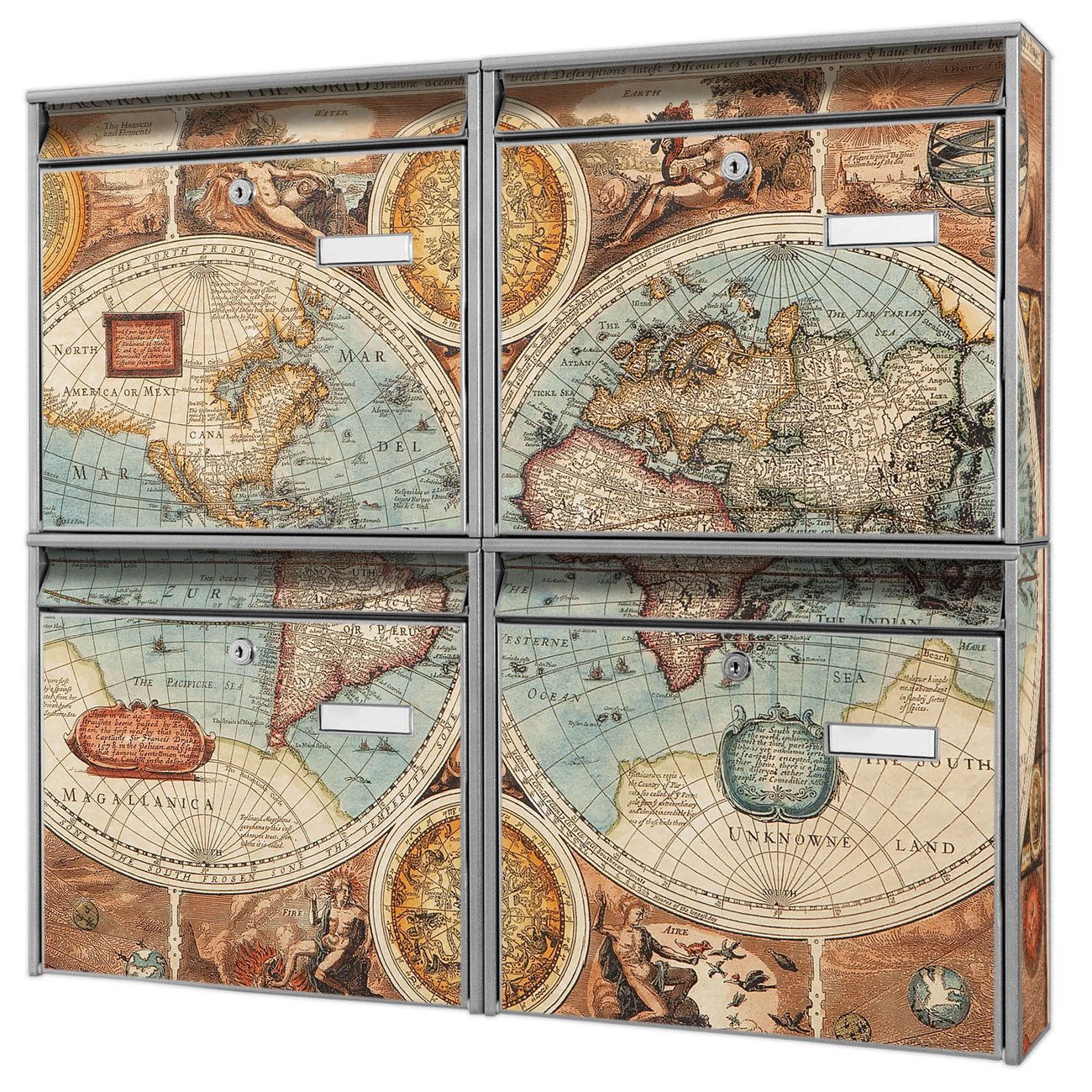 FUNKTION: Die Burg-Wächter Briefkastenanlage mit Motiv Historische Weltkarte bietet Ihnen ausreichend Fassungsvermögen um auch A4 und C4 Sendungen zu empfangen. Das integrierte Namensschild lässt sich individuell beschriften. Wählen Sie aus den Grundfarben weiß, silber und schwarz. DESIGN: Die 4 Briefkästen haben ein ansprechendes und zeitloses Design, ohne dabei auf Funktionalität zu verzichten. Das Material ist sehr stabil, wetterfest und rostfrei. Durch das Motiv Historische Weltkarte werden die Postkästen zu einem Blickfang. DETAILS: Die Postkästen bestehen aus verzinktem Stahl der zusätzlich mit Klarlack versiegelt wurde. Die Kästen sind gesamt 64,5cm hoch, 72,5cm breit und 10cm tief. Das Motiv besteht aus einer wetter- und UV-festen Folie, die Ihren Briefkasten zusätzlich vor Kratzern schützt. Die Postkästen werden mit Montagematerial, je einem Namensschild und je zwei Schlüsseln geliefert. NUTZEN: Das Briefkastenset eignet sich für die Wandmontage, die Größe bietet genügend Platz für Sendungen aller Art. Das zeitlose Design sowie die stabile Bauart bieten Ihnen einen treuen Begleiter für Ihre Post. BANJADO: