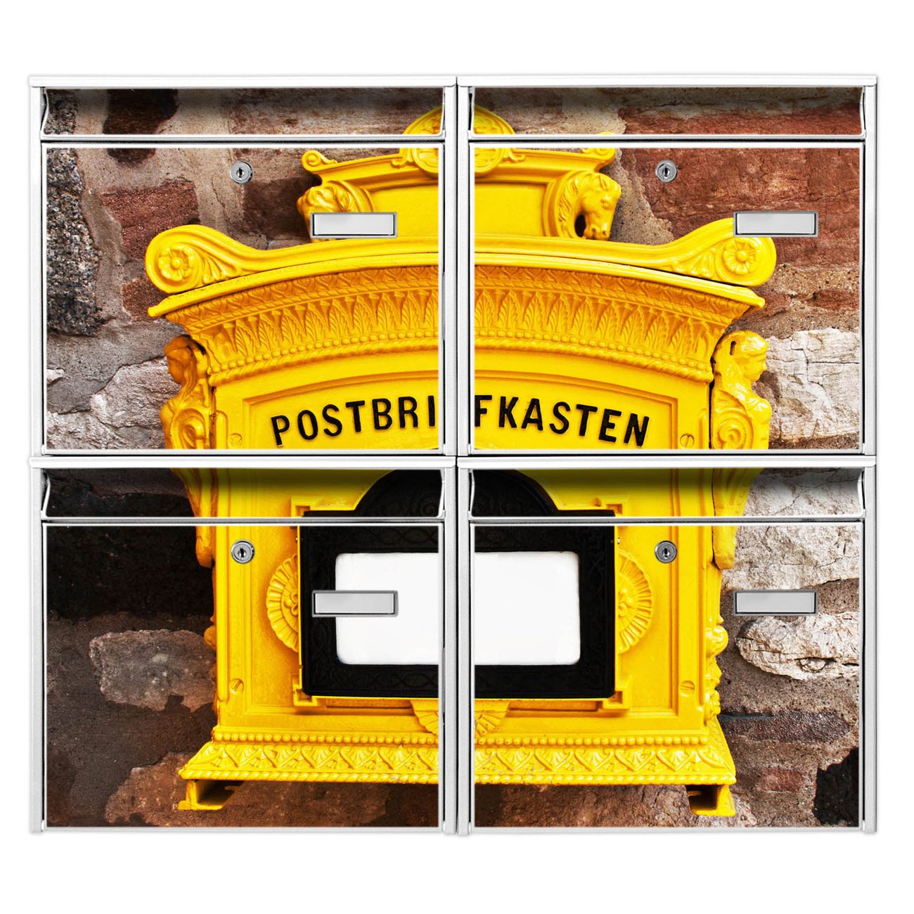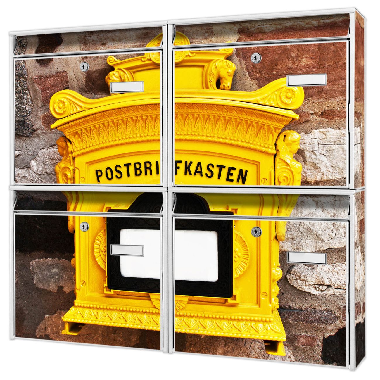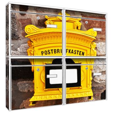FUNKTION: Die Burg-Wächter Briefkastenanlage mit Motiv Historischer Postkasten bietet Ihnen ausreichend Fassungsvermögen um auch A4 und C4 Sendungen zu empfangen. Das integrierte Namensschild lässt sich individuell beschriften. Wählen Sie aus den Grundfarben weiß, silber und schwarz. DESIGN: Die 4 Briefkästen haben ein ansprechendes und zeitloses Design, ohne dabei auf Funktionalität zu verzichten. Das Material ist sehr stabil, wetterfest und rostfrei. Durch das Motiv Historischer Postkasten werden die Postkästen zu einem Blickfang. DETAILS: Die Postkästen bestehen aus verzinktem Stahl der zusätzlich mit Klarlack versiegelt wurde. Die Kästen sind gesamt 64,5cm hoch, 72,5cm breit und 10cm tief. Das Motiv besteht aus einer wetter- und UV-festen Folie, die Ihren Briefkasten zusätzlich vor Kratzern schützt. Die Postkästen werden mit Montagematerial, je einem Namensschild und je zwei Schlüsseln geliefert. NUTZEN: Das Briefkastenset eignet sich für die Wandmontage, die Größe bietet genügend Platz für Sendungen aller Art. Das zeitlose Design sowie die stabile Bauart bieten Ihnen einen treuen Begleiter für Ihre Post. BANJADO:
