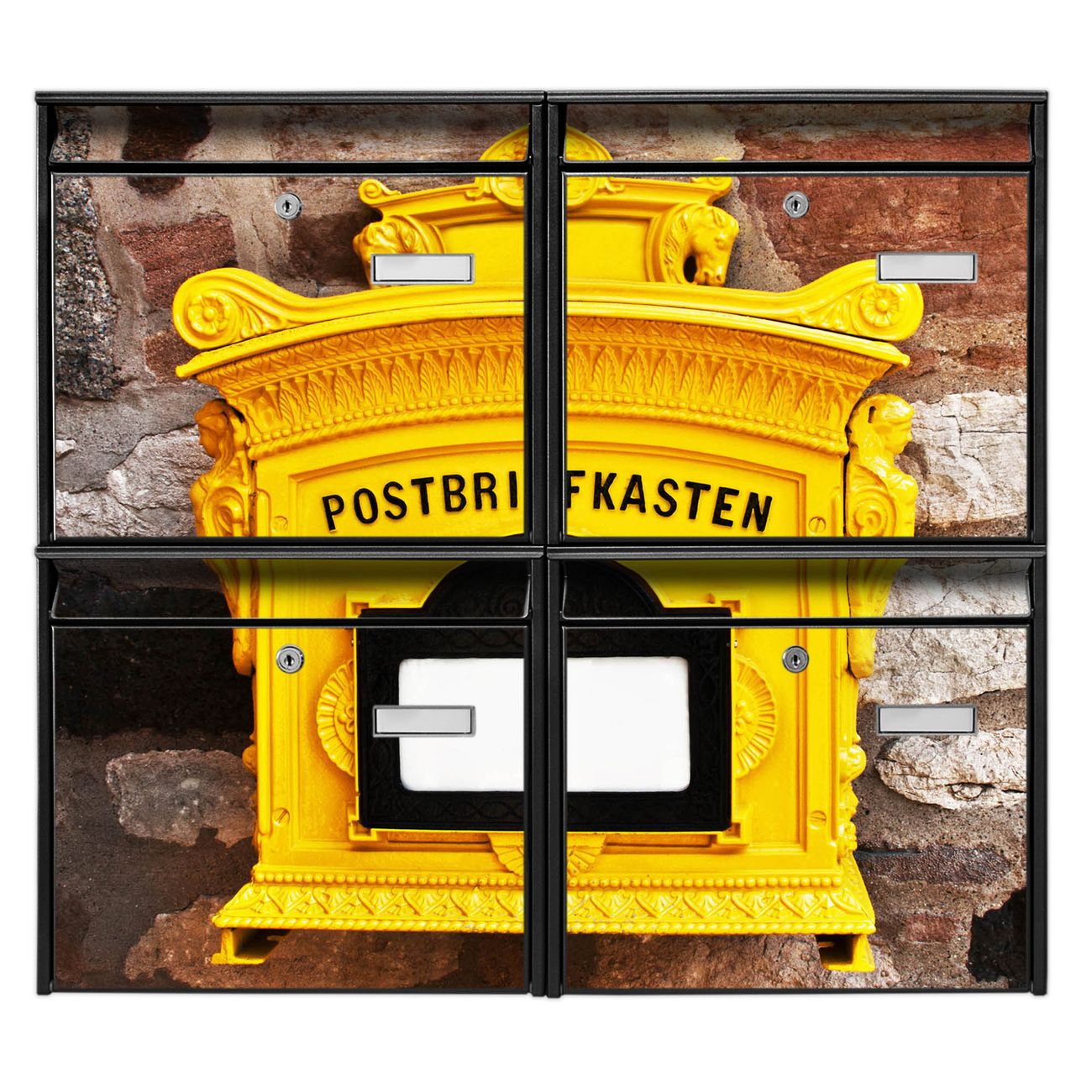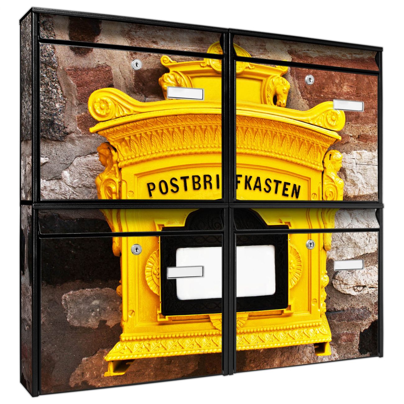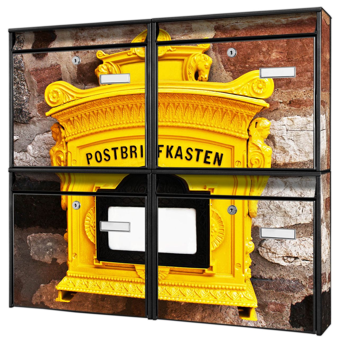 FUNKTION: Die Burg-Wächter Briefkastenanlage mit Motiv Historischer Postkasten bietet Ihnen ausreichend Fassungsvermögen um auch A4 und C4 Sendungen zu empfangen. Das integrierte Namensschild lässt sich individuell beschriften. Wählen Sie aus den Grundfarben weiß, silber und schwarz. DESIGN: Die 4 Briefkästen haben ein ansprechendes und zeitloses Design, ohne dabei auf Funktionalität zu verzichten. Das Material ist sehr stabil, wetterfest und rostfrei. Durch das Motiv Historischer Postkasten werden die Postkästen zu einem Blickfang. DETAILS: Die Postkästen bestehen aus verzinktem Stahl der zusätzlich mit Klarlack versiegelt wurde. Die Kästen sind gesamt 64,5cm hoch, 72,5cm breit und 10cm tief. Das Motiv besteht aus einer wetter- und UV-festen Folie, die Ihren Briefkasten zusätzlich vor Kratzern schützt. Die Postkästen werden mit Montagematerial, je einem Namensschild und je zwei Schlüsseln geliefert. NUTZEN: Das Briefkastenset eignet sich für die Wandmontage, die Größe bietet genügend Platz für Sendungen aller Art. Das zeitlose Design sowie die stabile Bauart bieten Ihnen einen treuen Begleiter für Ihre Post. BANJADO: