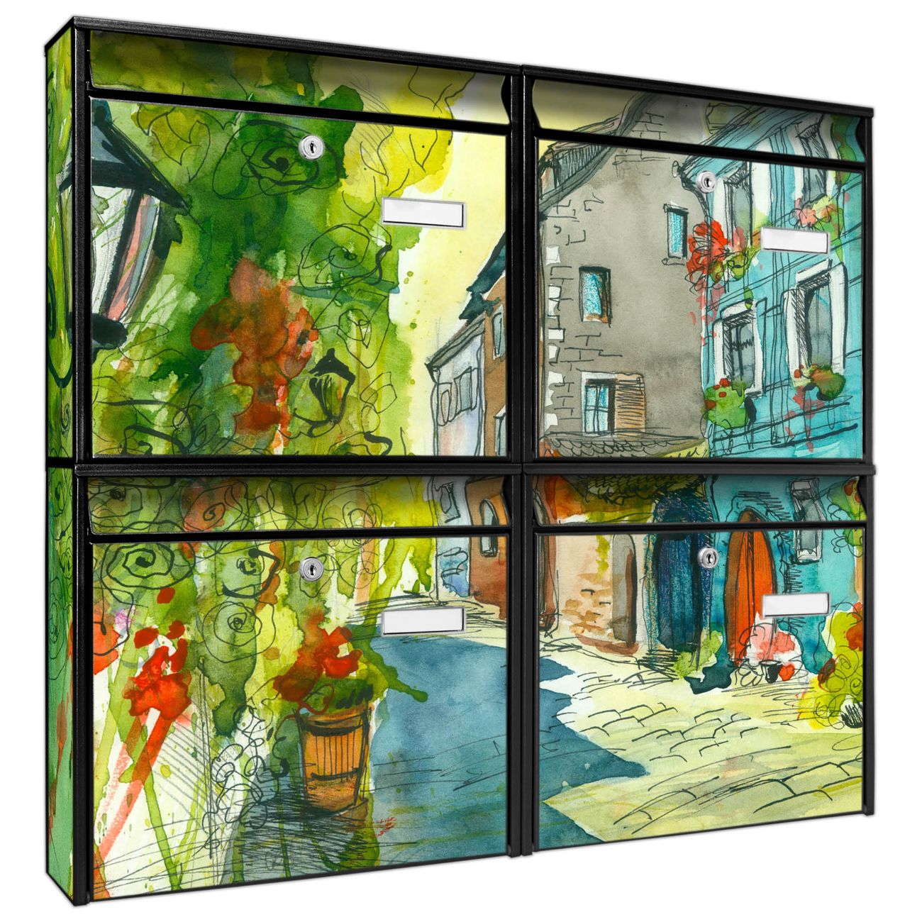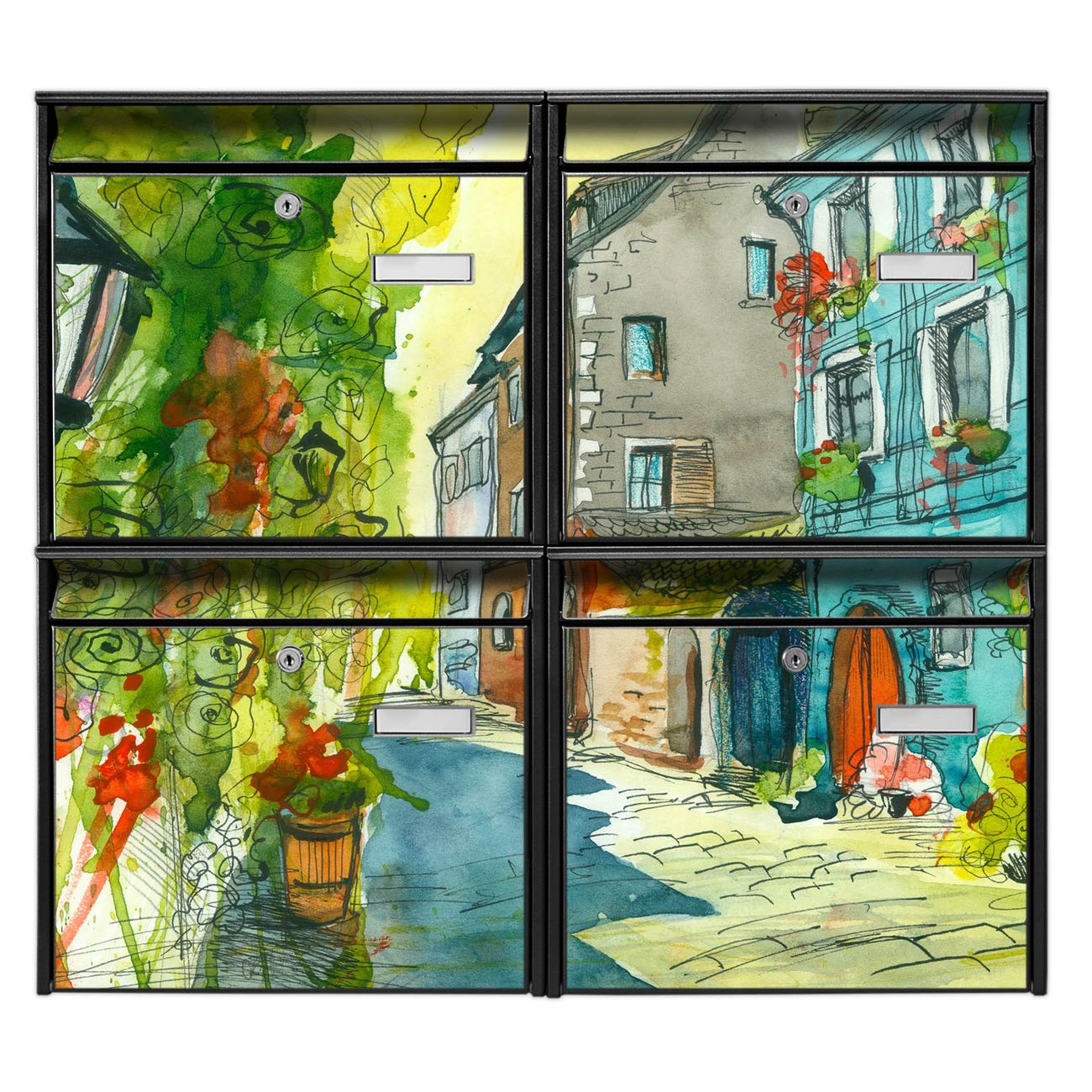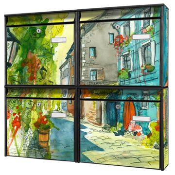 FUNKTION: Die Burg-Wächter Briefkastenanlage mit Motiv Historischer Stadtkern bietet Ihnen ausreichend Fassungsvermögen um auch A4 und C4 Sendungen zu empfangen. Das integrierte Namensschild lässt sich individuell beschriften. Wählen Sie aus den Grundfarben weiß, silber und schwarz. DESIGN: Die 4 Briefkästen haben ein ansprechendes und zeitloses Design, ohne dabei auf Funktionalität zu verzichten. Das Material ist sehr stabil, wetterfest und rostfrei. Durch das Motiv Historischer Stadtkern werden die Postkästen zu einem Blickfang. DETAILS: Die Postkästen bestehen aus verzinktem Stahl der zusätzlich mit Klarlack versiegelt wurde. Die Kästen sind gesamt 64,5cm hoch, 72,5cm breit und 10cm tief. Das Motiv besteht aus einer wetter- und UV-festen Folie, die Ihren Briefkasten zusätzlich vor Kratzern schützt. Die Postkästen werden mit Montagematerial, je einem Namensschild und je zwei Schlüsseln geliefert. NUTZEN: Das Briefkastenset eignet sich für die Wandmontage, die Größe bietet genügend Platz für Sendungen aller Art. Das zeitlose Design sowie die stabile Bauart bieten Ihnen einen treuen Begleiter für Ihre Post. BANJADO: