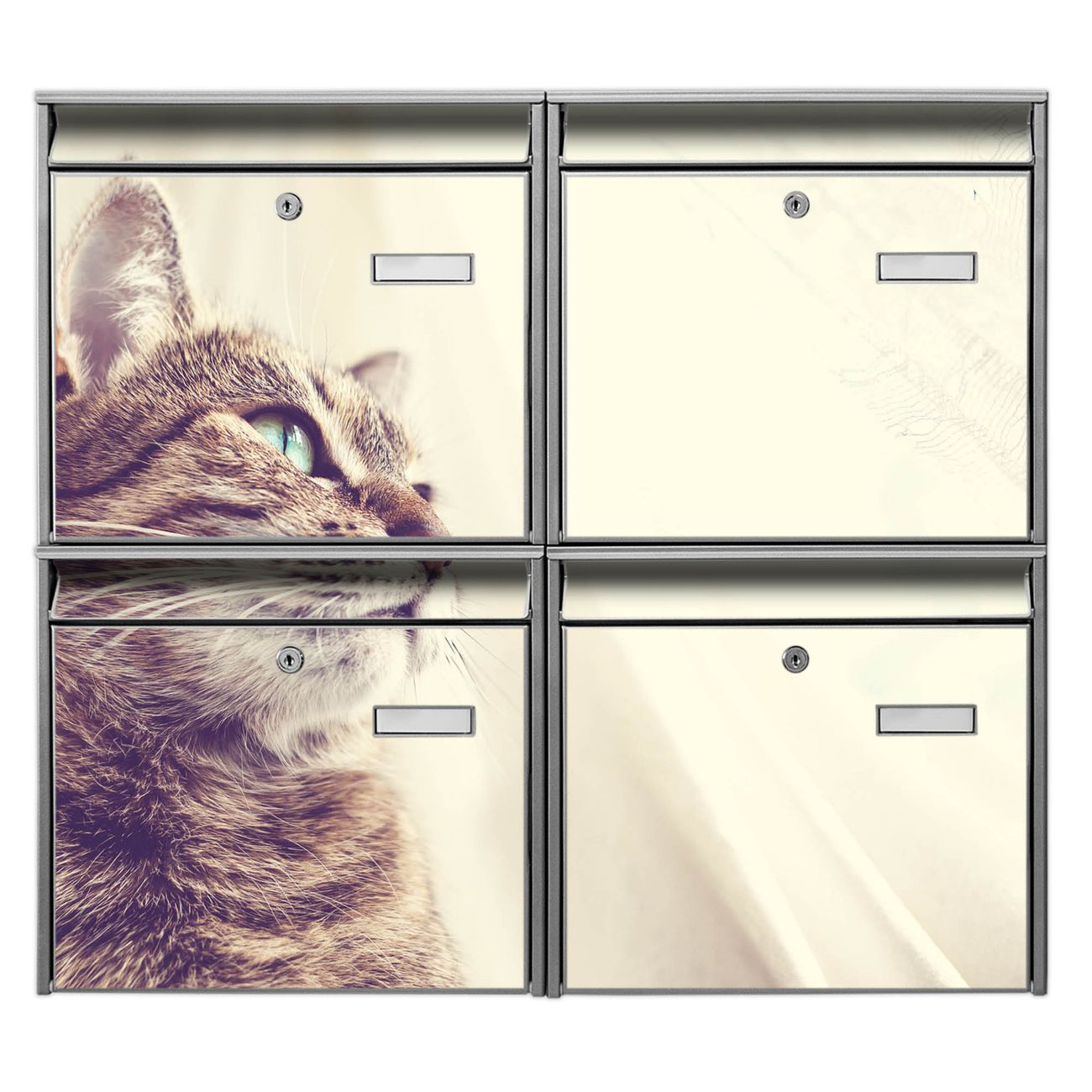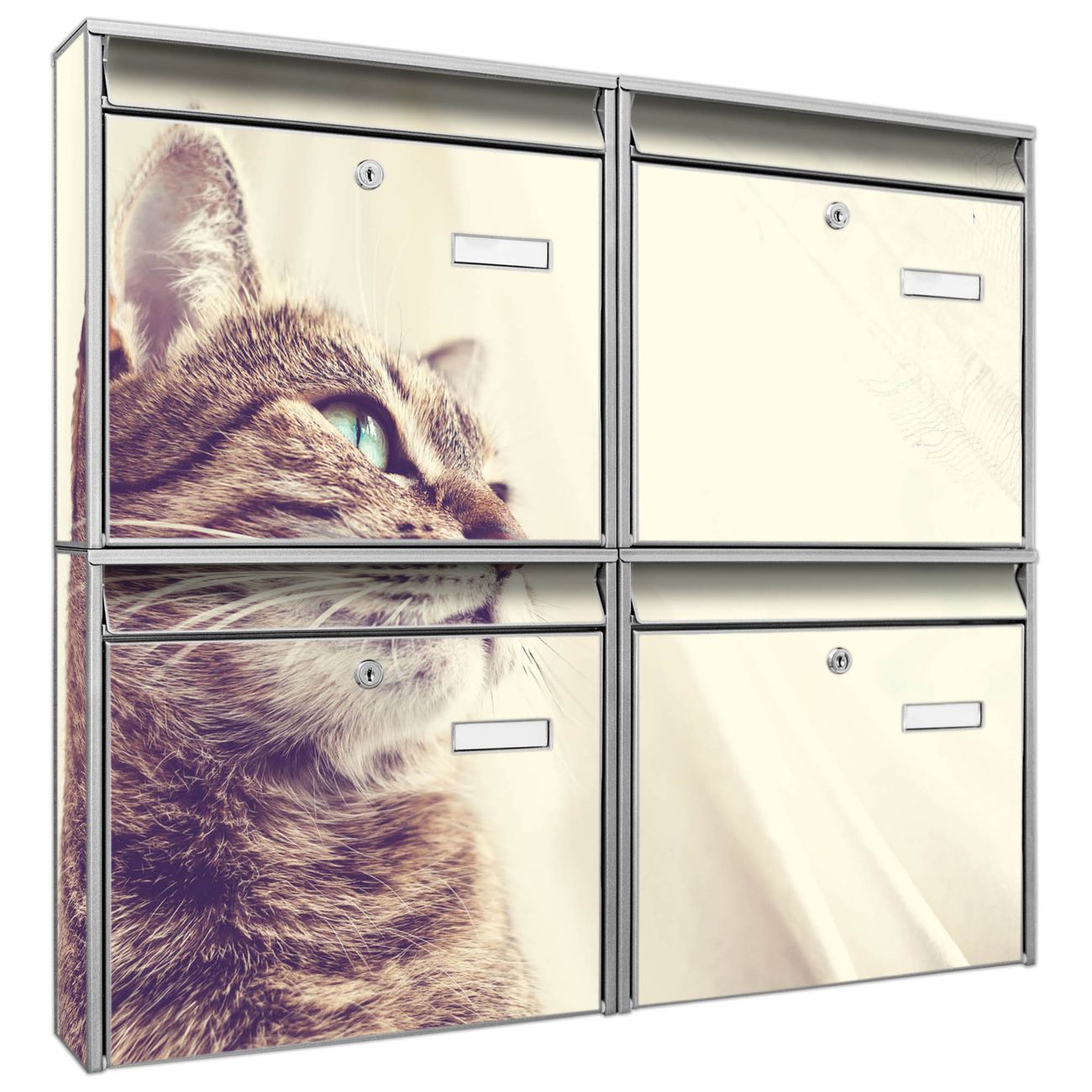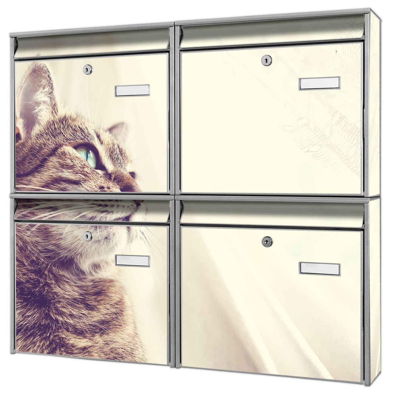 FUNKTION: Die Burg-Wächter Briefkastenanlage mit Motiv Holgerson bietet Ihnen ausreichend Fassungsvermögen um auch A4 und C4 Sendungen zu empfangen. Das integrierte Namensschild lässt sich individuell beschriften. Wählen Sie aus den Grundfarben weiß, silber und schwarz. DESIGN: Die 4 Briefkästen haben ein ansprechendes und zeitloses Design, ohne dabei auf Funktionalität zu verzichten. Das Material ist sehr stabil, wetterfest und rostfrei. Durch das Motiv Holgerson werden die Postkästen zu einem Blickfang. DETAILS: Die Postkästen bestehen aus verzinktem Stahl der zusätzlich mit Klarlack versiegelt wurde. Die Kästen sind gesamt 64,5cm hoch, 72,5cm breit und 10cm tief. Das Motiv besteht aus einer wetter- und UV-festen Folie, die Ihren Briefkasten zusätzlich vor Kratzern schützt. Die Postkästen werden mit Montagematerial, je einem Namensschild und je zwei Schlüsseln geliefert. NUTZEN: Das Briefkastenset eignet sich für die Wandmontage, die Größe bietet genügend Platz für Sendungen aller Art. Das zeitlose Design sowie die stabile Bauart bieten Ihnen einen treuen Begleiter für Ihre Post. BANJADO: