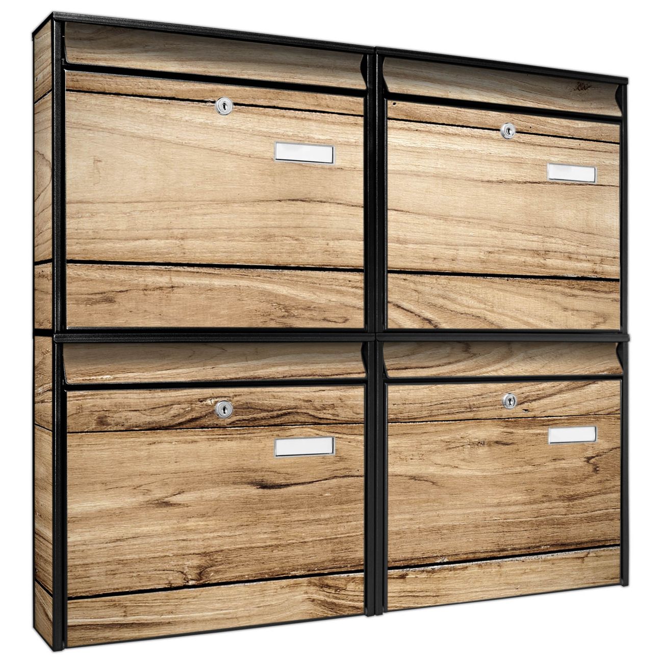 FUNKTION: Die Burg-Wächter Briefkastenanlage mit Motiv Holzplanken bietet Ihnen ausreichend Fassungsvermögen um auch A4 und C4 Sendungen zu empfangen. Das integrierte Namensschild lässt sich individuell beschriften. Wählen Sie aus den Grundfarben weiß, silber und schwarz. DESIGN: Die 4 Briefkästen haben ein ansprechendes und zeitloses Design, ohne dabei auf Funktionalität zu verzichten. Das Material ist sehr stabil, wetterfest und rostfrei. Durch das Motiv Holzplanken werden die Postkästen zu einem Blickfang. DETAILS: Die Postkästen bestehen aus verzinktem Stahl der zusätzlich mit Klarlack versiegelt wurde. Die Kästen sind gesamt 64,5cm hoch, 72,5cm breit und 10cm tief. Das Motiv besteht aus einer wetter- und UV-festen Folie, die Ihren Briefkasten zusätzlich vor Kratzern schützt. Die Postkästen werden mit Montagematerial, je einem Namensschild und je zwei Schlüsseln geliefert. NUTZEN: Das Briefkastenset eignet sich für die Wandmontage, die Größe bietet genügend Platz für Sendungen aller Art. Das zeitlose Design sowie die stabile Bauart bieten Ihnen einen treuen Begleiter für Ihre Post. BANJADO: