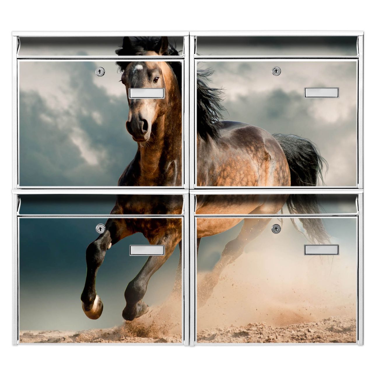 FUNKTION: Die Burg-Wächter Briefkastenanlage mit Motiv Ibrahim bietet Ihnen ausreichend Fassungsvermögen um auch A4 und C4 Sendungen zu empfangen. Das integrierte Namensschild lässt sich individuell beschriften. Wählen Sie aus den Grundfarben weiß, silber und schwarz. DESIGN: Die 4 Briefkästen haben ein ansprechendes und zeitloses Design, ohne dabei auf Funktionalität zu verzichten. Das Material ist sehr stabil, wetterfest und rostfrei. Durch das Motiv Ibrahim werden die Postkästen zu einem Blickfang. DETAILS: Die Postkästen bestehen aus verzinktem Stahl der zusätzlich mit Klarlack versiegelt wurde. Die Kästen sind gesamt 64,5cm hoch, 72,5cm breit und 10cm tief. Das Motiv besteht aus einer wetter- und UV-festen Folie, die Ihren Briefkasten zusätzlich vor Kratzern schützt. Die Postkästen werden mit Montagematerial, je einem Namensschild und je zwei Schlüsseln geliefert. NUTZEN: Das Briefkastenset eignet sich für die Wandmontage, die Größe bietet genügend Platz für Sendungen aller Art. Das zeitlose Design sowie die stabile Bauart bieten Ihnen einen treuen Begleiter für Ihre Post. BANJADO:
