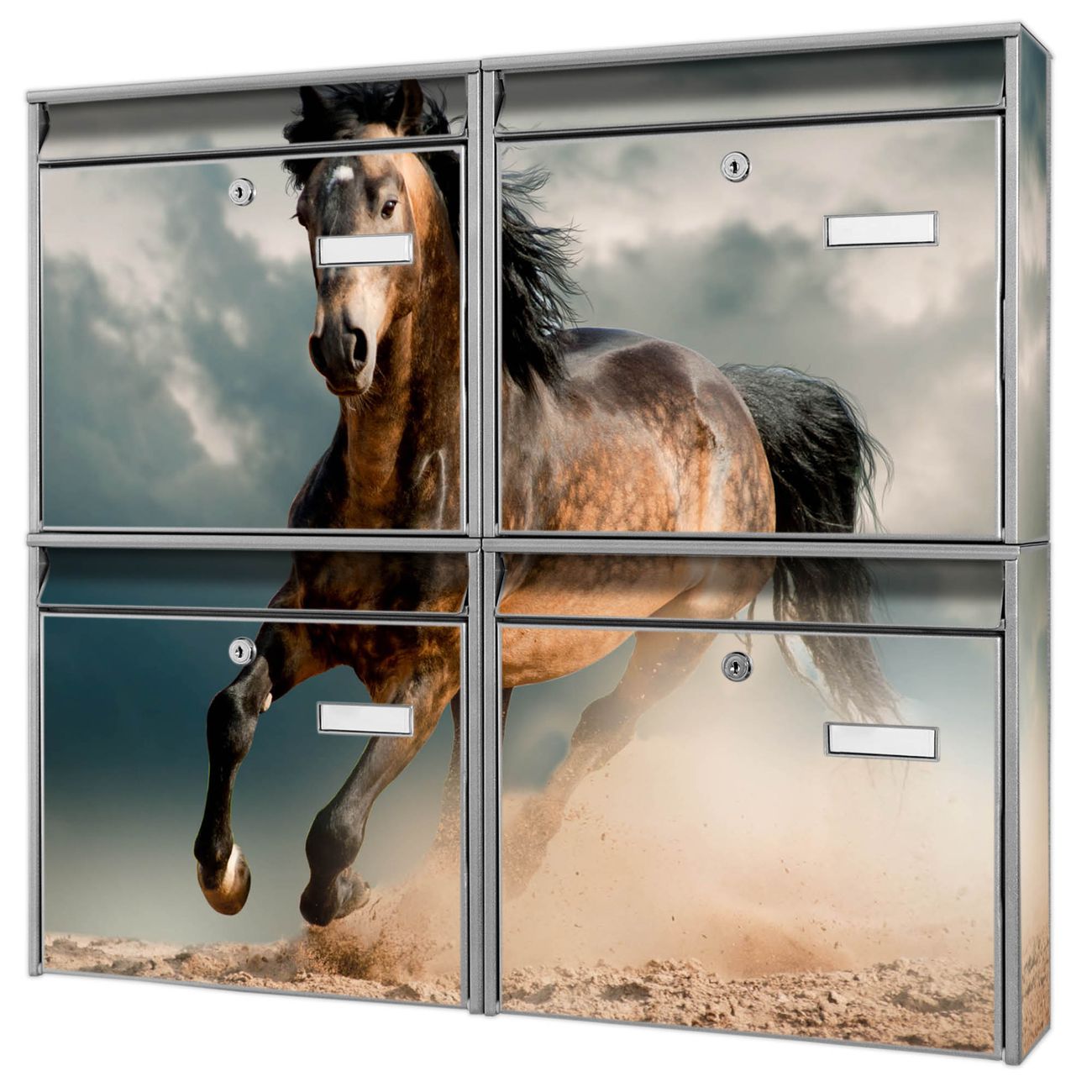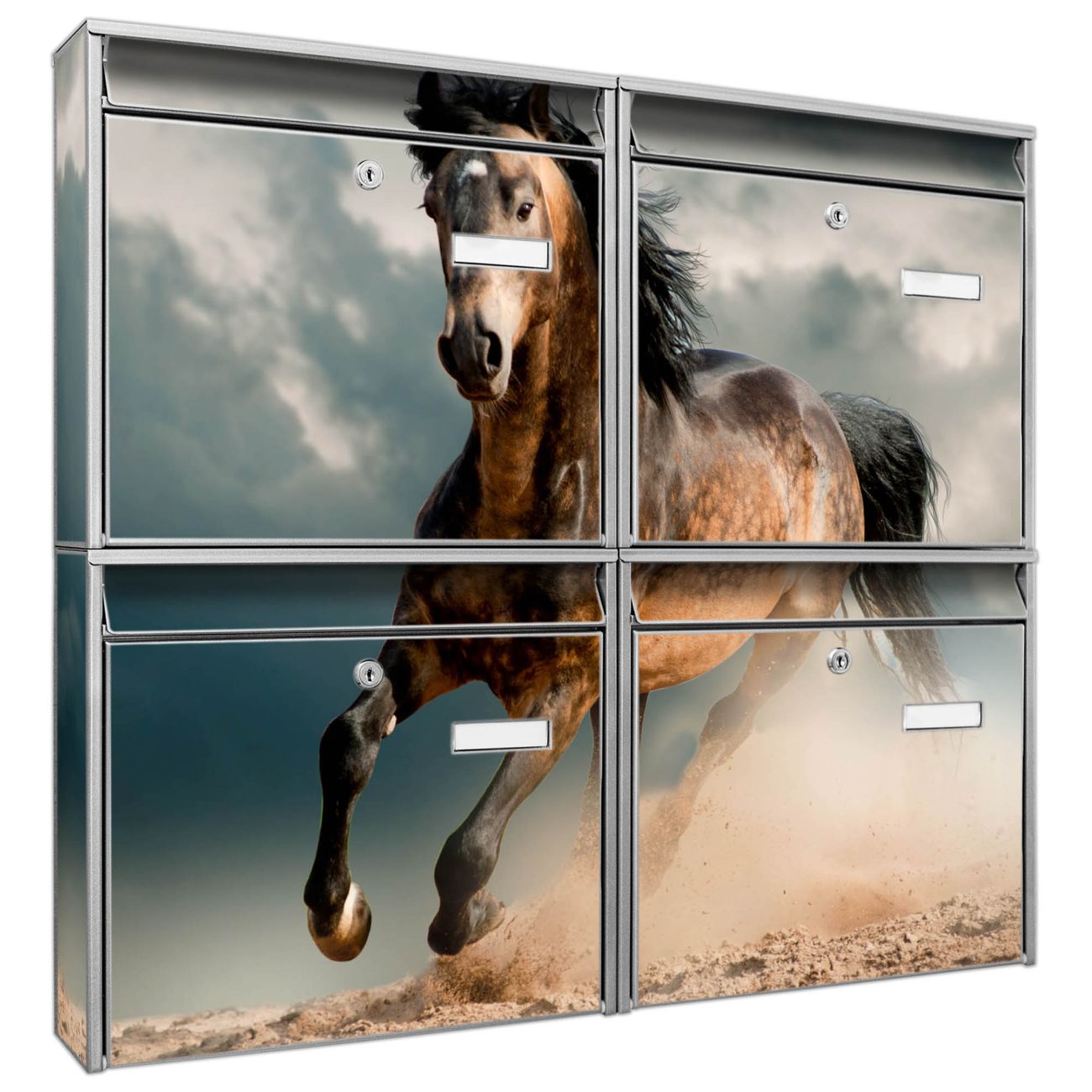 FUNKTION: Die Burg-Wächter Briefkastenanlage mit Motiv Ibrahim bietet Ihnen ausreichend Fassungsvermögen um auch A4 und C4 Sendungen zu empfangen. Das integrierte Namensschild lässt sich individuell beschriften. Wählen Sie aus den Grundfarben weiß, silber und schwarz. DESIGN: Die 4 Briefkästen haben ein ansprechendes und zeitloses Design, ohne dabei auf Funktionalität zu verzichten. Das Material ist sehr stabil, wetterfest und rostfrei. Durch das Motiv Ibrahim werden die Postkästen zu einem Blickfang. DETAILS: Die Postkästen bestehen aus verzinktem Stahl der zusätzlich mit Klarlack versiegelt wurde. Die Kästen sind gesamt 64,5cm hoch, 72,5cm breit und 10cm tief. Das Motiv besteht aus einer wetter- und UV-festen Folie, die Ihren Briefkasten zusätzlich vor Kratzern schützt. Die Postkästen werden mit Montagematerial, je einem Namensschild und je zwei Schlüsseln geliefert. NUTZEN: Das Briefkastenset eignet sich für die Wandmontage, die Größe bietet genügend Platz für Sendungen aller Art. Das zeitlose Design sowie die stabile Bauart bieten Ihnen einen treuen Begleiter für Ihre Post. BANJADO: