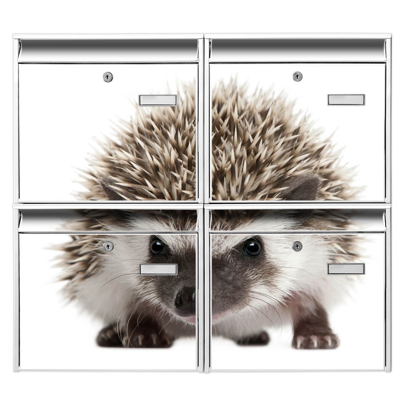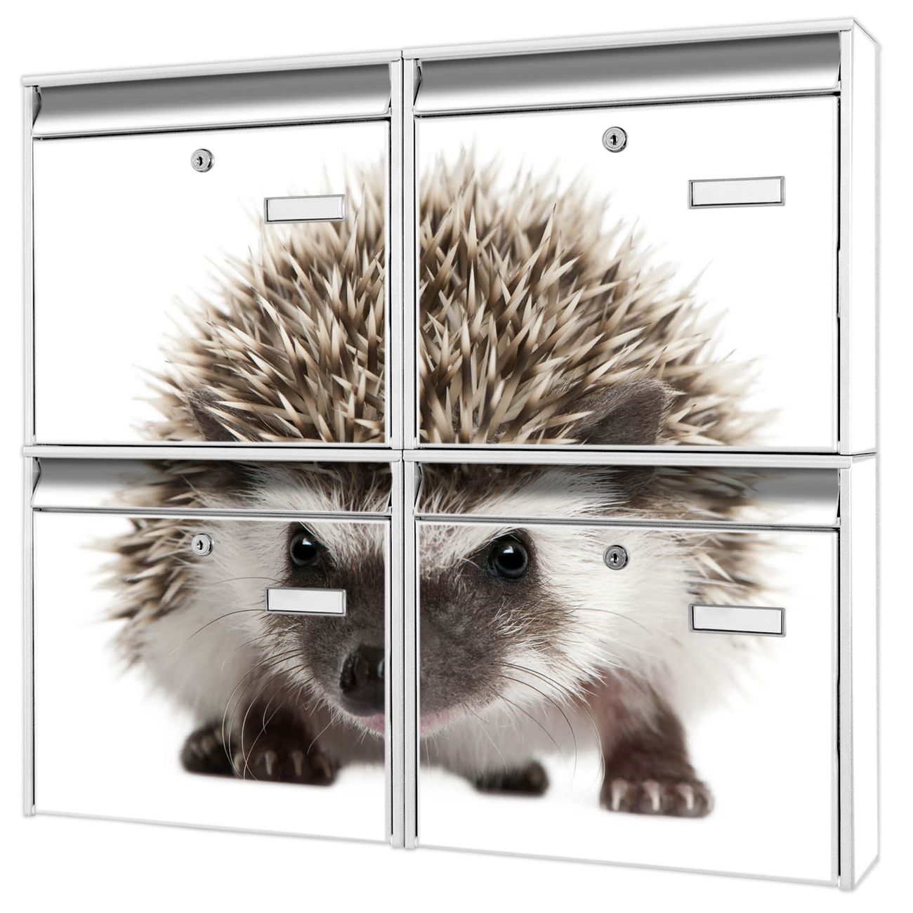 FUNKTION: Die Burg-Wächter Briefkastenanlage mit Motiv Igel bietet Ihnen ausreichend Fassungsvermögen um auch A4 und C4 Sendungen zu empfangen. Das integrierte Namensschild lässt sich individuell beschriften. Wählen Sie aus den Grundfarben weiß, silber und schwarz. DESIGN: Die 4 Briefkästen haben ein ansprechendes und zeitloses Design, ohne dabei auf Funktionalität zu verzichten. Das Material ist sehr stabil, wetterfest und rostfrei. Durch das Motiv Igel werden die Postkästen zu einem Blickfang. DETAILS: Die Postkästen bestehen aus verzinktem Stahl der zusätzlich mit Klarlack versiegelt wurde. Die Kästen sind gesamt 64,5cm hoch, 72,5cm breit und 10cm tief. Das Motiv besteht aus einer wetter- und UV-festen Folie, die Ihren Briefkasten zusätzlich vor Kratzern schützt. Die Postkästen werden mit Montagematerial, je einem Namensschild und je zwei Schlüsseln geliefert. NUTZEN: Das Briefkastenset eignet sich für die Wandmontage, die Größe bietet genügend Platz für Sendungen aller Art. Das zeitlose Design sowie die stabile Bauart bieten Ihnen einen treuen Begleiter für Ihre Post. BANJADO: