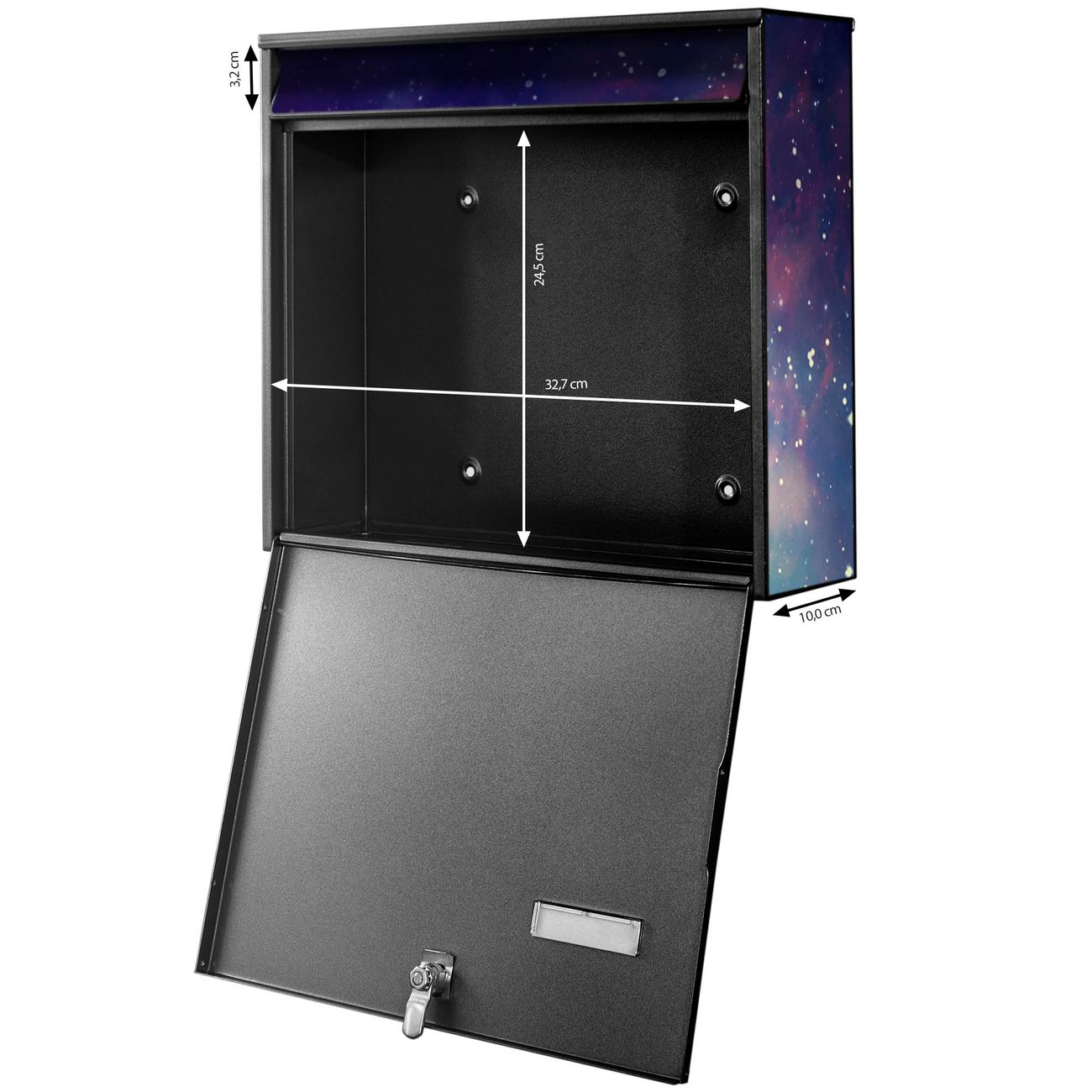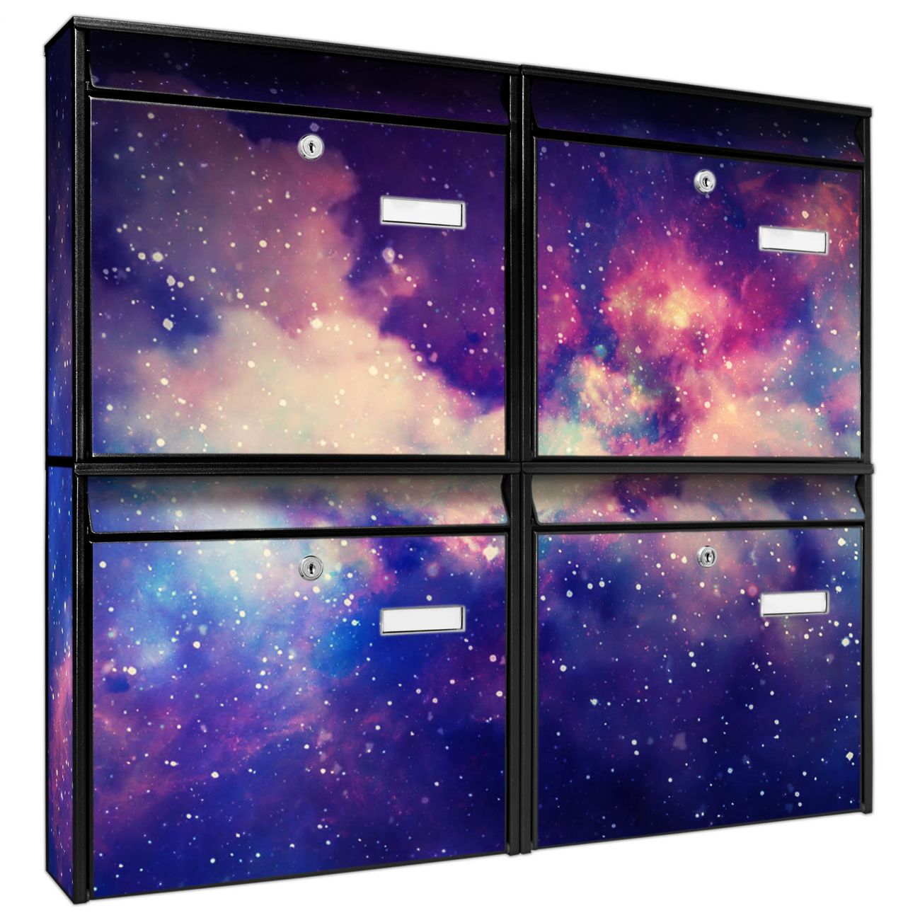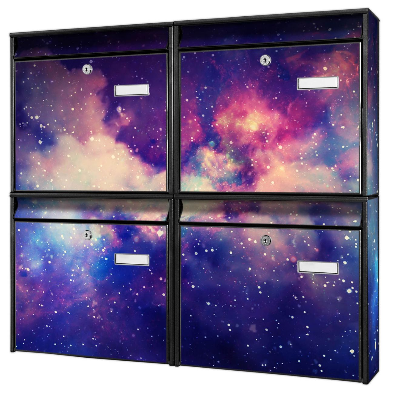 FUNKTION: Die Burg-Wächter Briefkastenanlage mit Motiv Im Weltall 1 bietet Ihnen ausreichend Fassungsvermögen um auch A4 und C4 Sendungen zu empfangen. Das integrierte Namensschild lässt sich individuell beschriften. Wählen Sie aus den Grundfarben weiß, silber und schwarz. DESIGN: Die 4 Briefkästen haben ein ansprechendes und zeitloses Design, ohne dabei auf Funktionalität zu verzichten. Das Material ist sehr stabil, wetterfest und rostfrei. Durch das Motiv Im Weltall 1 werden die Postkästen zu einem Blickfang. DETAILS: Die Postkästen bestehen aus verzinktem Stahl der zusätzlich mit Klarlack versiegelt wurde. Die Kästen sind gesamt 64,5cm hoch, 72,5cm breit und 10cm tief. Das Motiv besteht aus einer wetter- und UV-festen Folie, die Ihren Briefkasten zusätzlich vor Kratzern schützt. Die Postkästen werden mit Montagematerial, je einem Namensschild und je zwei Schlüsseln geliefert. NUTZEN: Das Briefkastenset eignet sich für die Wandmontage, die Größe bietet genügend Platz für Sendungen aller Art. Das zeitlose Design sowie die stabile Bauart bieten Ihnen einen treuen Begleiter für Ihre Post. BANJADO: