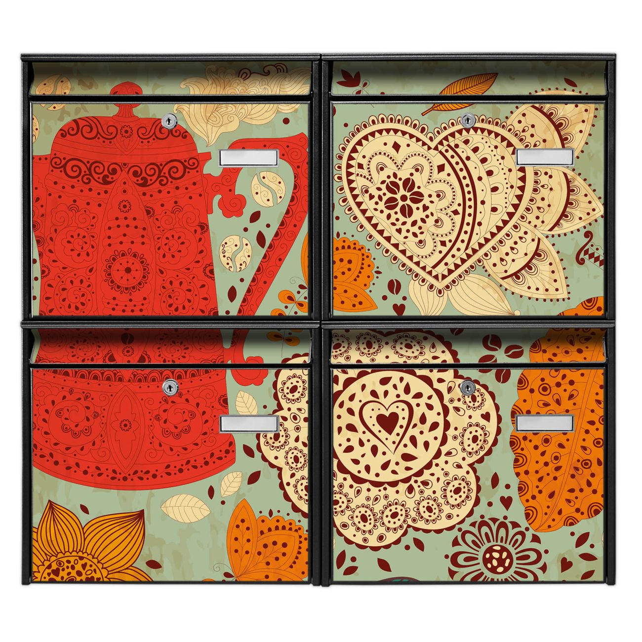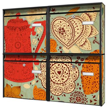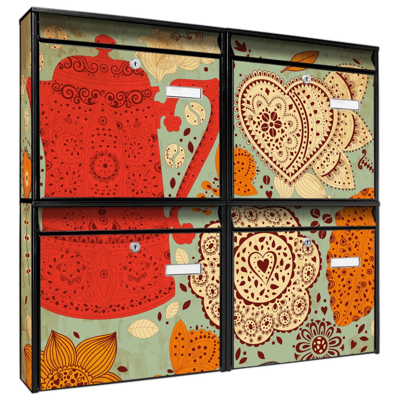 FUNKTION: Die Burg-Wächter Briefkastenanlage mit Motiv Indischer Kaffee bietet Ihnen ausreichend Fassungsvermögen um auch A4 und C4 Sendungen zu empfangen. Das integrierte Namensschild lässt sich individuell beschriften. Wählen Sie aus den Grundfarben weiß, silber und schwarz. DESIGN: Die 4 Briefkästen haben ein ansprechendes und zeitloses Design, ohne dabei auf Funktionalität zu verzichten. Das Material ist sehr stabil, wetterfest und rostfrei. Durch das Motiv Indischer Kaffee werden die Postkästen zu einem Blickfang. DETAILS: Die Postkästen bestehen aus verzinktem Stahl der zusätzlich mit Klarlack versiegelt wurde. Die Kästen sind gesamt 64,5cm hoch, 72,5cm breit und 10cm tief. Das Motiv besteht aus einer wetter- und UV-festen Folie, die Ihren Briefkasten zusätzlich vor Kratzern schützt. Die Postkästen werden mit Montagematerial, je einem Namensschild und je zwei Schlüsseln geliefert. NUTZEN: Das Briefkastenset eignet sich für die Wandmontage, die Größe bietet genügend Platz für Sendungen aller Art. Das zeitlose Design sowie die stabile Bauart bieten Ihnen einen treuen Begleiter für Ihre Post. BANJADO: