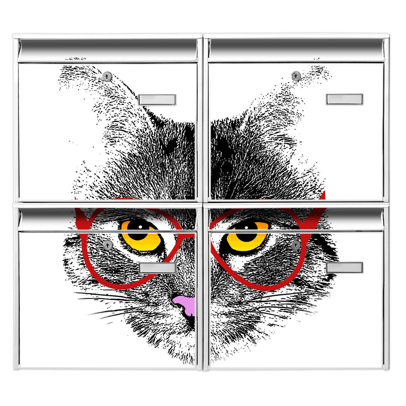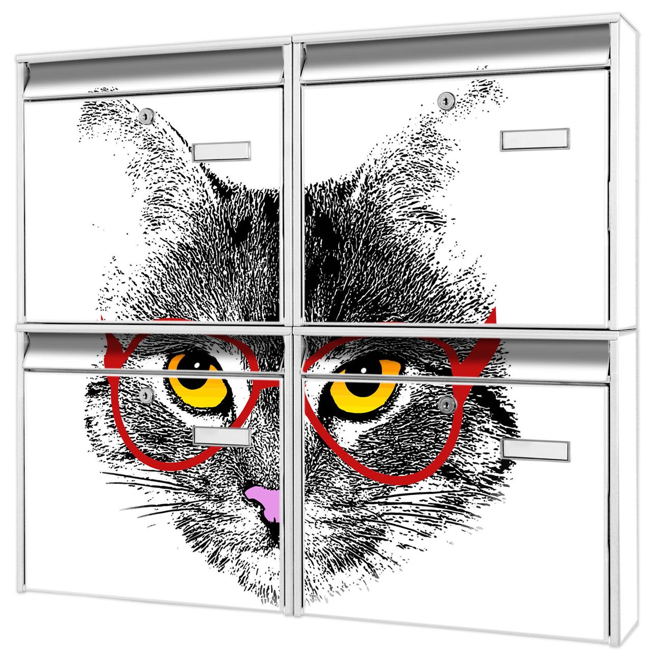 FUNKTION: Die Burg-Wächter Briefkastenanlage mit Motiv Intellicat bietet Ihnen ausreichend Fassungsvermögen um auch A4 und C4 Sendungen zu empfangen. Das integrierte Namensschild lässt sich individuell beschriften. Wählen Sie aus den Grundfarben weiß, silber und schwarz. DESIGN: Die 4 Briefkästen haben ein ansprechendes und zeitloses Design, ohne dabei auf Funktionalität zu verzichten. Das Material ist sehr stabil, wetterfest und rostfrei. Durch das Motiv Intellicat werden die Postkästen zu einem Blickfang. DETAILS: Die Postkästen bestehen aus verzinktem Stahl der zusätzlich mit Klarlack versiegelt wurde. Die Kästen sind gesamt 64,5cm hoch, 72,5cm breit und 10cm tief. Das Motiv besteht aus einer wetter- und UV-festen Folie, die Ihren Briefkasten zusätzlich vor Kratzern schützt. Die Postkästen werden mit Montagematerial, je einem Namensschild und je zwei Schlüsseln geliefert. NUTZEN: Das Briefkastenset eignet sich für die Wandmontage, die Größe bietet genügend Platz für Sendungen aller Art. Das zeitlose Design sowie die stabile Bauart bieten Ihnen einen treuen Begleiter für Ihre Post. BANJADO: