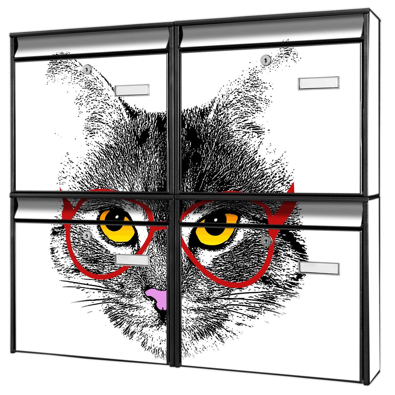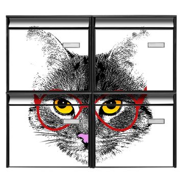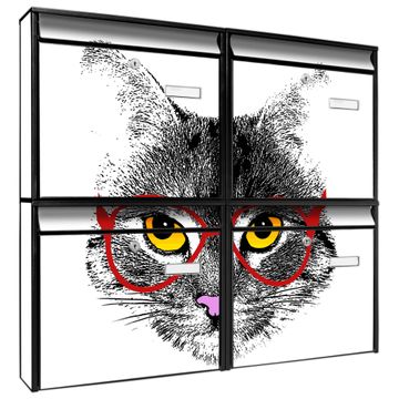 FUNKTION: Die Burg-Wächter Briefkastenanlage mit Motiv Intellicat bietet Ihnen ausreichend Fassungsvermögen um auch A4 und C4 Sendungen zu empfangen. Das integrierte Namensschild lässt sich individuell beschriften. Wählen Sie aus den Grundfarben weiß, silber und schwarz. DESIGN: Die 4 Briefkästen haben ein ansprechendes und zeitloses Design, ohne dabei auf Funktionalität zu verzichten. Das Material ist sehr stabil, wetterfest und rostfrei. Durch das Motiv Intellicat werden die Postkästen zu einem Blickfang. DETAILS: Die Postkästen bestehen aus verzinktem Stahl der zusätzlich mit Klarlack versiegelt wurde. Die Kästen sind gesamt 64,5cm hoch, 72,5cm breit und 10cm tief. Das Motiv besteht aus einer wetter- und UV-festen Folie, die Ihren Briefkasten zusätzlich vor Kratzern schützt. Die Postkästen werden mit Montagematerial, je einem Namensschild und je zwei Schlüsseln geliefert. NUTZEN: Das Briefkastenset eignet sich für die Wandmontage, die Größe bietet genügend Platz für Sendungen aller Art. Das zeitlose Design sowie die stabile Bauart bieten Ihnen einen treuen Begleiter für Ihre Post. BANJADO: