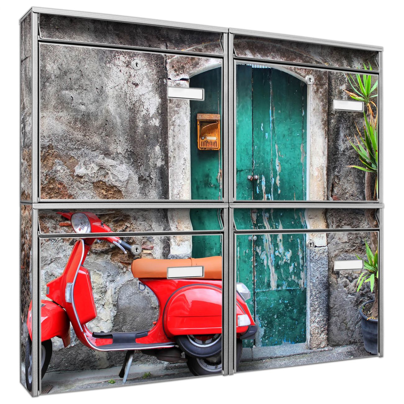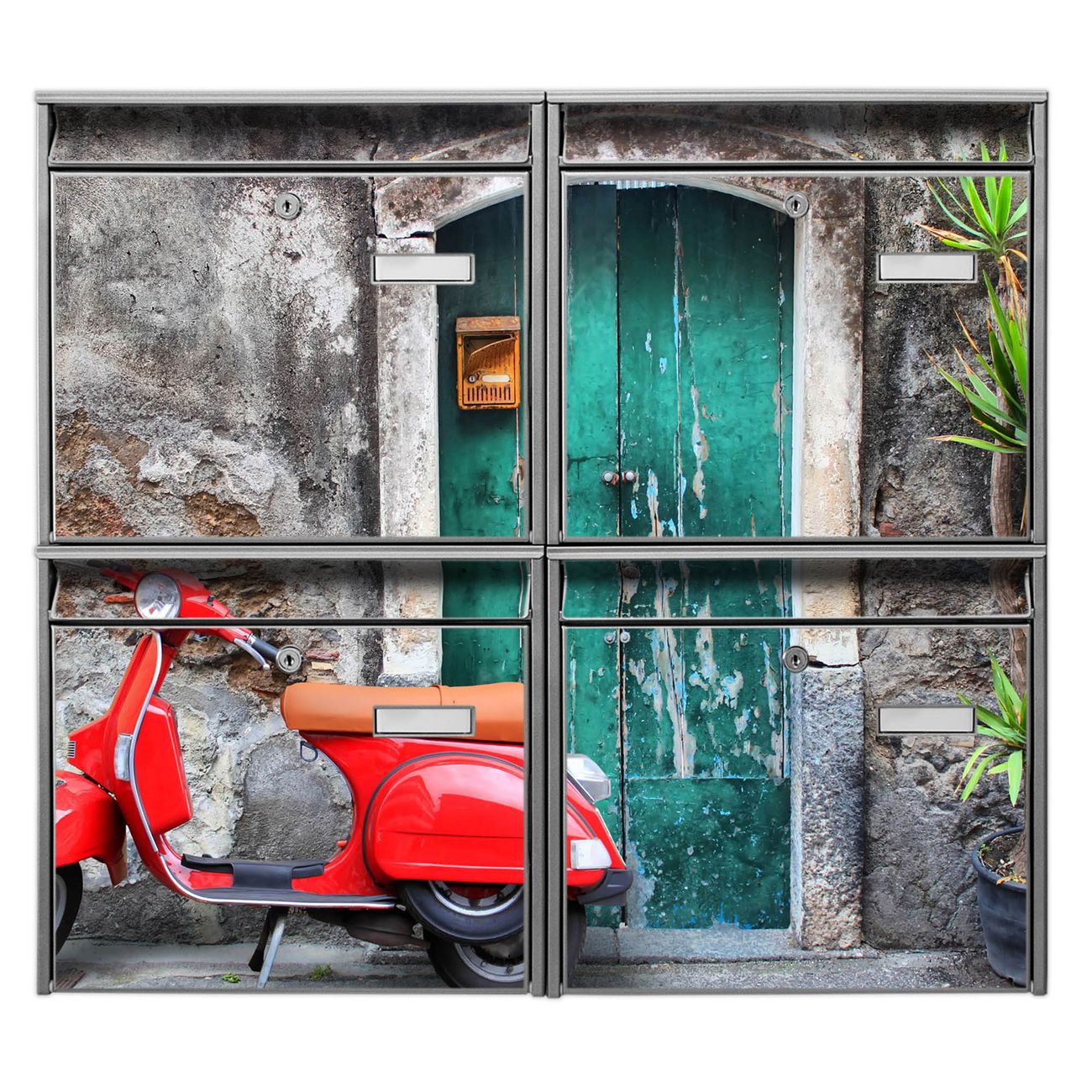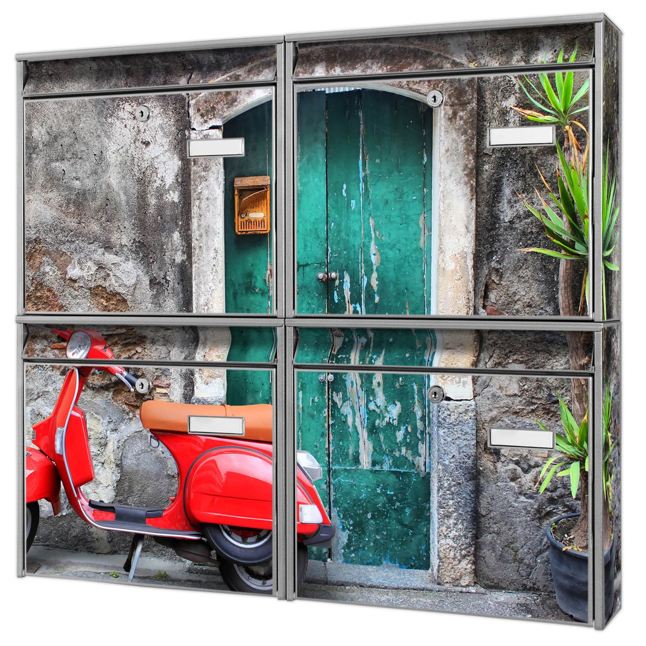 FUNKTION: Die Burg-Wächter Briefkastenanlage mit Motiv Italienischer Roller bietet Ihnen ausreichend Fassungsvermögen um auch A4 und C4 Sendungen zu empfangen. Das integrierte Namensschild lässt sich individuell beschriften. Wählen Sie aus den Grundfarben weiß, silber und schwarz. DESIGN: Die 4 Briefkästen haben ein ansprechendes und zeitloses Design, ohne dabei auf Funktionalität zu verzichten. Das Material ist sehr stabil, wetterfest und rostfrei. Durch das Motiv Italienischer Roller werden die Postkästen zu einem Blickfang. DETAILS: Die Postkästen bestehen aus verzinktem Stahl der zusätzlich mit Klarlack versiegelt wurde. Die Kästen sind gesamt 64,5cm hoch, 72,5cm breit und 10cm tief. Das Motiv besteht aus einer wetter- und UV-festen Folie, die Ihren Briefkasten zusätzlich vor Kratzern schützt. Die Postkästen werden mit Montagematerial, je einem Namensschild und je zwei Schlüsseln geliefert. NUTZEN: Das Briefkastenset eignet sich für die Wandmontage, die Größe bietet genügend Platz für Sendungen aller Art. Das zeitlose Design sowie die stabile Bauart bieten Ihnen einen treuen Begleiter für Ihre Post. BANJADO: