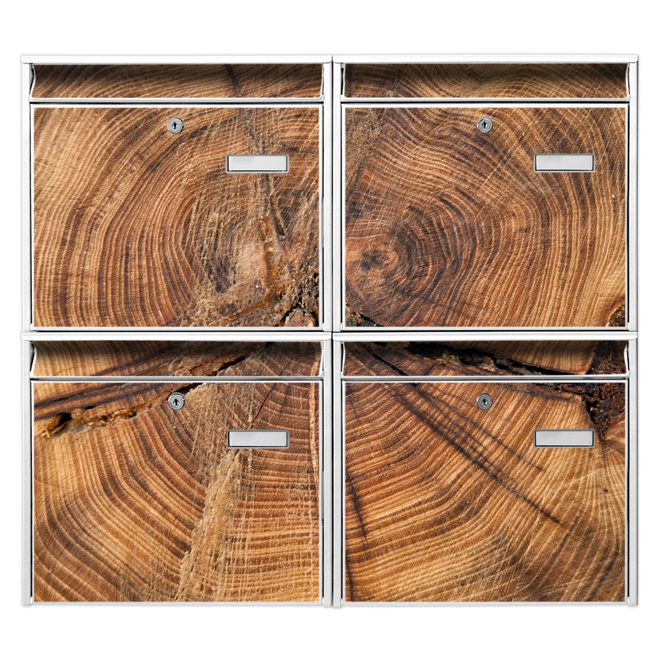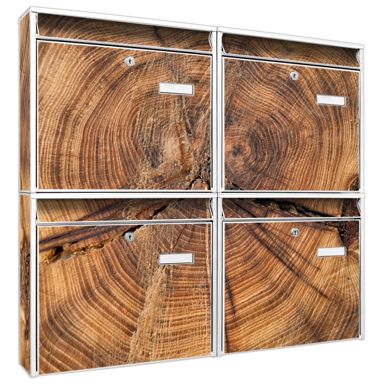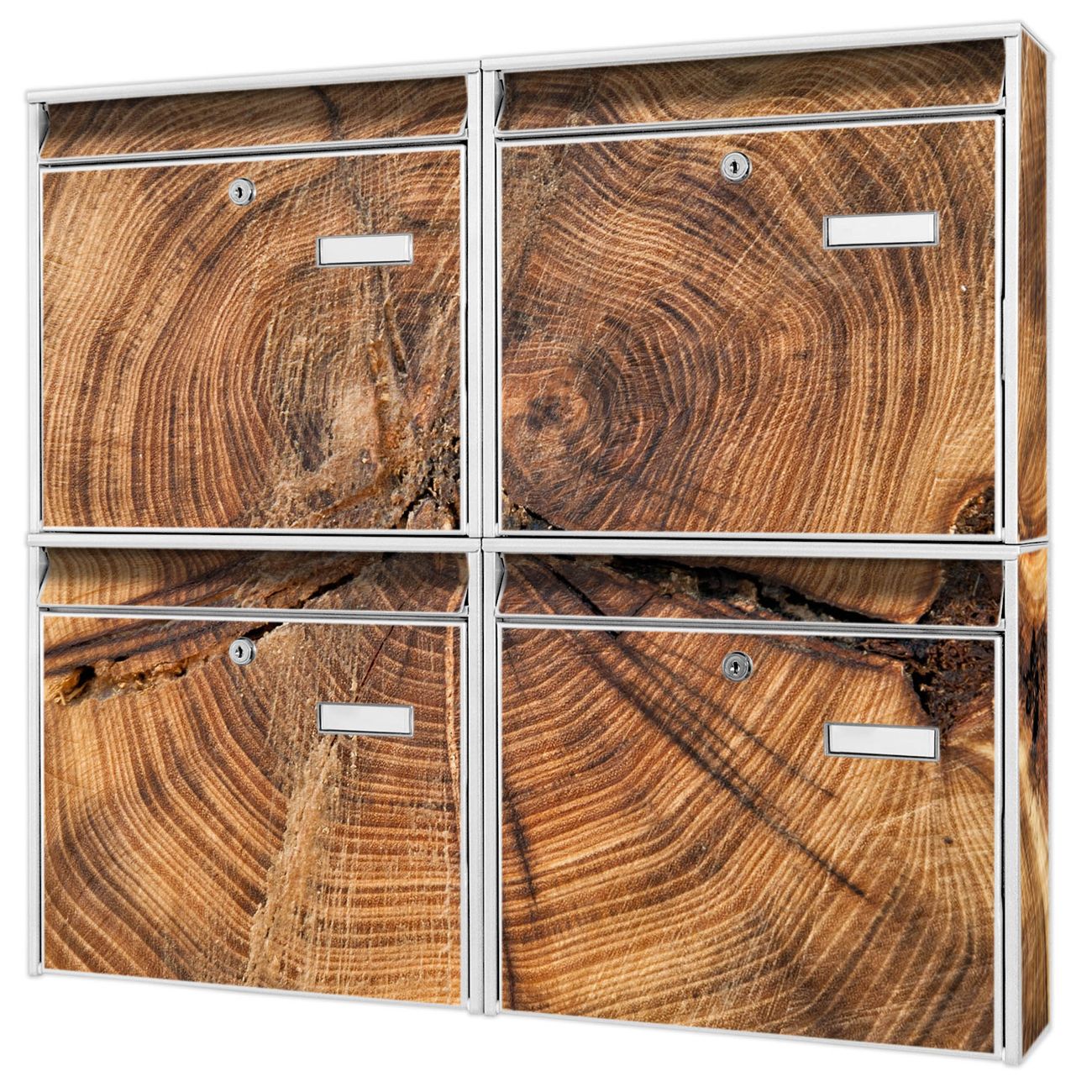 FUNKTION: Die Burg-Wächter Briefkastenanlage mit Motiv Jahresringe bietet Ihnen ausreichend Fassungsvermögen um auch A4 und C4 Sendungen zu empfangen. Das integrierte Namensschild lässt sich individuell beschriften. Wählen Sie aus den Grundfarben weiß, silber und schwarz. DESIGN: Die 4 Briefkästen haben ein ansprechendes und zeitloses Design, ohne dabei auf Funktionalität zu verzichten. Das Material ist sehr stabil, wetterfest und rostfrei. Durch das Motiv Jahresringe werden die Postkästen zu einem Blickfang. DETAILS: Die Postkästen bestehen aus verzinktem Stahl der zusätzlich mit Klarlack versiegelt wurde. Die Kästen sind gesamt 64,5cm hoch, 72,5cm breit und 10cm tief. Das Motiv besteht aus einer wetter- und UV-festen Folie, die Ihren Briefkasten zusätzlich vor Kratzern schützt. Die Postkästen werden mit Montagematerial, je einem Namensschild und je zwei Schlüsseln geliefert. NUTZEN: Das Briefkastenset eignet sich für die Wandmontage, die Größe bietet genügend Platz für Sendungen aller Art. Das zeitlose Design sowie die stabile Bauart bieten Ihnen einen treuen Begleiter für Ihre Post. BANJADO: