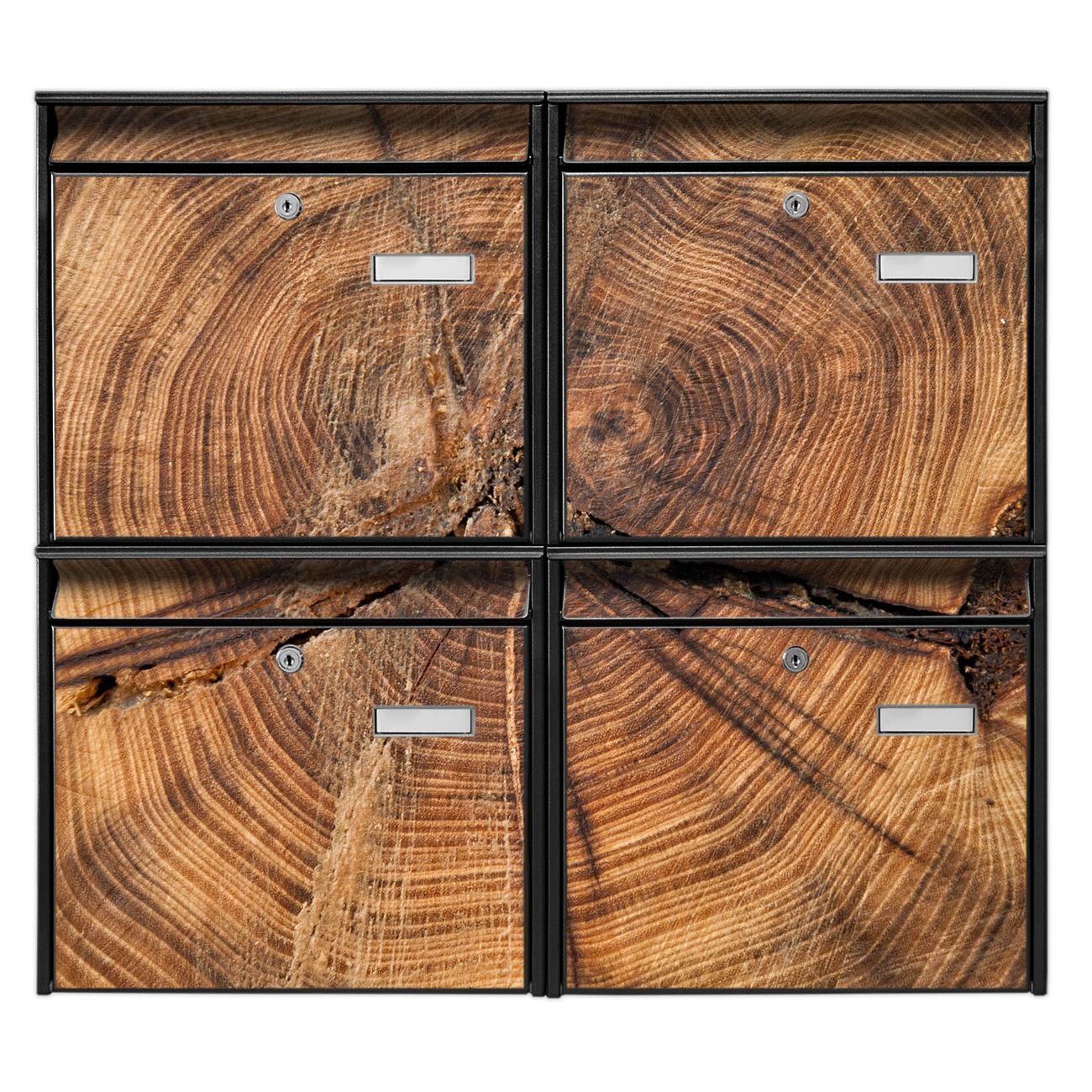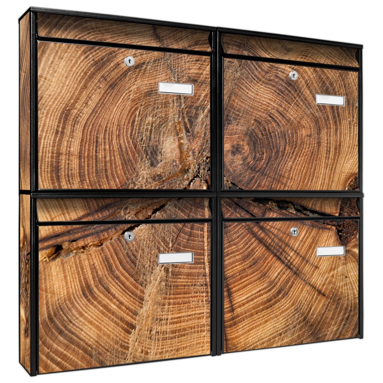 FUNKTION: Die Burg-Wächter Briefkastenanlage mit Motiv Jahresringe bietet Ihnen ausreichend Fassungsvermögen um auch A4 und C4 Sendungen zu empfangen. Das integrierte Namensschild lässt sich individuell beschriften. Wählen Sie aus den Grundfarben weiß, silber und schwarz. DESIGN: Die 4 Briefkästen haben ein ansprechendes und zeitloses Design, ohne dabei auf Funktionalität zu verzichten. Das Material ist sehr stabil, wetterfest und rostfrei. Durch das Motiv Jahresringe werden die Postkästen zu einem Blickfang. DETAILS: Die Postkästen bestehen aus verzinktem Stahl der zusätzlich mit Klarlack versiegelt wurde. Die Kästen sind gesamt 64,5cm hoch, 72,5cm breit und 10cm tief. Das Motiv besteht aus einer wetter- und UV-festen Folie, die Ihren Briefkasten zusätzlich vor Kratzern schützt. Die Postkästen werden mit Montagematerial, je einem Namensschild und je zwei Schlüsseln geliefert. NUTZEN: Das Briefkastenset eignet sich für die Wandmontage, die Größe bietet genügend Platz für Sendungen aller Art. Das zeitlose Design sowie die stabile Bauart bieten Ihnen einen treuen Begleiter für Ihre Post. BANJADO: