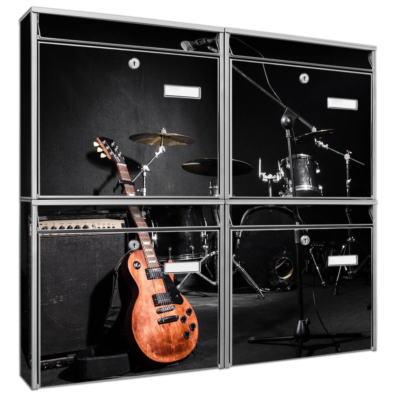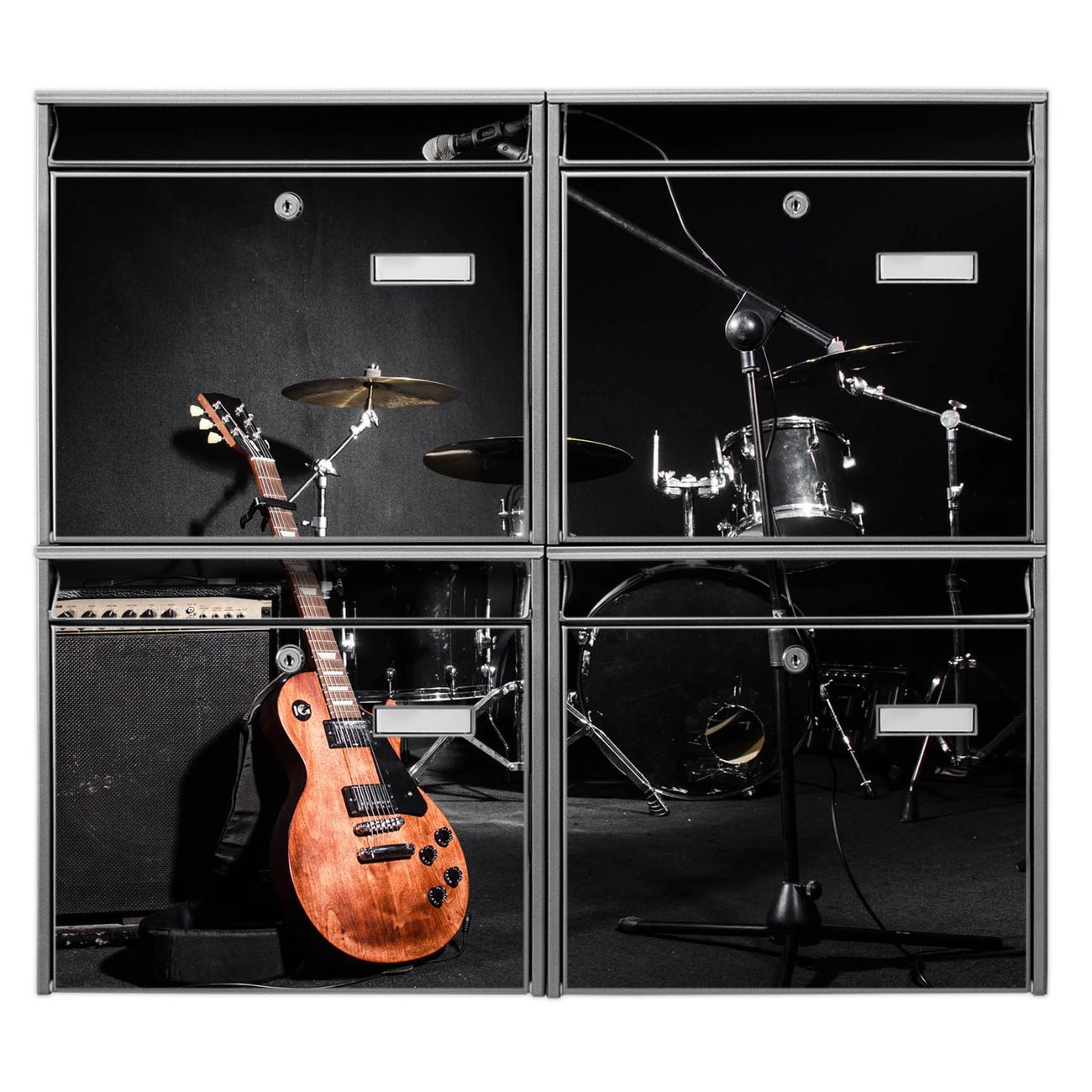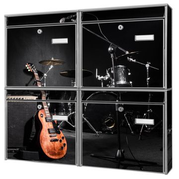 FUNKTION: Die Burg-Wächter Briefkastenanlage mit Motiv Jam Session bietet Ihnen ausreichend Fassungsvermögen um auch A4 und C4 Sendungen zu empfangen. Das integrierte Namensschild lässt sich individuell beschriften. Wählen Sie aus den Grundfarben weiß, silber und schwarz. DESIGN: Die 4 Briefkästen haben ein ansprechendes und zeitloses Design, ohne dabei auf Funktionalität zu verzichten. Das Material ist sehr stabil, wetterfest und rostfrei. Durch das Motiv Jam Session werden die Postkästen zu einem Blickfang. DETAILS: Die Postkästen bestehen aus verzinktem Stahl der zusätzlich mit Klarlack versiegelt wurde. Die Kästen sind gesamt 64,5cm hoch, 72,5cm breit und 10cm tief. Das Motiv besteht aus einer wetter- und UV-festen Folie, die Ihren Briefkasten zusätzlich vor Kratzern schützt. Die Postkästen werden mit Montagematerial, je einem Namensschild und je zwei Schlüsseln geliefert. NUTZEN: Das Briefkastenset eignet sich für die Wandmontage, die Größe bietet genügend Platz für Sendungen aller Art. Das zeitlose Design sowie die stabile Bauart bieten Ihnen einen treuen Begleiter für Ihre Post. BANJADO:
