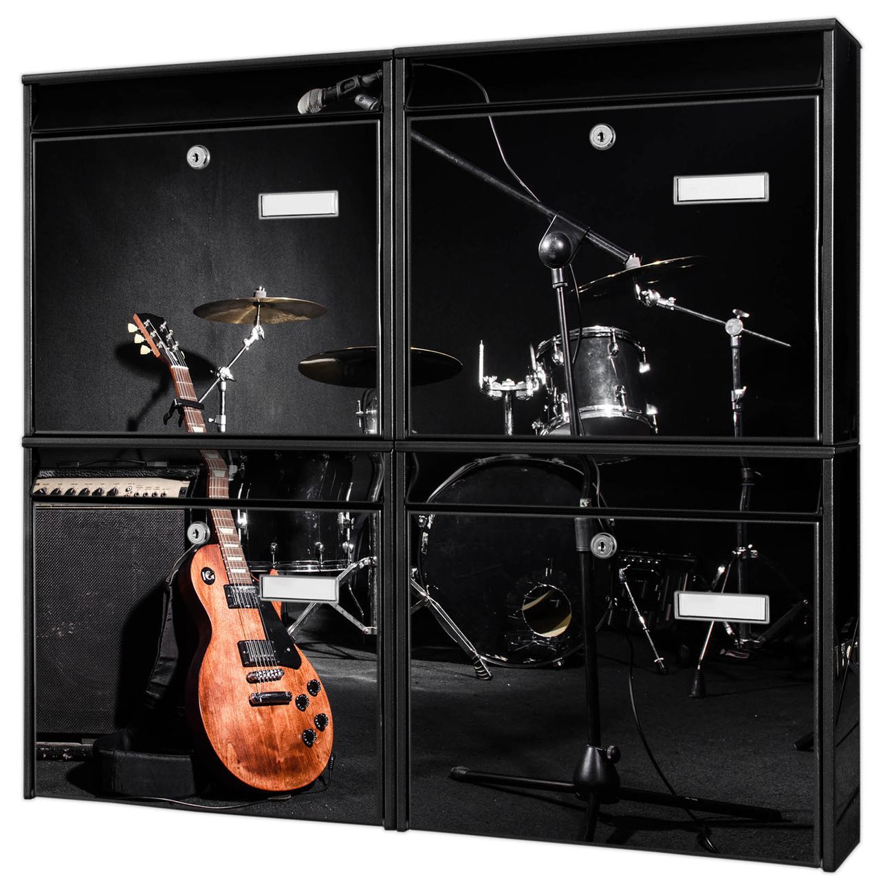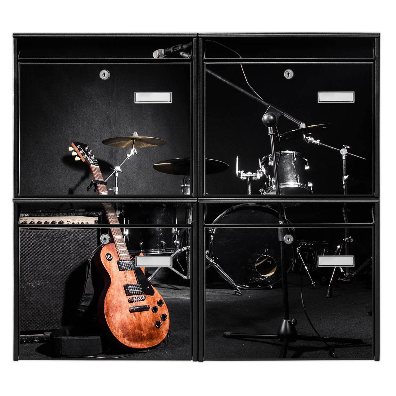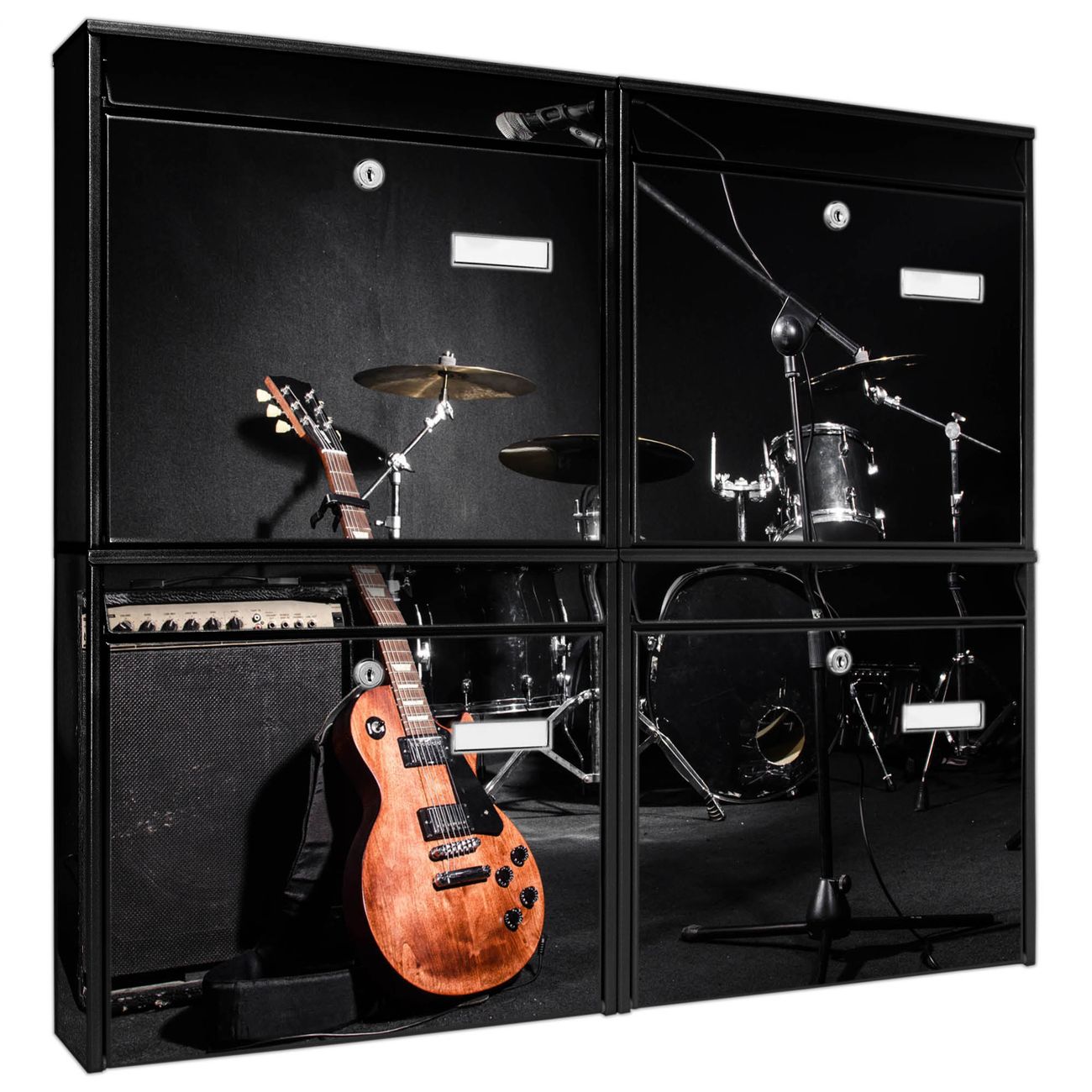 FUNKTION: Die Burg-Wächter Briefkastenanlage mit Motiv Jam Session bietet Ihnen ausreichend Fassungsvermögen um auch A4 und C4 Sendungen zu empfangen. Das integrierte Namensschild lässt sich individuell beschriften. Wählen Sie aus den Grundfarben weiß, silber und schwarz. DESIGN: Die 4 Briefkästen haben ein ansprechendes und zeitloses Design, ohne dabei auf Funktionalität zu verzichten. Das Material ist sehr stabil, wetterfest und rostfrei. Durch das Motiv Jam Session werden die Postkästen zu einem Blickfang. DETAILS: Die Postkästen bestehen aus verzinktem Stahl der zusätzlich mit Klarlack versiegelt wurde. Die Kästen sind gesamt 64,5cm hoch, 72,5cm breit und 10cm tief. Das Motiv besteht aus einer wetter- und UV-festen Folie, die Ihren Briefkasten zusätzlich vor Kratzern schützt. Die Postkästen werden mit Montagematerial, je einem Namensschild und je zwei Schlüsseln geliefert. NUTZEN: Das Briefkastenset eignet sich für die Wandmontage, die Größe bietet genügend Platz für Sendungen aller Art. Das zeitlose Design sowie die stabile Bauart bieten Ihnen einen treuen Begleiter für Ihre Post. BANJADO: