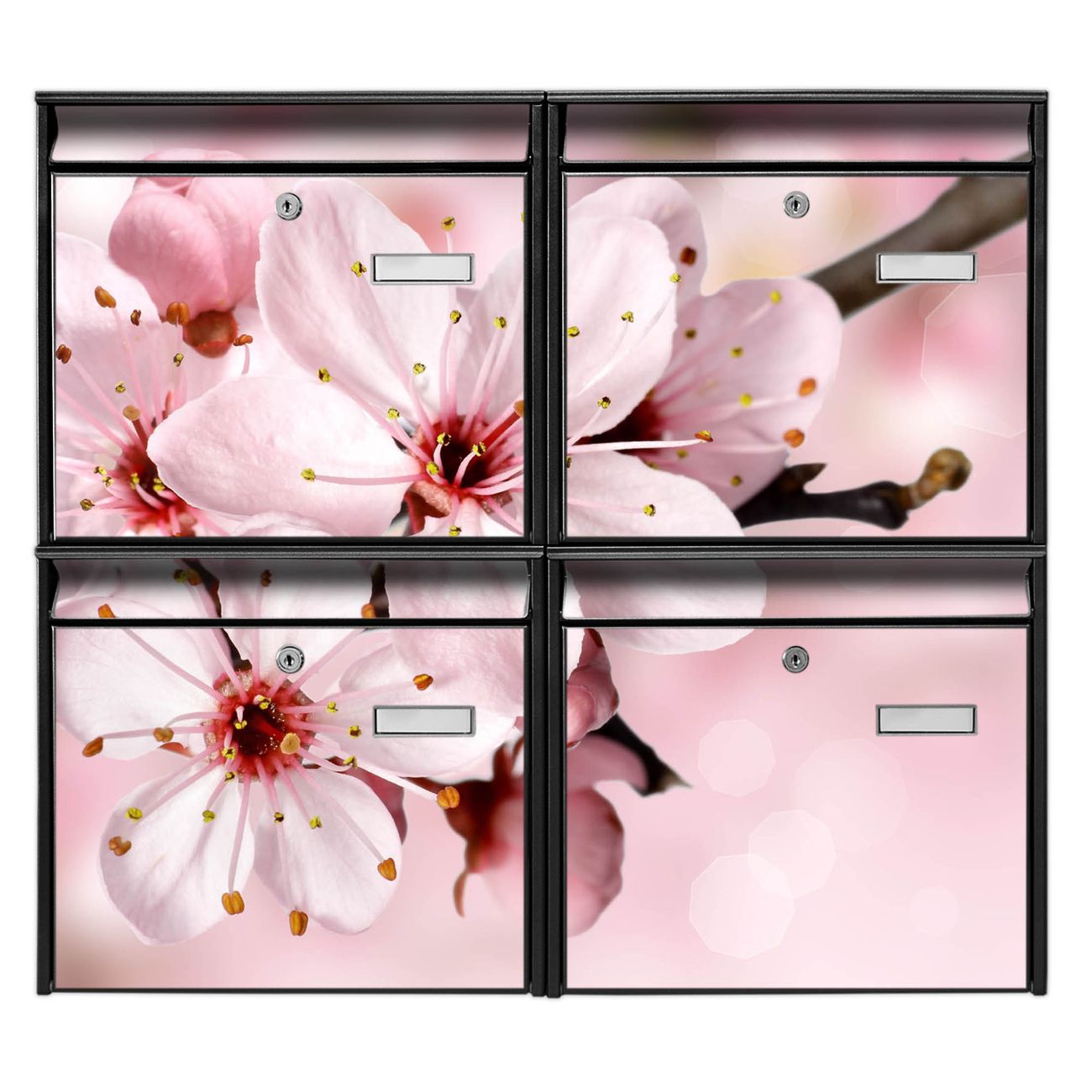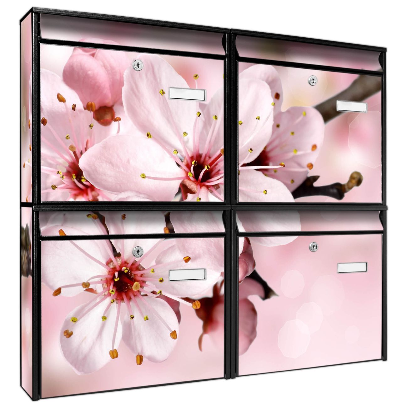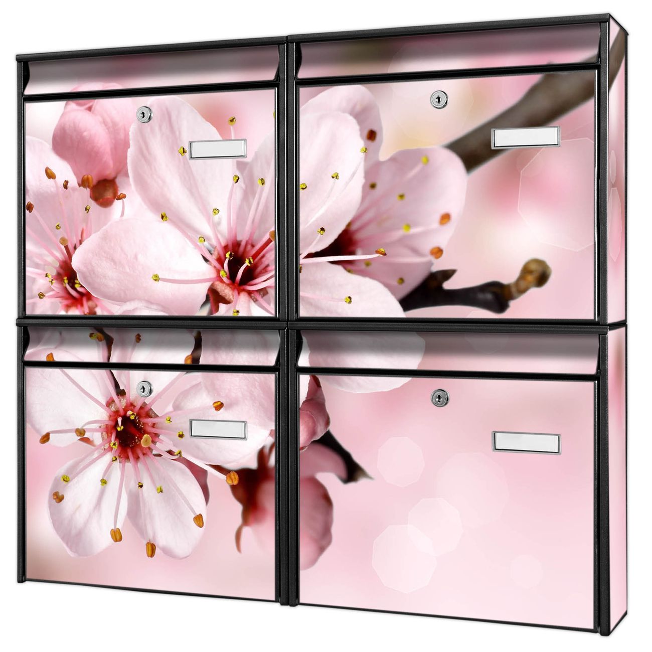 FUNKTION: Die Burg-Wächter Briefkastenanlage mit Motiv Japanische Kirsche bietet Ihnen ausreichend Fassungsvermögen um auch A4 und C4 Sendungen zu empfangen. Das integrierte Namensschild lässt sich individuell beschriften. Wählen Sie aus den Grundfarben weiß, silber und schwarz. DESIGN: Die 4 Briefkästen haben ein ansprechendes und zeitloses Design, ohne dabei auf Funktionalität zu verzichten. Das Material ist sehr stabil, wetterfest und rostfrei. Durch das Motiv Japanische Kirsche werden die Postkästen zu einem Blickfang. DETAILS: Die Postkästen bestehen aus verzinktem Stahl der zusätzlich mit Klarlack versiegelt wurde. Die Kästen sind gesamt 64,5cm hoch, 72,5cm breit und 10cm tief. Das Motiv besteht aus einer wetter- und UV-festen Folie, die Ihren Briefkasten zusätzlich vor Kratzern schützt. Die Postkästen werden mit Montagematerial, je einem Namensschild und je zwei Schlüsseln geliefert. NUTZEN: Das Briefkastenset eignet sich für die Wandmontage, die Größe bietet genügend Platz für Sendungen aller Art. Das zeitlose Design sowie die stabile Bauart bieten Ihnen einen treuen Begleiter für Ihre Post. BANJADO:
