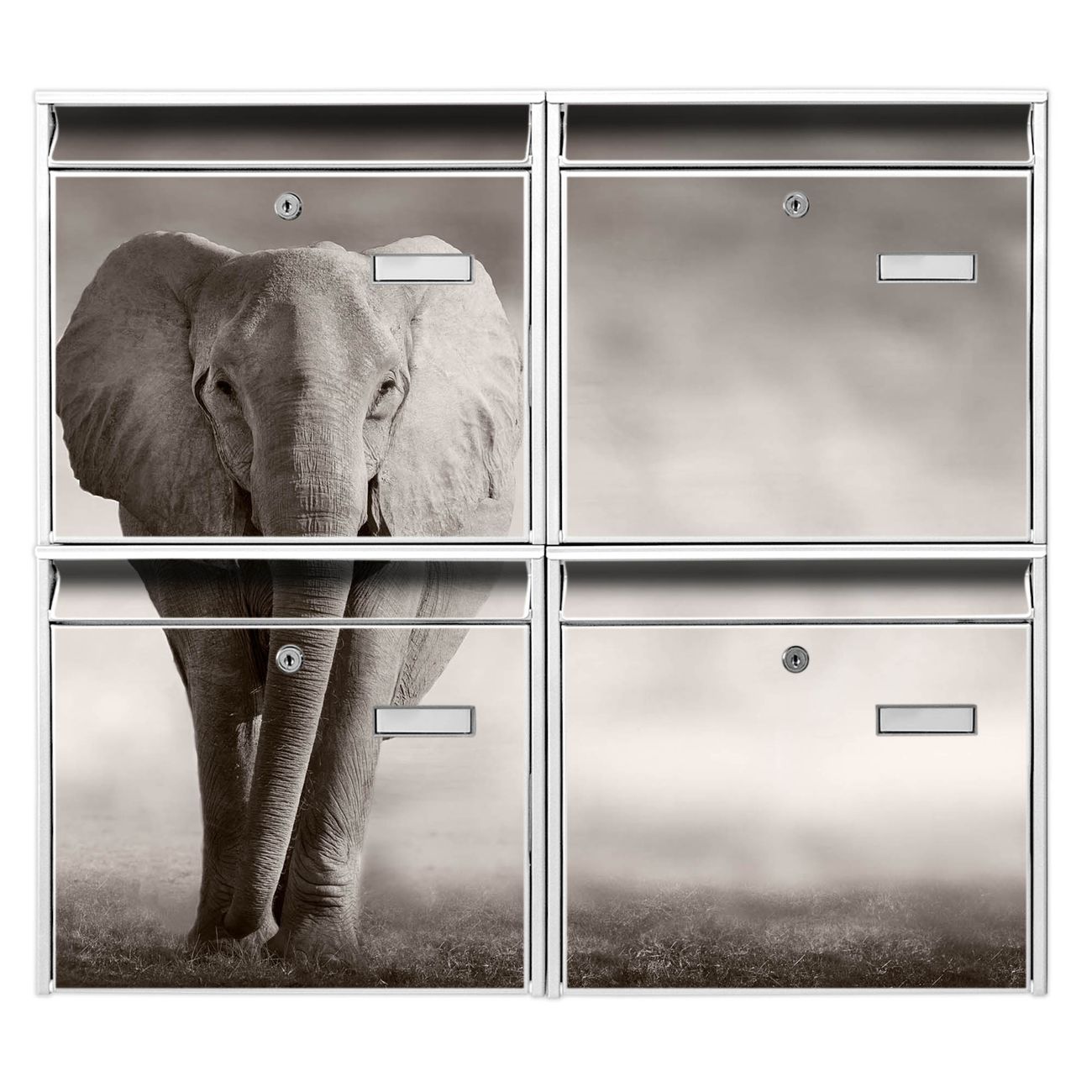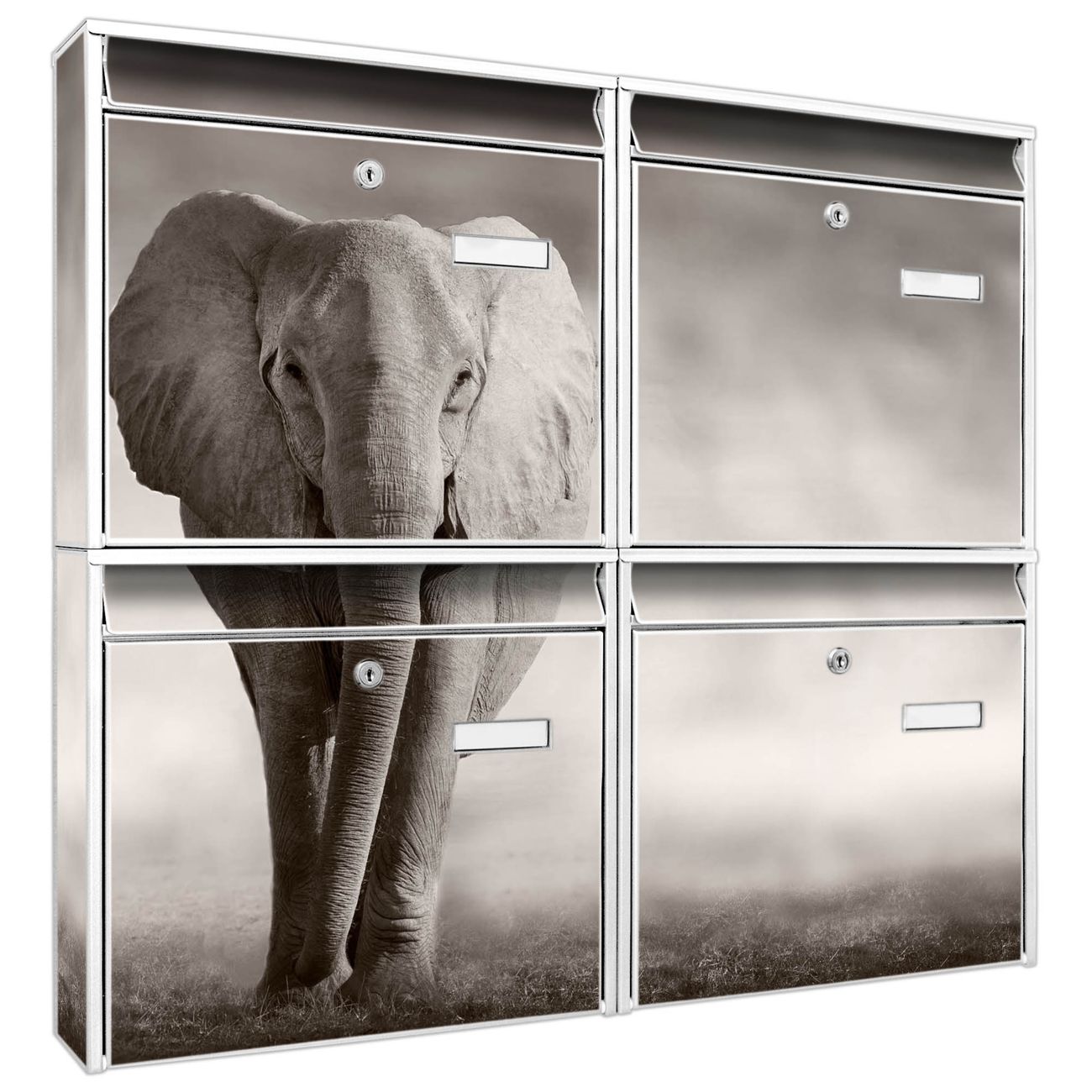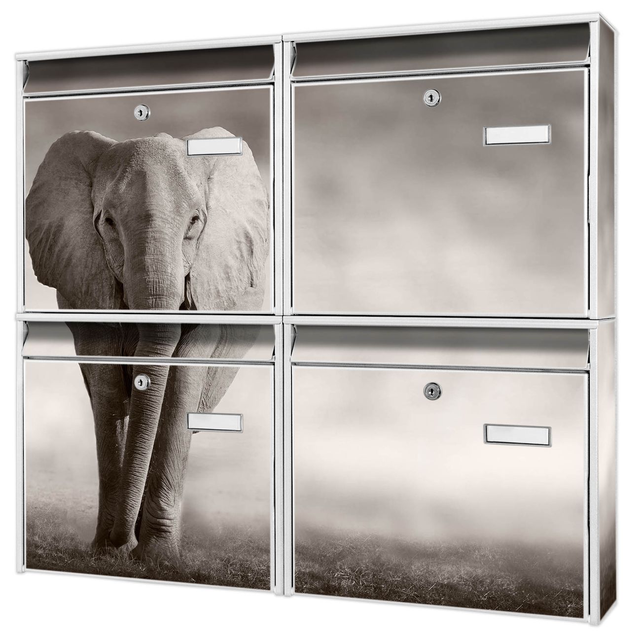 FUNKTION: Die Burg-Wächter Briefkastenanlage mit Motiv Joseline bietet Ihnen ausreichend Fassungsvermögen um auch A4 und C4 Sendungen zu empfangen. Das integrierte Namensschild lässt sich individuell beschriften. Wählen Sie aus den Grundfarben weiß, silber und schwarz. DESIGN: Die 4 Briefkästen haben ein ansprechendes und zeitloses Design, ohne dabei auf Funktionalität zu verzichten. Das Material ist sehr stabil, wetterfest und rostfrei. Durch das Motiv Joseline werden die Postkästen zu einem Blickfang. DETAILS: Die Postkästen bestehen aus verzinktem Stahl der zusätzlich mit Klarlack versiegelt wurde. Die Kästen sind gesamt 64,5cm hoch, 72,5cm breit und 10cm tief. Das Motiv besteht aus einer wetter- und UV-festen Folie, die Ihren Briefkasten zusätzlich vor Kratzern schützt. Die Postkästen werden mit Montagematerial, je einem Namensschild und je zwei Schlüsseln geliefert. NUTZEN: Das Briefkastenset eignet sich für die Wandmontage, die Größe bietet genügend Platz für Sendungen aller Art. Das zeitlose Design sowie die stabile Bauart bieten Ihnen einen treuen Begleiter für Ihre Post. BANJADO: