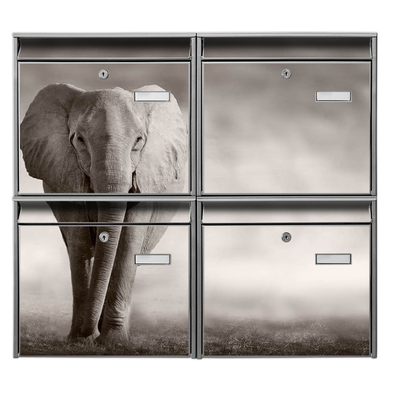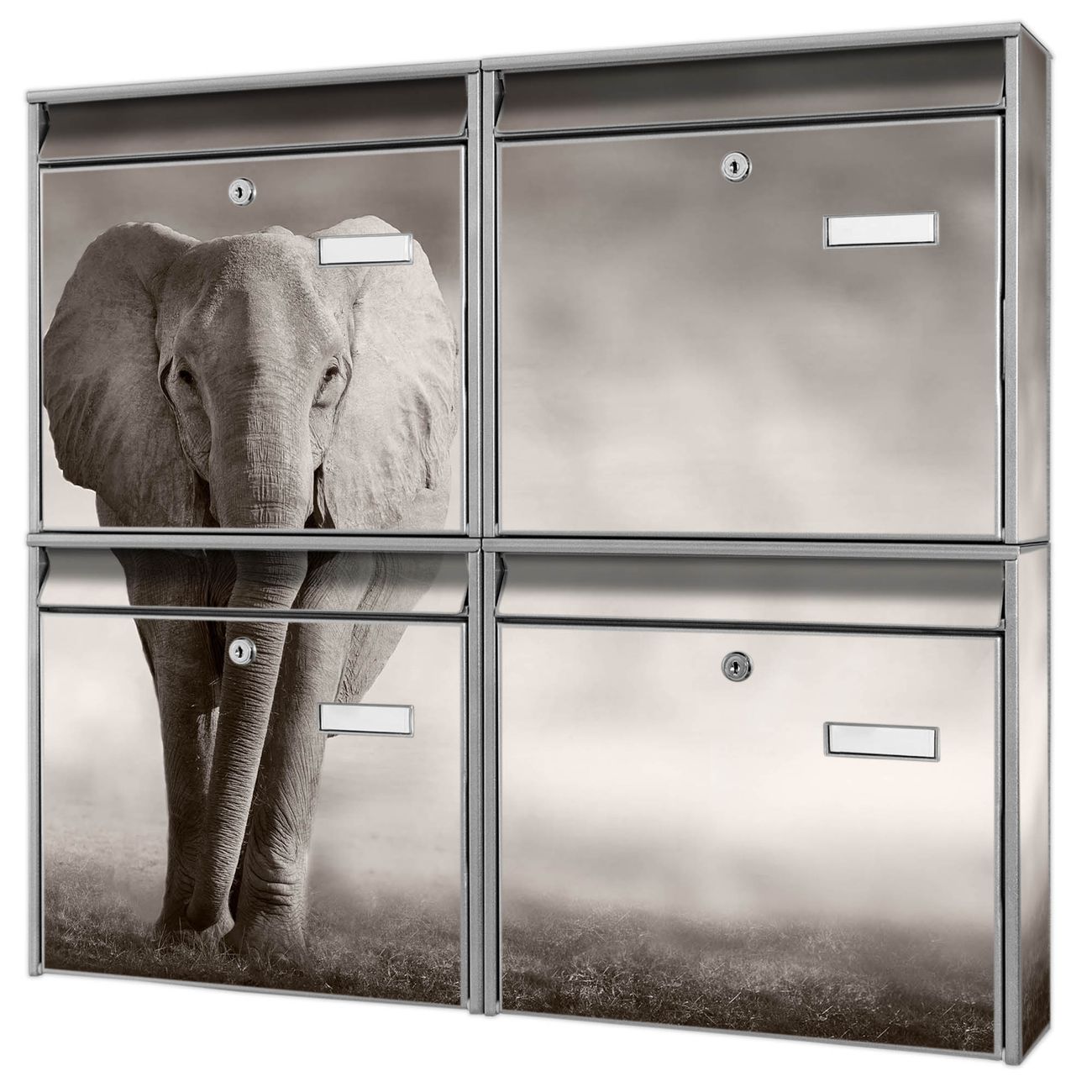 FUNKTION: Die Burg-Wächter Briefkastenanlage mit Motiv Joseline bietet Ihnen ausreichend Fassungsvermögen um auch A4 und C4 Sendungen zu empfangen. Das integrierte Namensschild lässt sich individuell beschriften. Wählen Sie aus den Grundfarben weiß, silber und schwarz. DESIGN: Die 4 Briefkästen haben ein ansprechendes und zeitloses Design, ohne dabei auf Funktionalität zu verzichten. Das Material ist sehr stabil, wetterfest und rostfrei. Durch das Motiv Joseline werden die Postkästen zu einem Blickfang. DETAILS: Die Postkästen bestehen aus verzinktem Stahl der zusätzlich mit Klarlack versiegelt wurde. Die Kästen sind gesamt 64,5cm hoch, 72,5cm breit und 10cm tief. Das Motiv besteht aus einer wetter- und UV-festen Folie, die Ihren Briefkasten zusätzlich vor Kratzern schützt. Die Postkästen werden mit Montagematerial, je einem Namensschild und je zwei Schlüsseln geliefert. NUTZEN: Das Briefkastenset eignet sich für die Wandmontage, die Größe bietet genügend Platz für Sendungen aller Art. Das zeitlose Design sowie die stabile Bauart bieten Ihnen einen treuen Begleiter für Ihre Post. BANJADO: