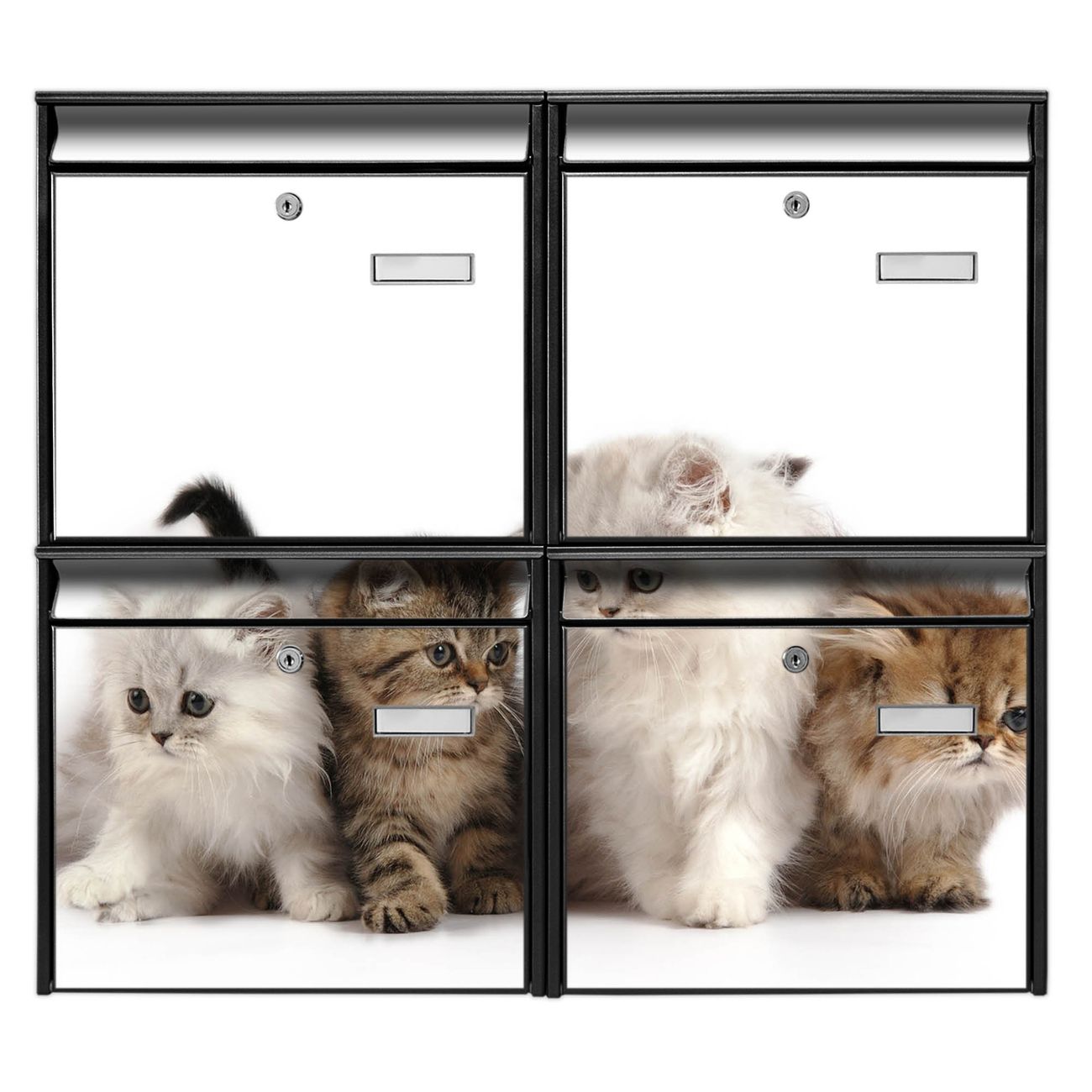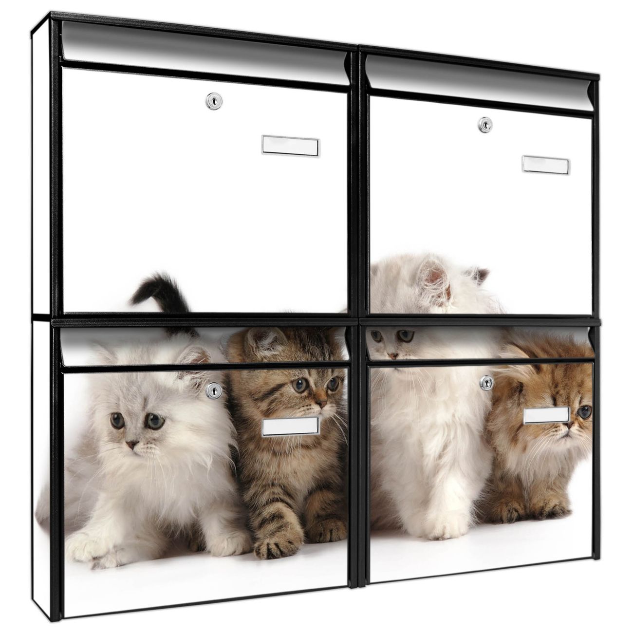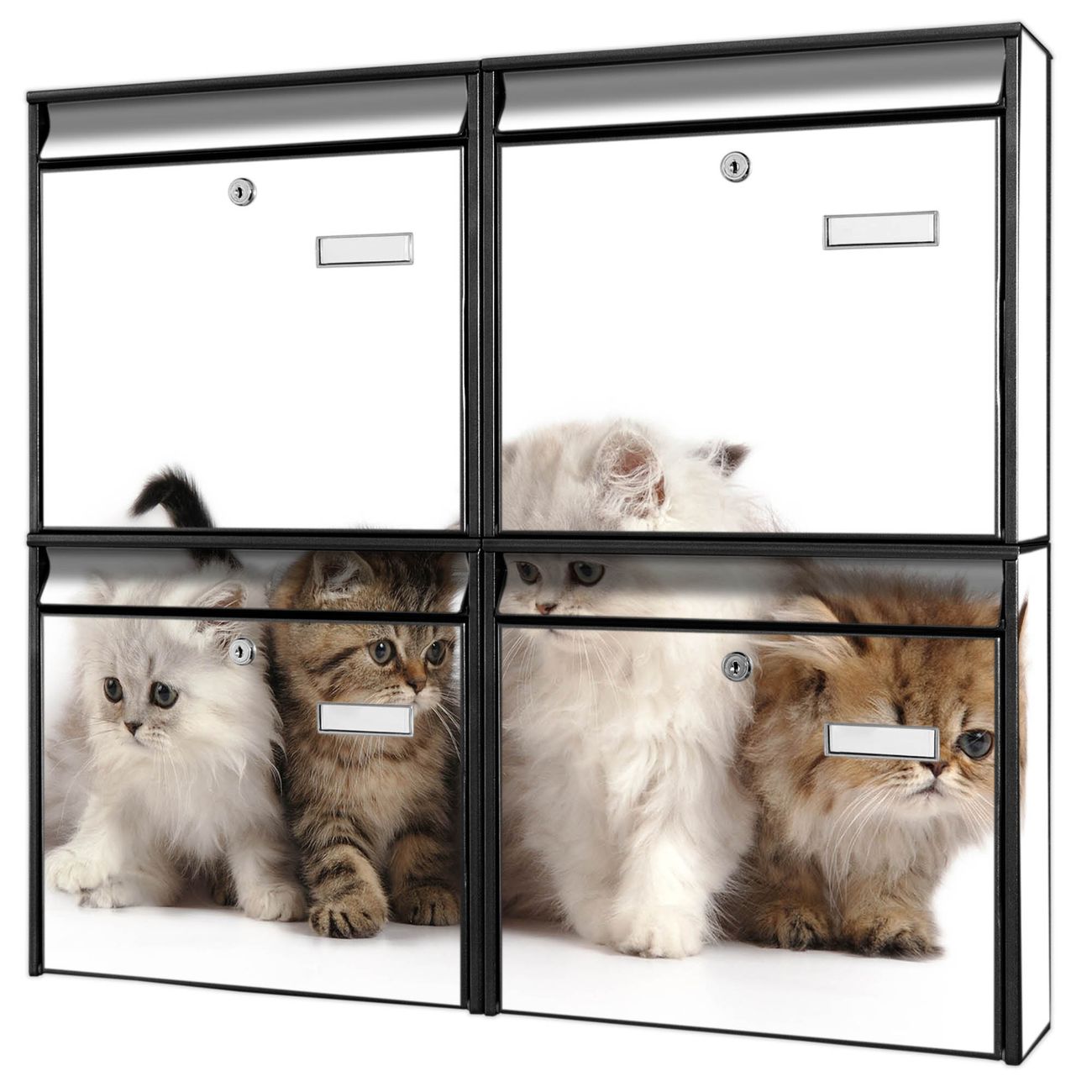 FUNKTION: Die Burg-Wächter Briefkastenanlage mit Motiv Kaetzchen bietet Ihnen ausreichend Fassungsvermögen um auch A4 und C4 Sendungen zu empfangen. Das integrierte Namensschild lässt sich individuell beschriften. Wählen Sie aus den Grundfarben weiß, silber und schwarz. DESIGN: Die 4 Briefkästen haben ein ansprechendes und zeitloses Design, ohne dabei auf Funktionalität zu verzichten. Das Material ist sehr stabil, wetterfest und rostfrei. Durch das Motiv Kaetzchen werden die Postkästen zu einem Blickfang. DETAILS: Die Postkästen bestehen aus verzinktem Stahl der zusätzlich mit Klarlack versiegelt wurde. Die Kästen sind gesamt 64,5cm hoch, 72,5cm breit und 10cm tief. Das Motiv besteht aus einer wetter- und UV-festen Folie, die Ihren Briefkasten zusätzlich vor Kratzern schützt. Die Postkästen werden mit Montagematerial, je einem Namensschild und je zwei Schlüsseln geliefert. NUTZEN: Das Briefkastenset eignet sich für die Wandmontage, die Größe bietet genügend Platz für Sendungen aller Art. Das zeitlose Design sowie die stabile Bauart bieten Ihnen einen treuen Begleiter für Ihre Post. BANJADO: