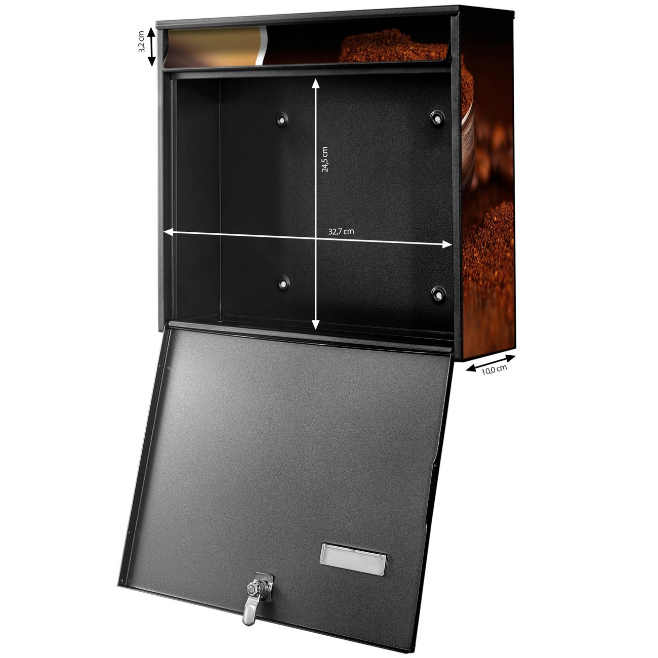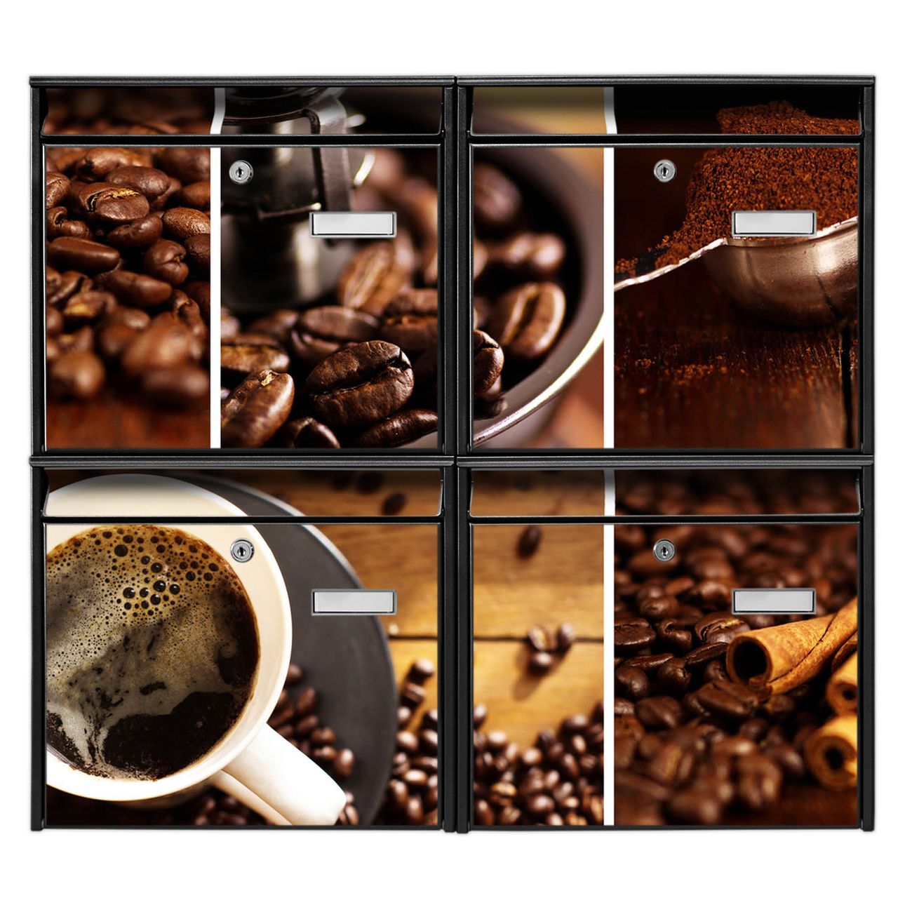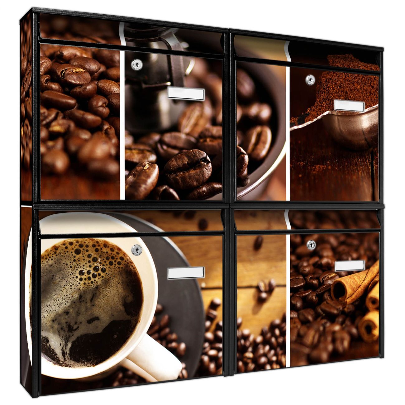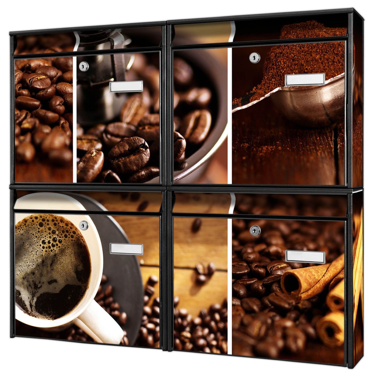 FUNKTION: Die Burg-Wächter Briefkastenanlage mit Motiv Kaffee&Schokolade bietet Ihnen ausreichend Fassungsvermögen um auch A4 und C4 Sendungen zu empfangen. Das integrierte Namensschild lässt sich individuell beschriften. Wählen Sie aus den Grundfarben weiß, silber und schwarz. DESIGN: Die 4 Briefkästen haben ein ansprechendes und zeitloses Design, ohne dabei auf Funktionalität zu verzichten. Das Material ist sehr stabil, wetterfest und rostfrei. Durch das Motiv Kaffee&Schokolade werden die Postkästen zu einem Blickfang. DETAILS: Die Postkästen bestehen aus verzinktem Stahl der zusätzlich mit Klarlack versiegelt wurde. Die Kästen sind gesamt 64,5cm hoch, 72,5cm breit und 10cm tief. Das Motiv besteht aus einer wetter- und UV-festen Folie, die Ihren Briefkasten zusätzlich vor Kratzern schützt. Die Postkästen werden mit Montagematerial, je einem Namensschild und je zwei Schlüsseln geliefert. NUTZEN: Das Briefkastenset eignet sich für die Wandmontage, die Größe bietet genügend Platz für Sendungen aller Art. Das zeitlose Design sowie die stabile Bauart bieten Ihnen einen treuen Begleiter für Ihre Post. BANJADO: