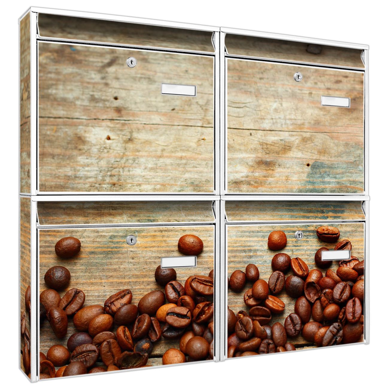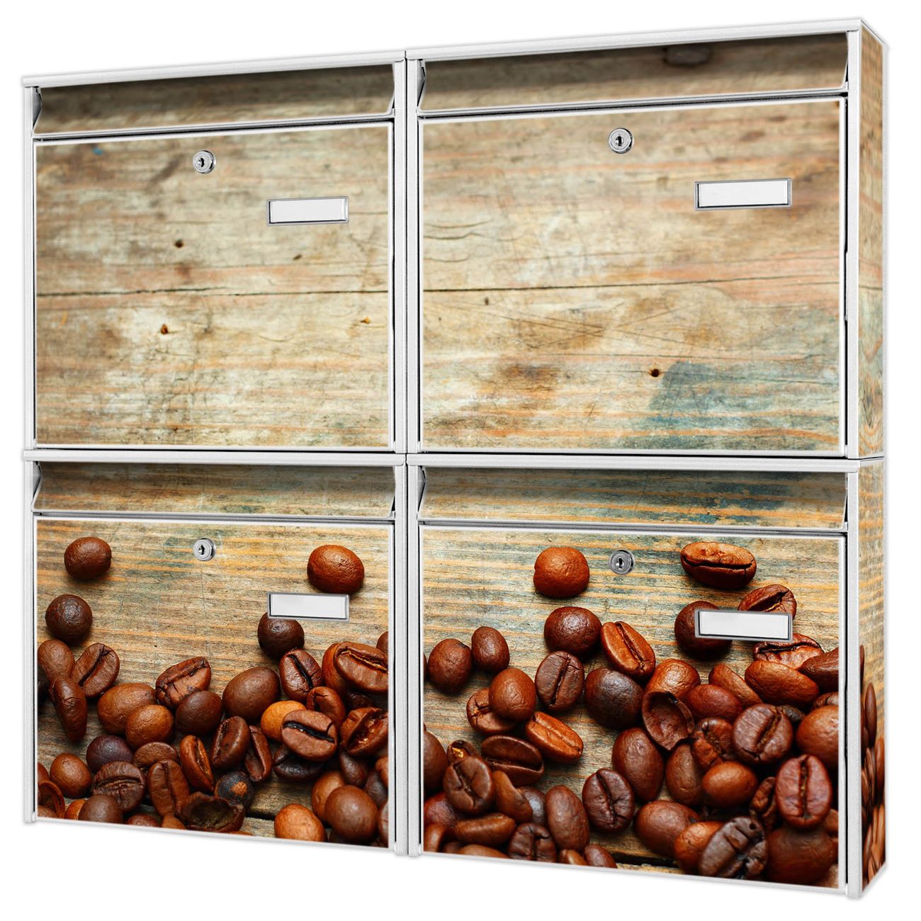 FUNKTION: Die Burg-Wächter Briefkastenanlage mit Motiv Kaffeebohnen bietet Ihnen ausreichend Fassungsvermögen um auch A4 und C4 Sendungen zu empfangen. Das integrierte Namensschild lässt sich individuell beschriften. Wählen Sie aus den Grundfarben weiß, silber und schwarz. DESIGN: Die 4 Briefkästen haben ein ansprechendes und zeitloses Design, ohne dabei auf Funktionalität zu verzichten. Das Material ist sehr stabil, wetterfest und rostfrei. Durch das Motiv Kaffeebohnen werden die Postkästen zu einem Blickfang. DETAILS: Die Postkästen bestehen aus verzinktem Stahl der zusätzlich mit Klarlack versiegelt wurde. Die Kästen sind gesamt 64,5cm hoch, 72,5cm breit und 10cm tief. Das Motiv besteht aus einer wetter- und UV-festen Folie, die Ihren Briefkasten zusätzlich vor Kratzern schützt. Die Postkästen werden mit Montagematerial, je einem Namensschild und je zwei Schlüsseln geliefert. NUTZEN: Das Briefkastenset eignet sich für die Wandmontage, die Größe bietet genügend Platz für Sendungen aller Art. Das zeitlose Design sowie die stabile Bauart bieten Ihnen einen treuen Begleiter für Ihre Post. BANJADO: