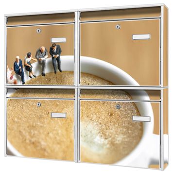 FUNKTION: Die Burg-Wächter Briefkastenanlage mit Motiv Kaffeepause bietet Ihnen ausreichend Fassungsvermögen um auch A4 und C4 Sendungen zu empfangen. Das integrierte Namensschild lässt sich individuell beschriften. Wählen Sie aus den Grundfarben weiß, silber und schwarz. DESIGN: Die 4 Briefkästen haben ein ansprechendes und zeitloses Design, ohne dabei auf Funktionalität zu verzichten. Das Material ist sehr stabil, wetterfest und rostfrei. Durch das Motiv Kaffeepause werden die Postkästen zu einem Blickfang. DETAILS: Die Postkästen bestehen aus verzinktem Stahl der zusätzlich mit Klarlack versiegelt wurde. Die Kästen sind gesamt 64,5cm hoch, 72,5cm breit und 10cm tief. Das Motiv besteht aus einer wetter- und UV-festen Folie, die Ihren Briefkasten zusätzlich vor Kratzern schützt. Die Postkästen werden mit Montagematerial, je einem Namensschild und je zwei Schlüsseln geliefert. NUTZEN: Das Briefkastenset eignet sich für die Wandmontage, die Größe bietet genügend Platz für Sendungen aller Art. Das zeitlose Design sowie die stabile Bauart bieten Ihnen einen treuen Begleiter für Ihre Post. BANJADO: