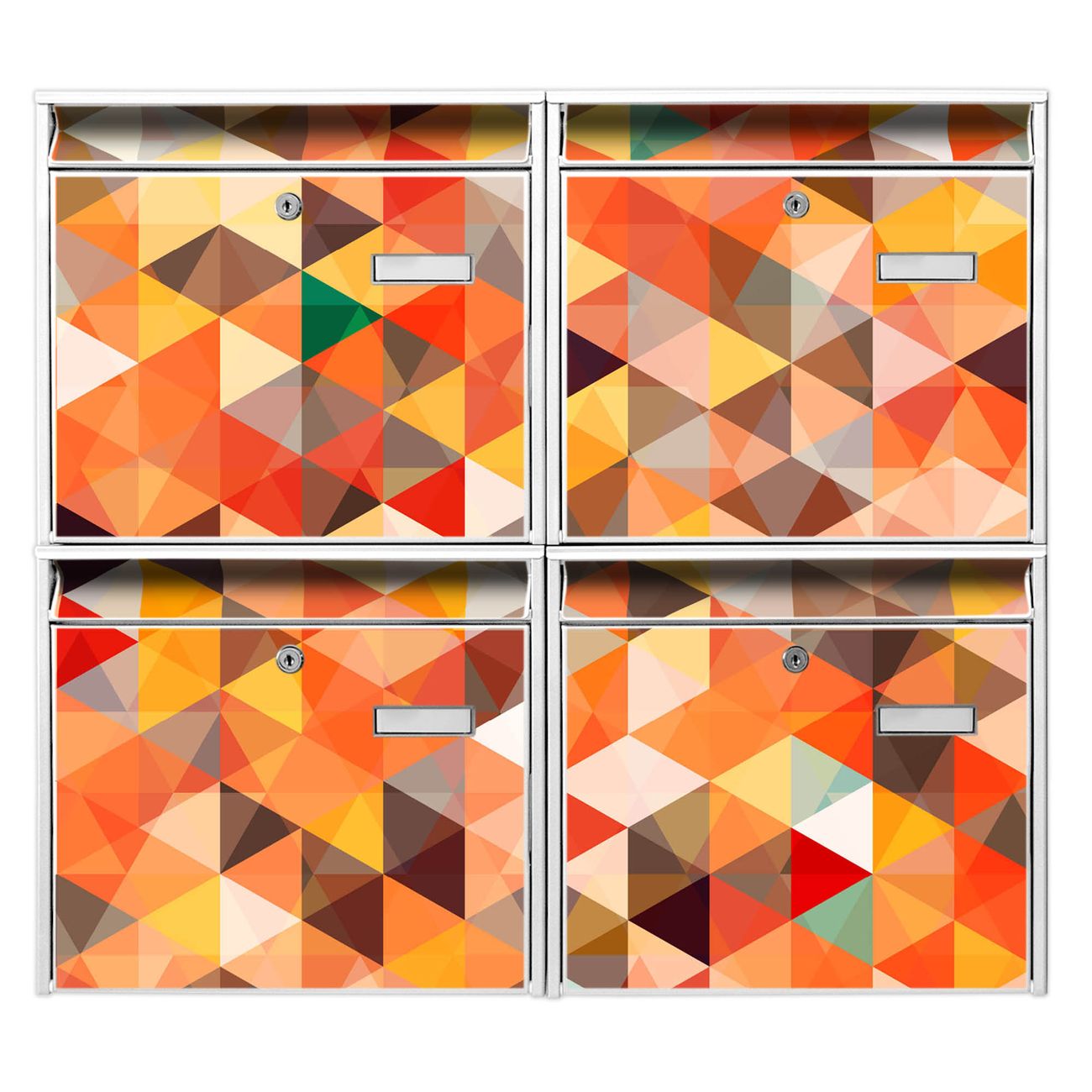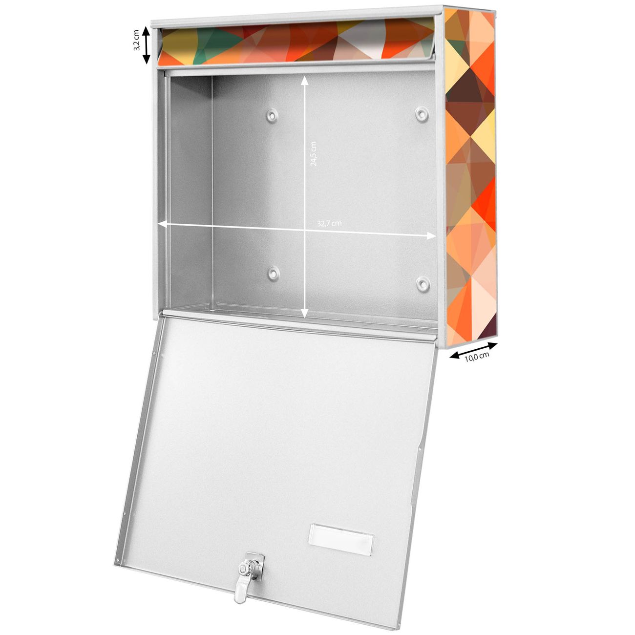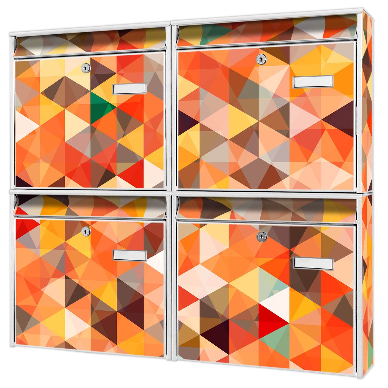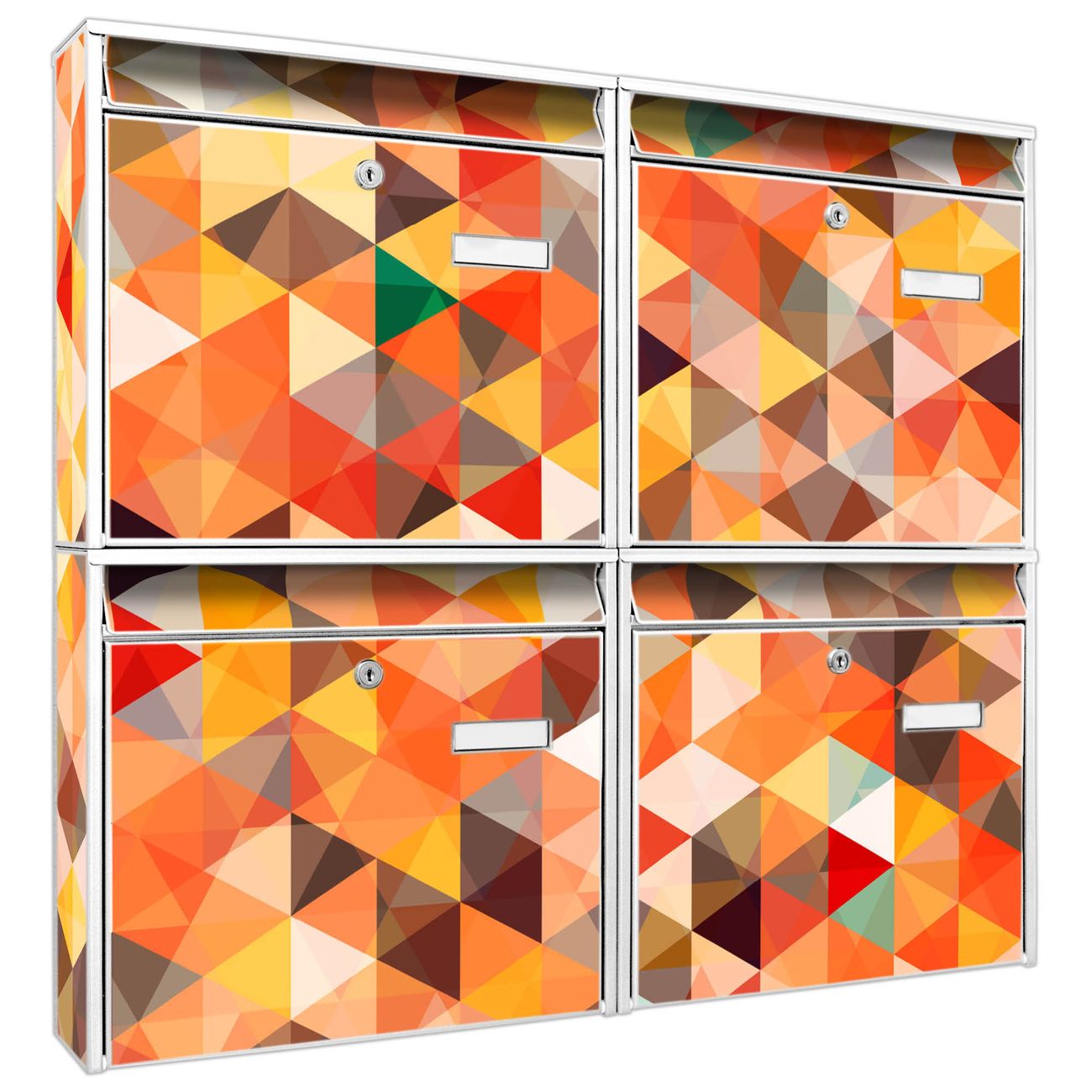 FUNKTION: Die Burg-Wächter Briefkastenanlage mit Motiv Kaleidoskop bietet Ihnen ausreichend Fassungsvermögen um auch A4 und C4 Sendungen zu empfangen. Das integrierte Namensschild lässt sich individuell beschriften. Wählen Sie aus den Grundfarben weiß, silber und schwarz. DESIGN: Die 4 Briefkästen haben ein ansprechendes und zeitloses Design, ohne dabei auf Funktionalität zu verzichten. Das Material ist sehr stabil, wetterfest und rostfrei. Durch das Motiv Kaleidoskop werden die Postkästen zu einem Blickfang. DETAILS: Die Postkästen bestehen aus verzinktem Stahl der zusätzlich mit Klarlack versiegelt wurde. Die Kästen sind gesamt 64,5cm hoch, 72,5cm breit und 10cm tief. Das Motiv besteht aus einer wetter- und UV-festen Folie, die Ihren Briefkasten zusätzlich vor Kratzern schützt. Die Postkästen werden mit Montagematerial, je einem Namensschild und je zwei Schlüsseln geliefert. NUTZEN: Das Briefkastenset eignet sich für die Wandmontage, die Größe bietet genügend Platz für Sendungen aller Art. Das zeitlose Design sowie die stabile Bauart bieten Ihnen einen treuen Begleiter für Ihre Post. BANJADO: