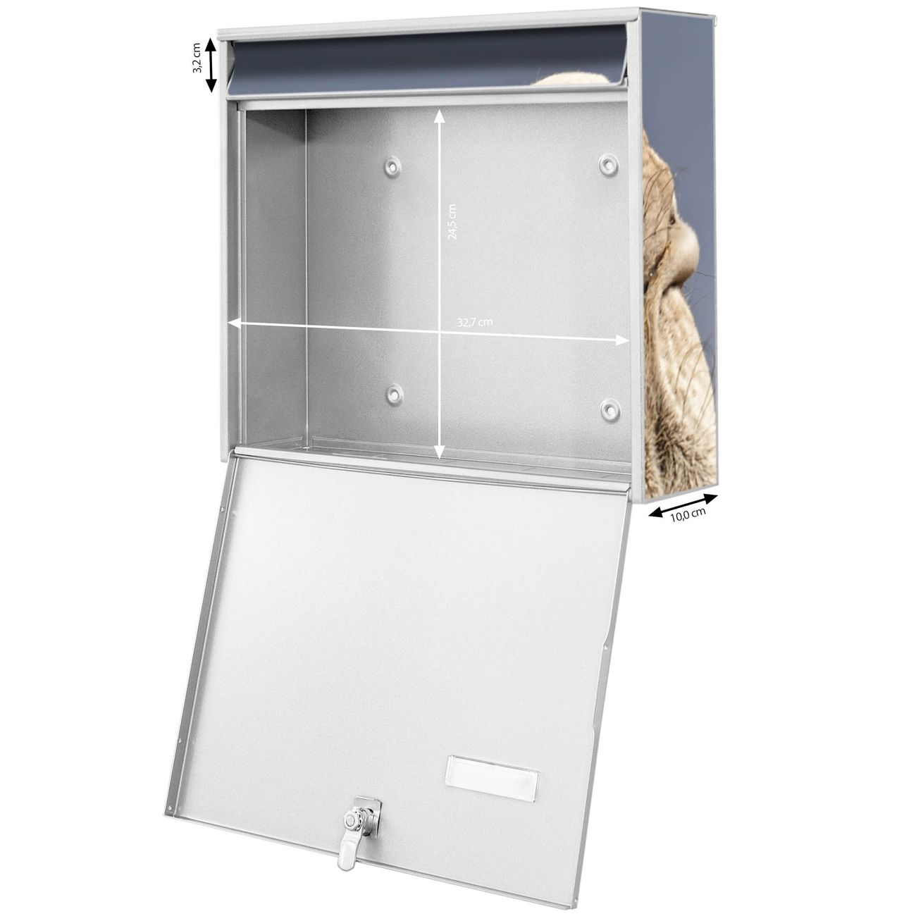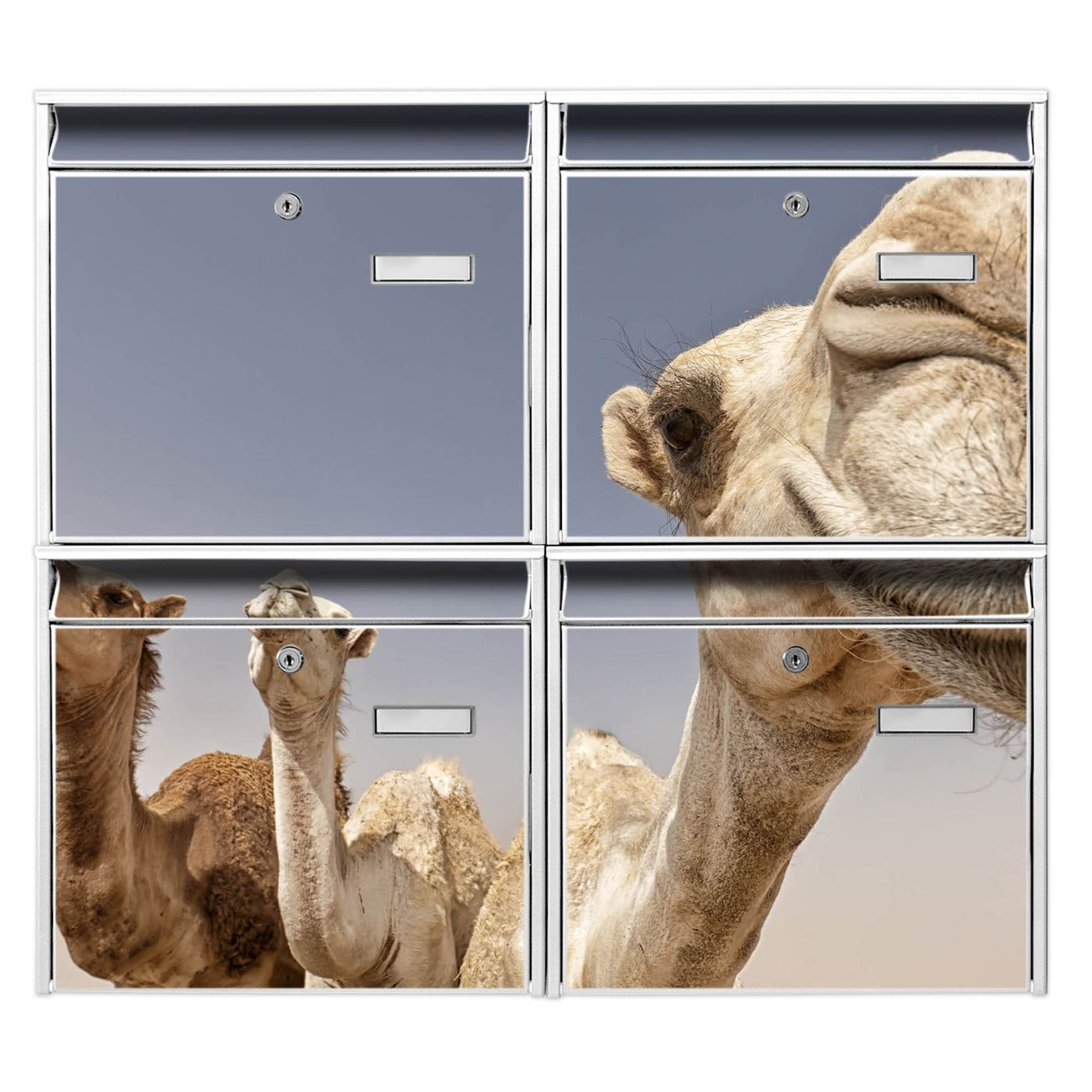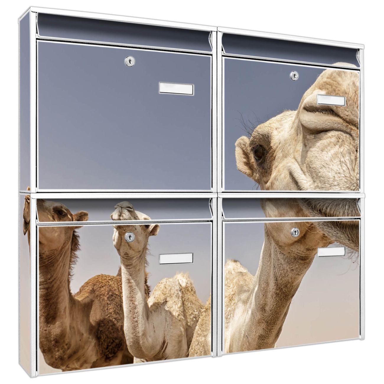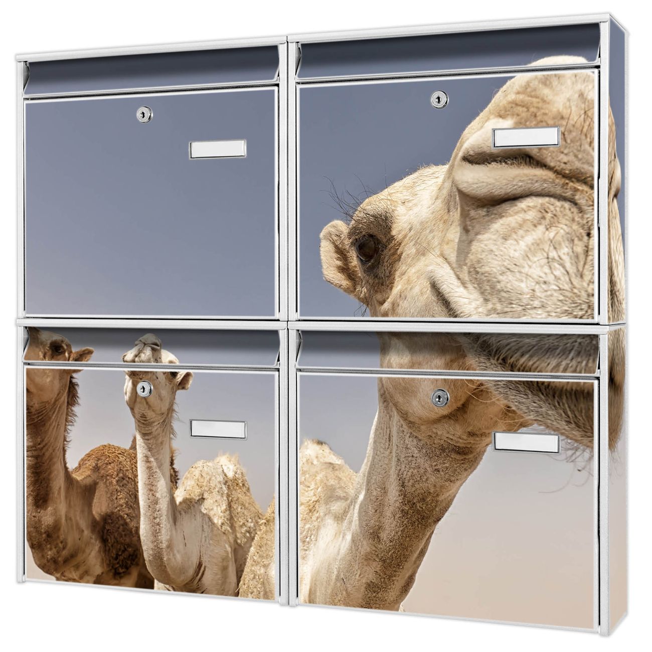 FUNKTION: Die Burg-Wächter Briefkastenanlage mit Motiv Kamele bietet Ihnen ausreichend Fassungsvermögen um auch A4 und C4 Sendungen zu empfangen. Das integrierte Namensschild lässt sich individuell beschriften. Wählen Sie aus den Grundfarben weiß, silber und schwarz. DESIGN: Die 4 Briefkästen haben ein ansprechendes und zeitloses Design, ohne dabei auf Funktionalität zu verzichten. Das Material ist sehr stabil, wetterfest und rostfrei. Durch das Motiv Kamele werden die Postkästen zu einem Blickfang. DETAILS: Die Postkästen bestehen aus verzinktem Stahl der zusätzlich mit Klarlack versiegelt wurde. Die Kästen sind gesamt 64,5cm hoch, 72,5cm breit und 10cm tief. Das Motiv besteht aus einer wetter- und UV-festen Folie, die Ihren Briefkasten zusätzlich vor Kratzern schützt. Die Postkästen werden mit Montagematerial, je einem Namensschild und je zwei Schlüsseln geliefert. NUTZEN: Das Briefkastenset eignet sich für die Wandmontage, die Größe bietet genügend Platz für Sendungen aller Art. Das zeitlose Design sowie die stabile Bauart bieten Ihnen einen treuen Begleiter für Ihre Post. BANJADO: