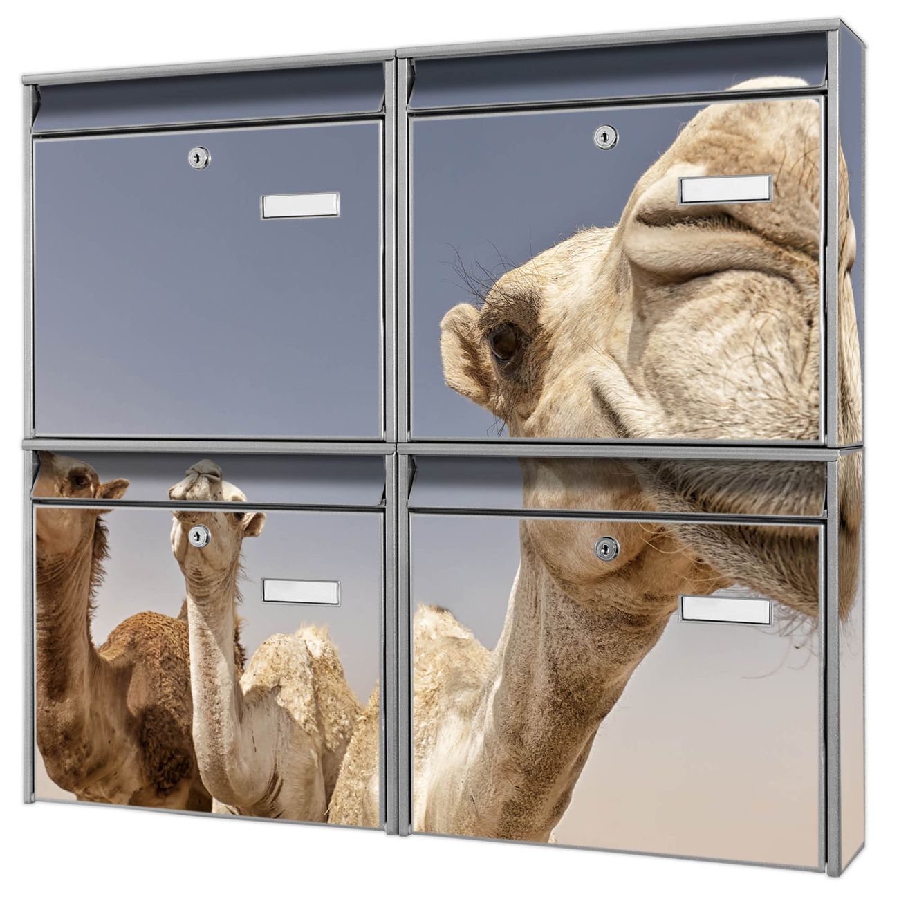 FUNKTION: Die Burg-Wächter Briefkastenanlage mit Motiv Kamele bietet Ihnen ausreichend Fassungsvermögen um auch A4 und C4 Sendungen zu empfangen. Das integrierte Namensschild lässt sich individuell beschriften. Wählen Sie aus den Grundfarben weiß, silber und schwarz. DESIGN: Die 4 Briefkästen haben ein ansprechendes und zeitloses Design, ohne dabei auf Funktionalität zu verzichten. Das Material ist sehr stabil, wetterfest und rostfrei. Durch das Motiv Kamele werden die Postkästen zu einem Blickfang. DETAILS: Die Postkästen bestehen aus verzinktem Stahl der zusätzlich mit Klarlack versiegelt wurde. Die Kästen sind gesamt 64,5cm hoch, 72,5cm breit und 10cm tief. Das Motiv besteht aus einer wetter- und UV-festen Folie, die Ihren Briefkasten zusätzlich vor Kratzern schützt. Die Postkästen werden mit Montagematerial, je einem Namensschild und je zwei Schlüsseln geliefert. NUTZEN: Das Briefkastenset eignet sich für die Wandmontage, die Größe bietet genügend Platz für Sendungen aller Art. Das zeitlose Design sowie die stabile Bauart bieten Ihnen einen treuen Begleiter für Ihre Post. BANJADO: