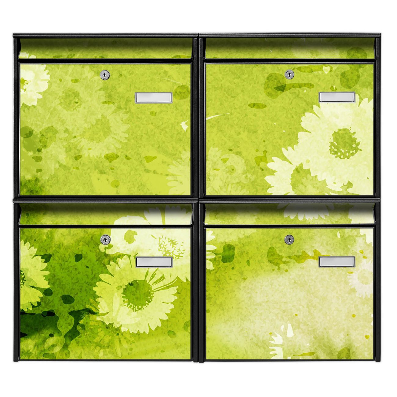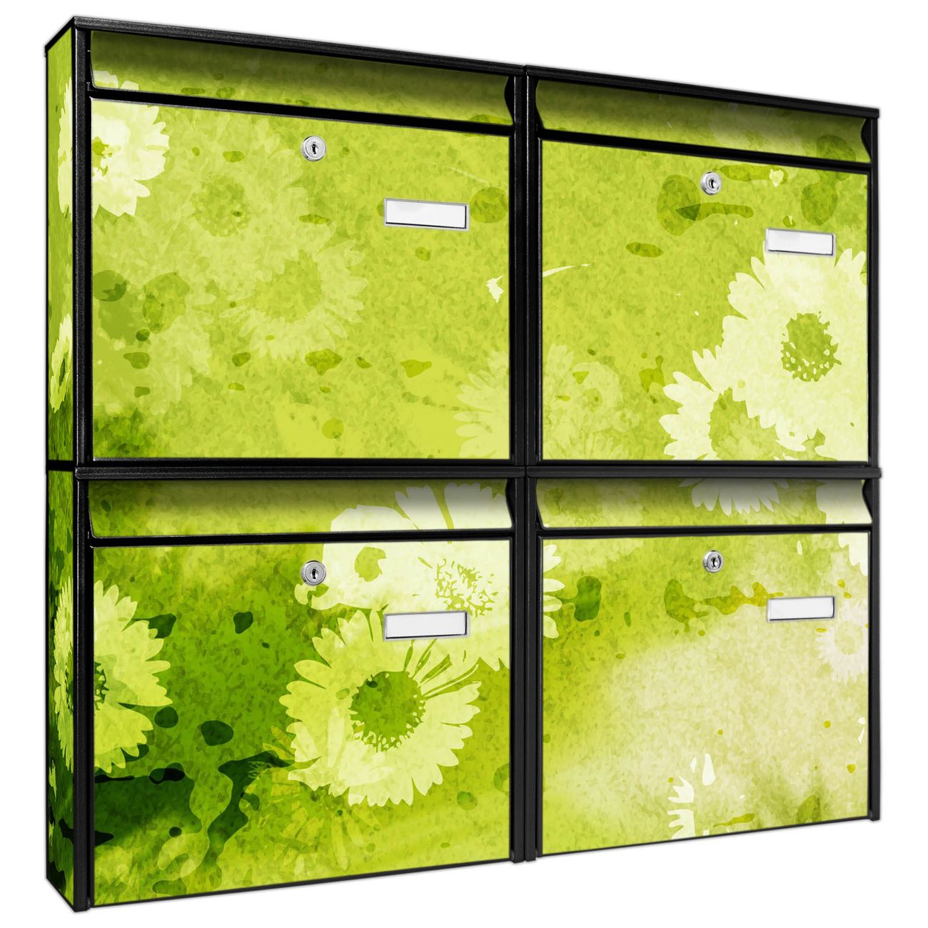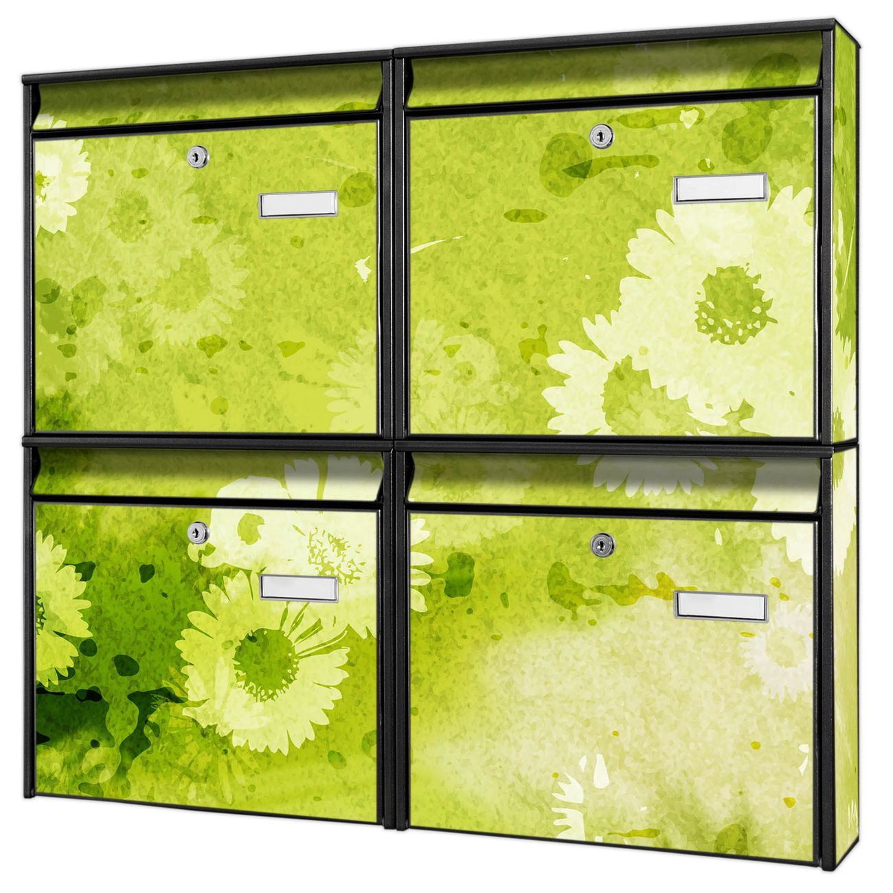 FUNKTION: Die Burg-Wächter Briefkastenanlage mit Motiv Kamille Grün bietet Ihnen ausreichend Fassungsvermögen um auch A4 und C4 Sendungen zu empfangen. Das integrierte Namensschild lässt sich individuell beschriften. Wählen Sie aus den Grundfarben weiß, silber und schwarz. DESIGN: Die 4 Briefkästen haben ein ansprechendes und zeitloses Design, ohne dabei auf Funktionalität zu verzichten. Das Material ist sehr stabil, wetterfest und rostfrei. Durch das Motiv Kamille Grün werden die Postkästen zu einem Blickfang. DETAILS: Die Postkästen bestehen aus verzinktem Stahl der zusätzlich mit Klarlack versiegelt wurde. Die Kästen sind gesamt 64,5cm hoch, 72,5cm breit und 10cm tief. Das Motiv besteht aus einer wetter- und UV-festen Folie, die Ihren Briefkasten zusätzlich vor Kratzern schützt. Die Postkästen werden mit Montagematerial, je einem Namensschild und je zwei Schlüsseln geliefert. NUTZEN: Das Briefkastenset eignet sich für die Wandmontage, die Größe bietet genügend Platz für Sendungen aller Art. Das zeitlose Design sowie die stabile Bauart bieten Ihnen einen treuen Begleiter für Ihre Post. BANJADO: