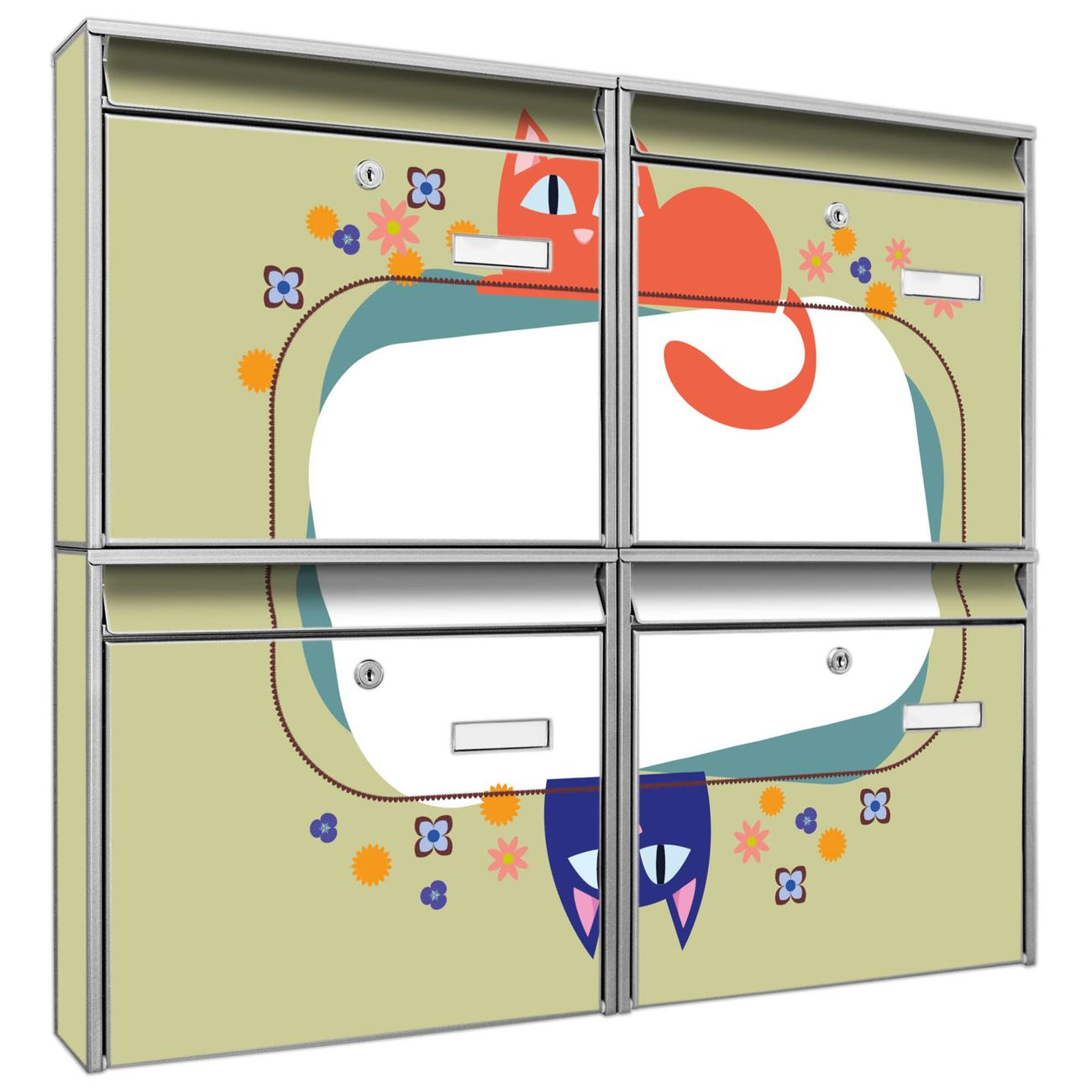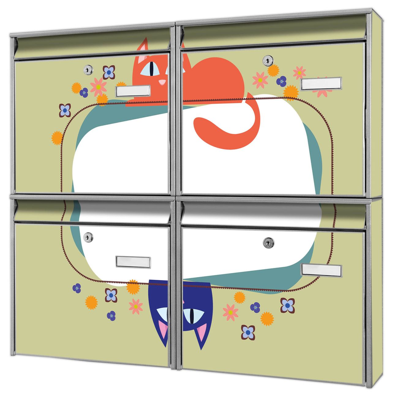 FUNKTION: Die Burg-Wächter Briefkastenanlage mit Motiv Karikatur Katzen bietet Ihnen ausreichend Fassungsvermögen um auch A4 und C4 Sendungen zu empfangen. Das integrierte Namensschild lässt sich individuell beschriften. Wählen Sie aus den Grundfarben weiß, silber und schwarz. DESIGN: Die 4 Briefkästen haben ein ansprechendes und zeitloses Design, ohne dabei auf Funktionalität zu verzichten. Das Material ist sehr stabil, wetterfest und rostfrei. Durch das Motiv Karikatur Katzen werden die Postkästen zu einem Blickfang. DETAILS: Die Postkästen bestehen aus verzinktem Stahl der zusätzlich mit Klarlack versiegelt wurde. Die Kästen sind gesamt 64,5cm hoch, 72,5cm breit und 10cm tief. Das Motiv besteht aus einer wetter- und UV-festen Folie, die Ihren Briefkasten zusätzlich vor Kratzern schützt. Die Postkästen werden mit Montagematerial, je einem Namensschild und je zwei Schlüsseln geliefert. NUTZEN: Das Briefkastenset eignet sich für die Wandmontage, die Größe bietet genügend Platz für Sendungen aller Art. Das zeitlose Design sowie die stabile Bauart bieten Ihnen einen treuen Begleiter für Ihre Post. BANJADO: