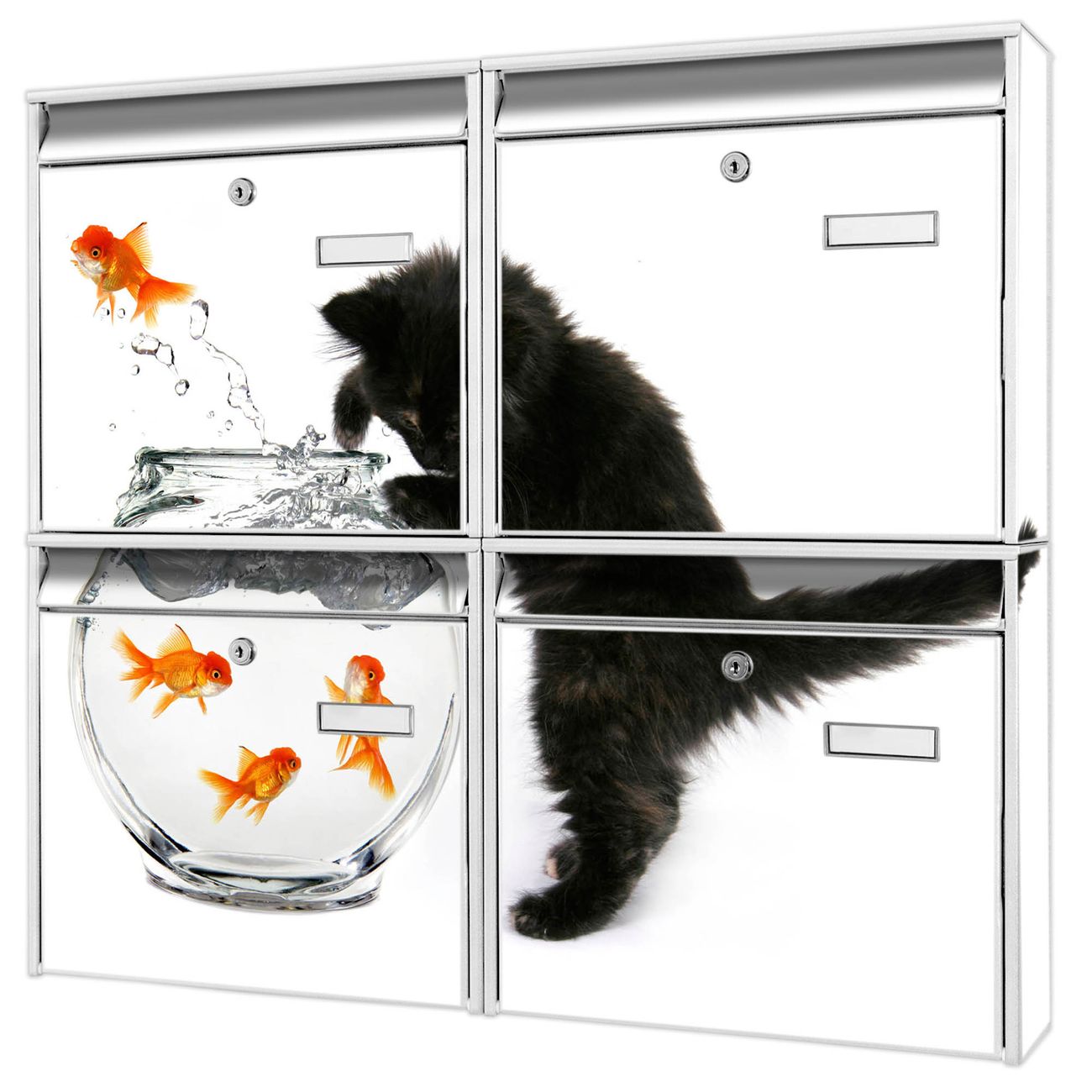 FUNKTION: Die Burg-Wächter Briefkastenanlage mit Motiv Katze Und Fisch bietet Ihnen ausreichend Fassungsvermögen um auch A4 und C4 Sendungen zu empfangen. Das integrierte Namensschild lässt sich individuell beschriften. Wählen Sie aus den Grundfarben weiß, silber und schwarz. DESIGN: Die 4 Briefkästen haben ein ansprechendes und zeitloses Design, ohne dabei auf Funktionalität zu verzichten. Das Material ist sehr stabil, wetterfest und rostfrei. Durch das Motiv Katze Und Fisch werden die Postkästen zu einem Blickfang. DETAILS: Die Postkästen bestehen aus verzinktem Stahl der zusätzlich mit Klarlack versiegelt wurde. Die Kästen sind gesamt 64,5cm hoch, 72,5cm breit und 10cm tief. Das Motiv besteht aus einer wetter- und UV-festen Folie, die Ihren Briefkasten zusätzlich vor Kratzern schützt. Die Postkästen werden mit Montagematerial, je einem Namensschild und je zwei Schlüsseln geliefert. NUTZEN: Das Briefkastenset eignet sich für die Wandmontage, die Größe bietet genügend Platz für Sendungen aller Art. Das zeitlose Design sowie die stabile Bauart bieten Ihnen einen treuen Begleiter für Ihre Post. BANJADO: