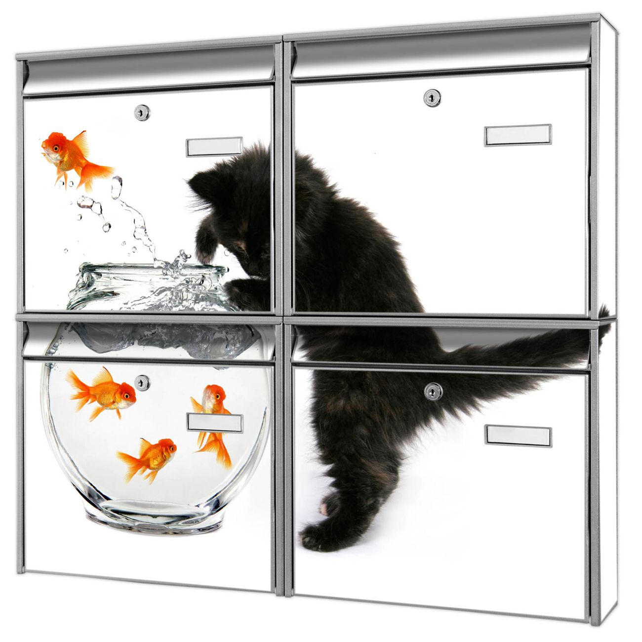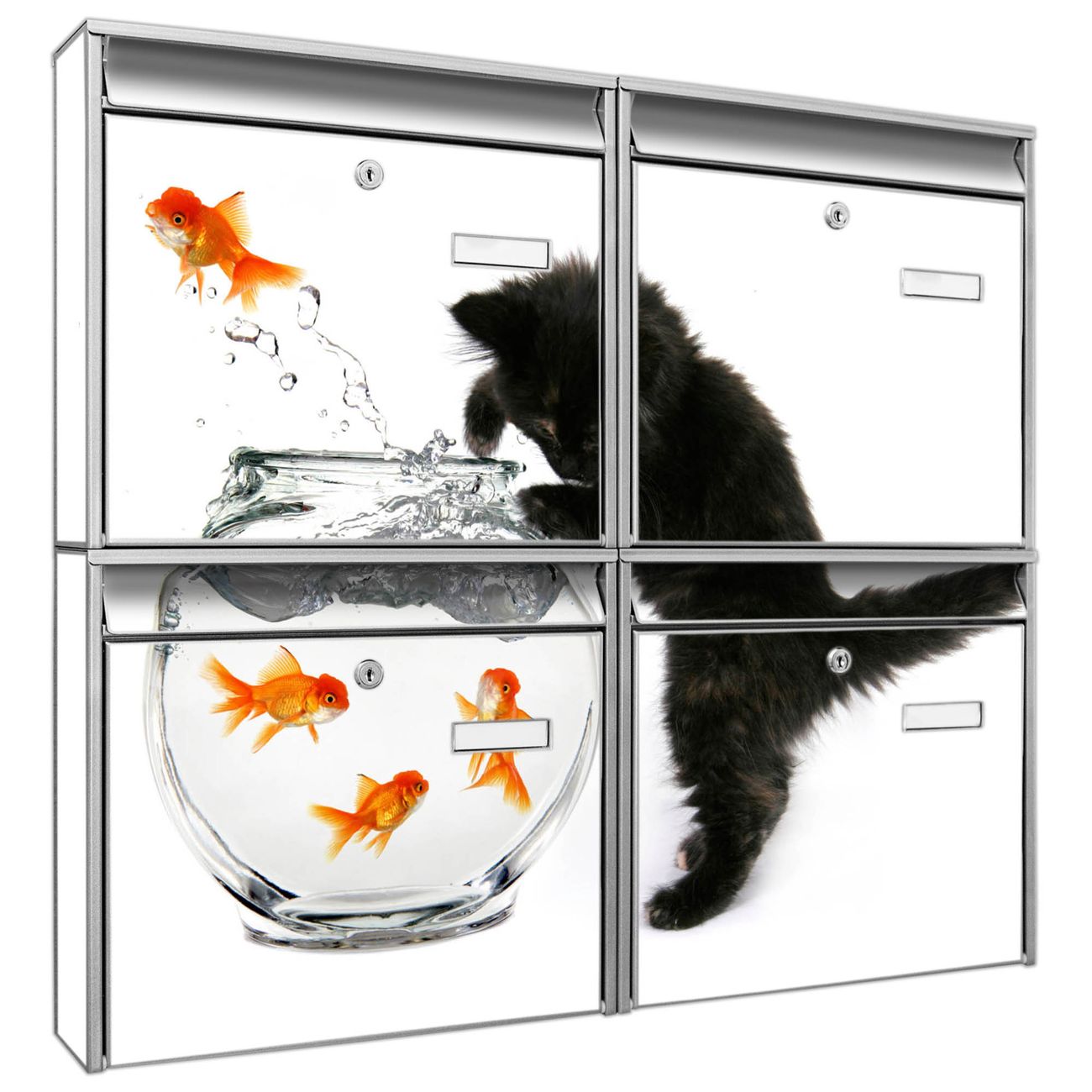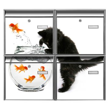 FUNKTION: Die Burg-Wächter Briefkastenanlage mit Motiv Katze Und Fisch bietet Ihnen ausreichend Fassungsvermögen um auch A4 und C4 Sendungen zu empfangen. Das integrierte Namensschild lässt sich individuell beschriften. Wählen Sie aus den Grundfarben weiß, silber und schwarz. DESIGN: Die 4 Briefkästen haben ein ansprechendes und zeitloses Design, ohne dabei auf Funktionalität zu verzichten. Das Material ist sehr stabil, wetterfest und rostfrei. Durch das Motiv Katze Und Fisch werden die Postkästen zu einem Blickfang. DETAILS: Die Postkästen bestehen aus verzinktem Stahl der zusätzlich mit Klarlack versiegelt wurde. Die Kästen sind gesamt 64,5cm hoch, 72,5cm breit und 10cm tief. Das Motiv besteht aus einer wetter- und UV-festen Folie, die Ihren Briefkasten zusätzlich vor Kratzern schützt. Die Postkästen werden mit Montagematerial, je einem Namensschild und je zwei Schlüsseln geliefert. NUTZEN: Das Briefkastenset eignet sich für die Wandmontage, die Größe bietet genügend Platz für Sendungen aller Art. Das zeitlose Design sowie die stabile Bauart bieten Ihnen einen treuen Begleiter für Ihre Post. BANJADO: