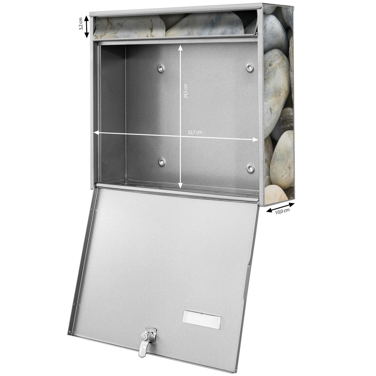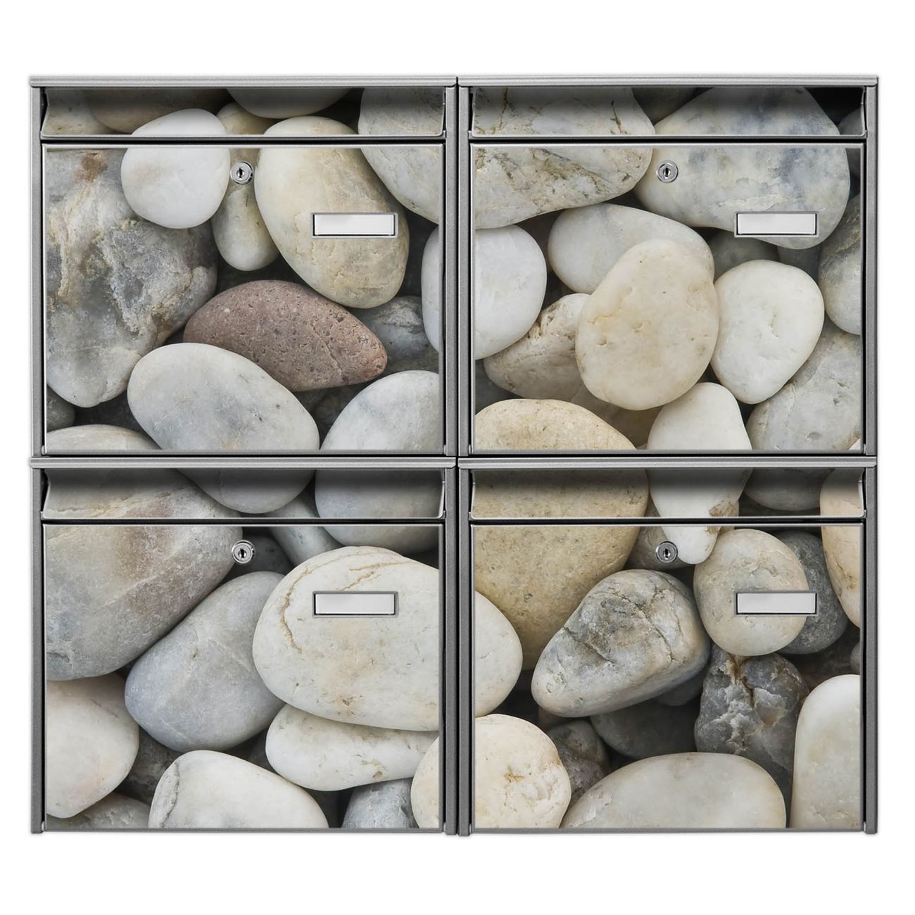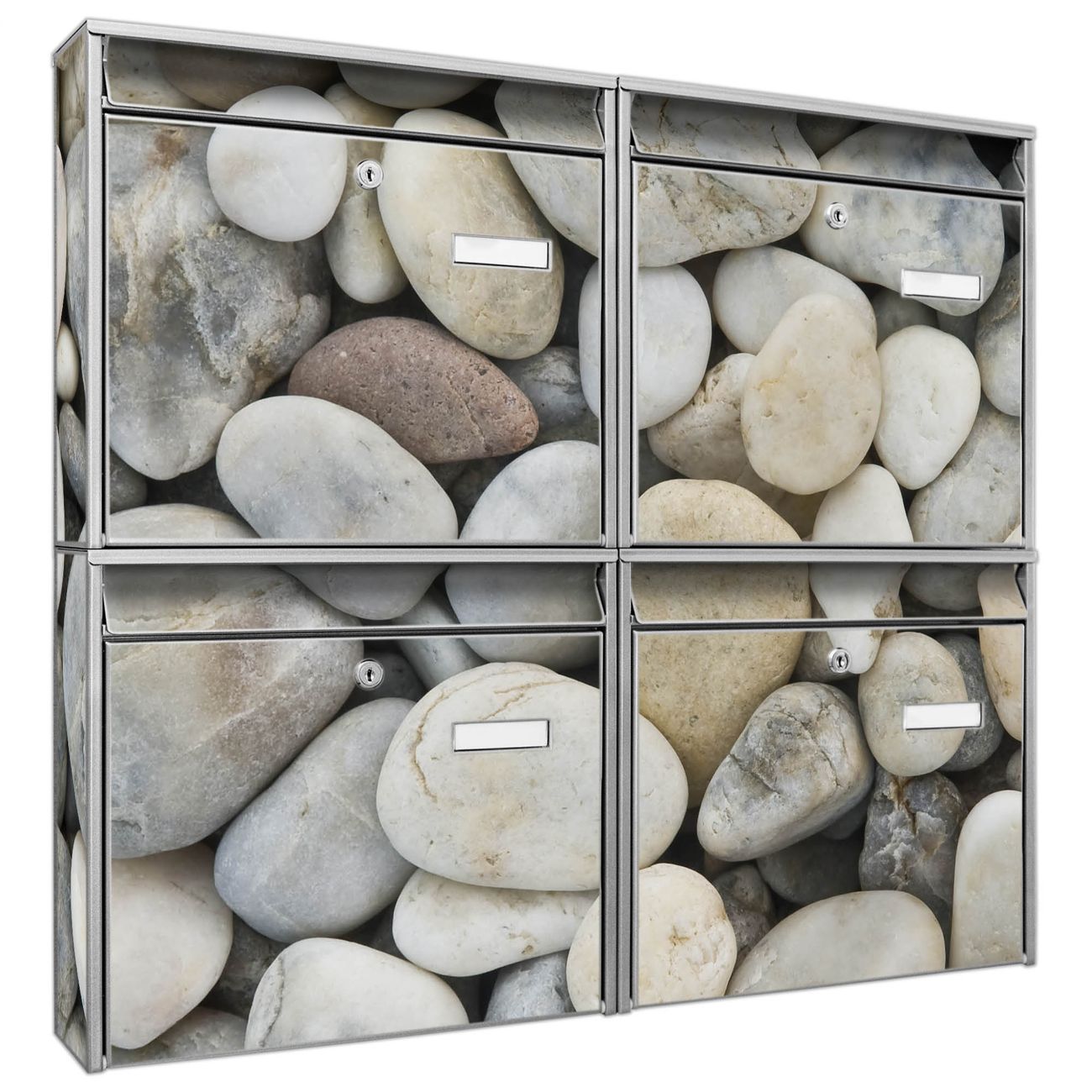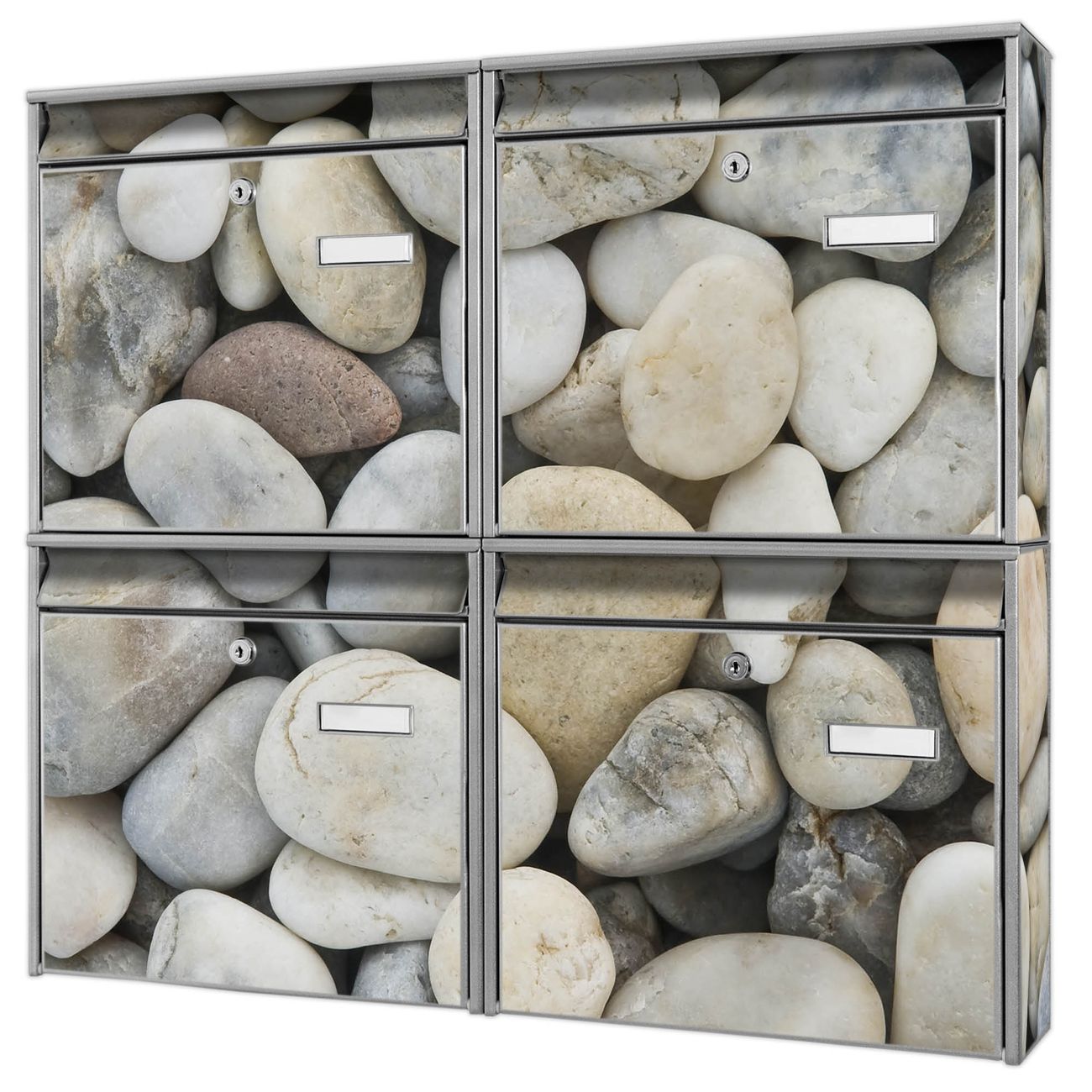 FUNKTION: Die Burg-Wächter Briefkastenanlage mit Motiv Kieselsteine bietet Ihnen ausreichend Fassungsvermögen um auch A4 und C4 Sendungen zu empfangen. Das integrierte Namensschild lässt sich individuell beschriften. Wählen Sie aus den Grundfarben weiß, silber und schwarz. DESIGN: Die 4 Briefkästen haben ein ansprechendes und zeitloses Design, ohne dabei auf Funktionalität zu verzichten. Das Material ist sehr stabil, wetterfest und rostfrei. Durch das Motiv Kieselsteine werden die Postkästen zu einem Blickfang. DETAILS: Die Postkästen bestehen aus verzinktem Stahl der zusätzlich mit Klarlack versiegelt wurde. Die Kästen sind gesamt 64,5cm hoch, 72,5cm breit und 10cm tief. Das Motiv besteht aus einer wetter- und UV-festen Folie, die Ihren Briefkasten zusätzlich vor Kratzern schützt. Die Postkästen werden mit Montagematerial, je einem Namensschild und je zwei Schlüsseln geliefert. NUTZEN: Das Briefkastenset eignet sich für die Wandmontage, die Größe bietet genügend Platz für Sendungen aller Art. Das zeitlose Design sowie die stabile Bauart bieten Ihnen einen treuen Begleiter für Ihre Post. BANJADO: