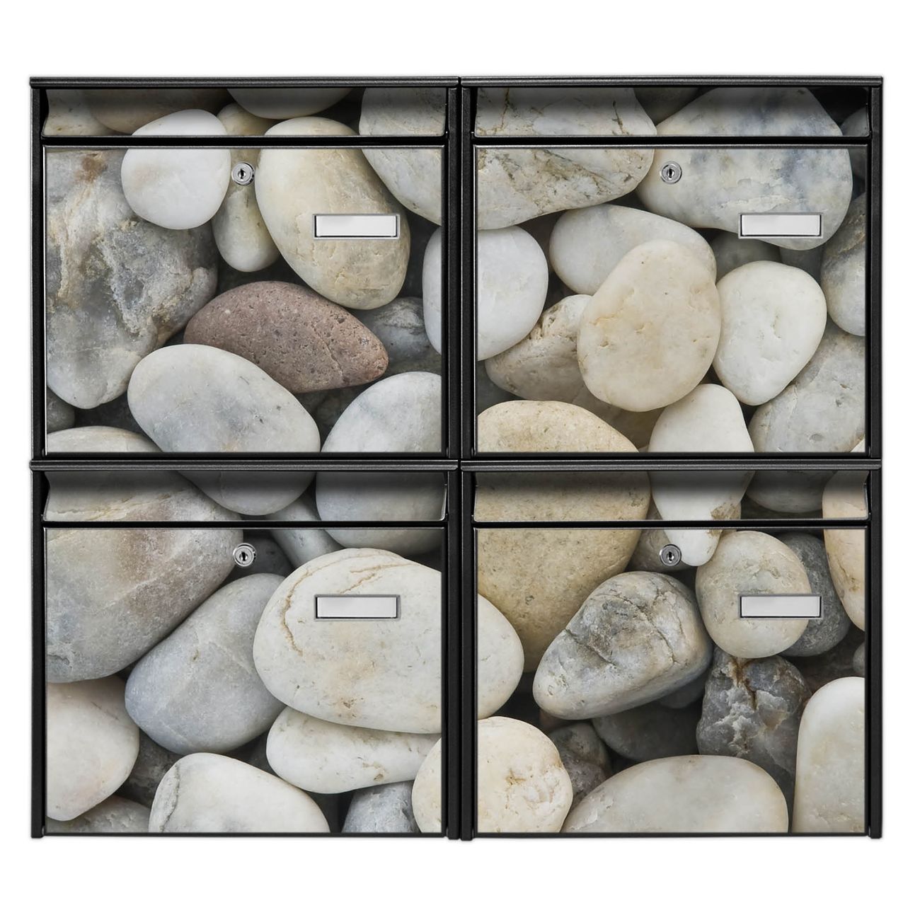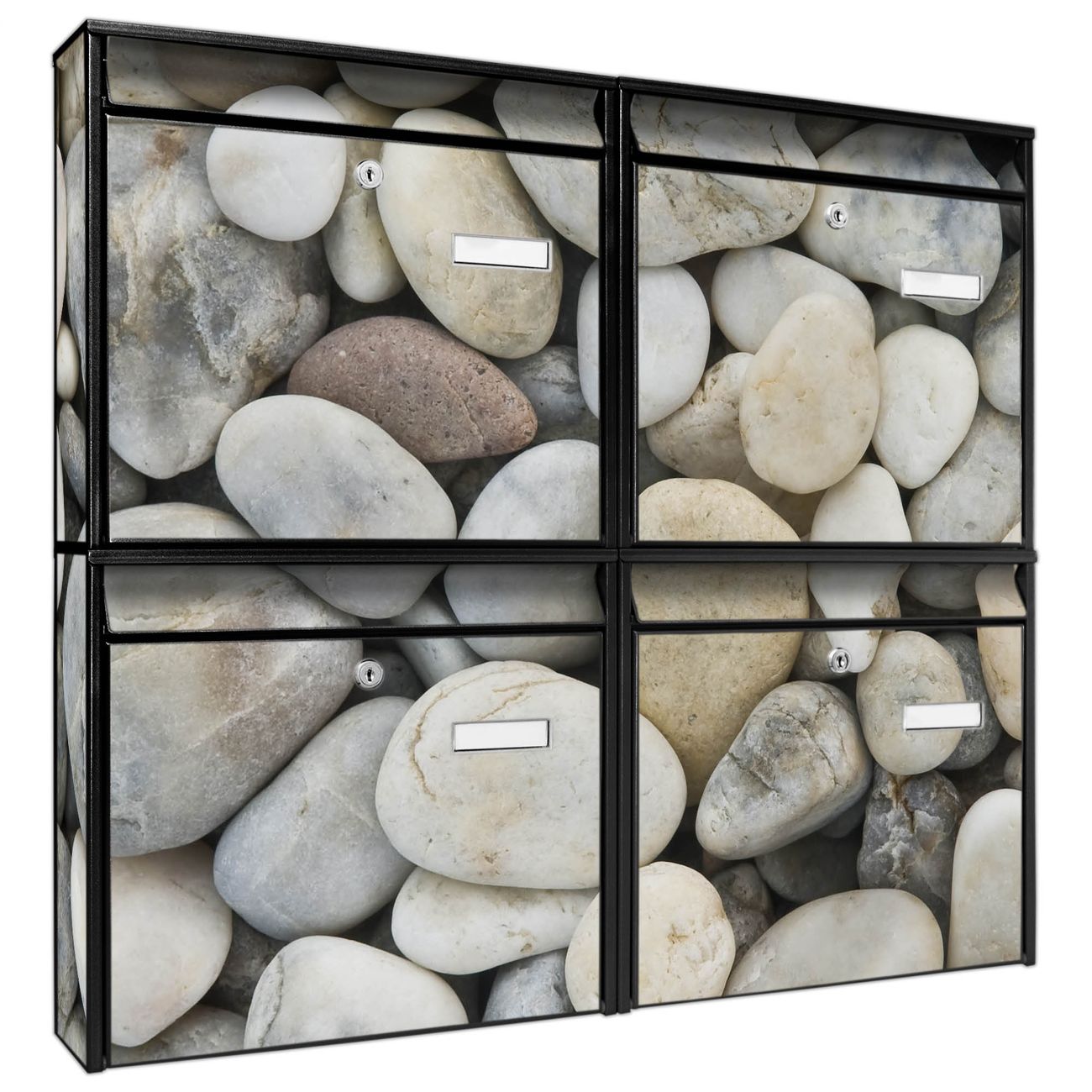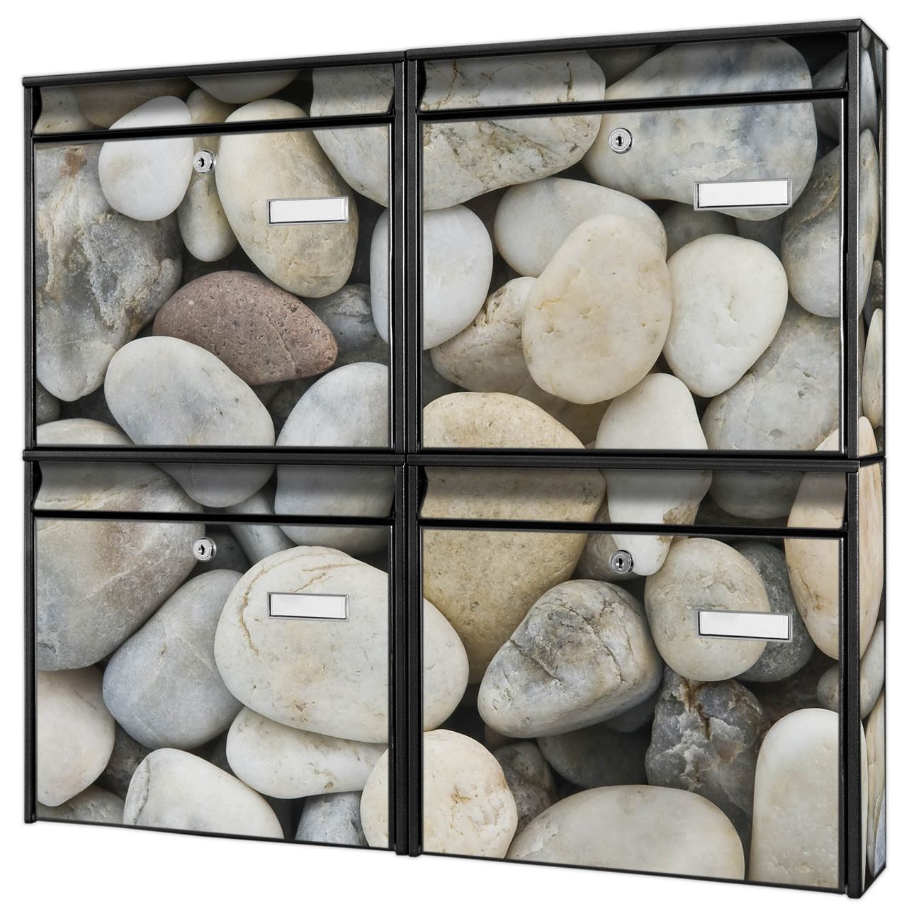 FUNKTION: Die Burg-Wächter Briefkastenanlage mit Motiv Kieselsteine bietet Ihnen ausreichend Fassungsvermögen um auch A4 und C4 Sendungen zu empfangen. Das integrierte Namensschild lässt sich individuell beschriften. Wählen Sie aus den Grundfarben weiß, silber und schwarz. DESIGN: Die 4 Briefkästen haben ein ansprechendes und zeitloses Design, ohne dabei auf Funktionalität zu verzichten. Das Material ist sehr stabil, wetterfest und rostfrei. Durch das Motiv Kieselsteine werden die Postkästen zu einem Blickfang. DETAILS: Die Postkästen bestehen aus verzinktem Stahl der zusätzlich mit Klarlack versiegelt wurde. Die Kästen sind gesamt 64,5cm hoch, 72,5cm breit und 10cm tief. Das Motiv besteht aus einer wetter- und UV-festen Folie, die Ihren Briefkasten zusätzlich vor Kratzern schützt. Die Postkästen werden mit Montagematerial, je einem Namensschild und je zwei Schlüsseln geliefert. NUTZEN: Das Briefkastenset eignet sich für die Wandmontage, die Größe bietet genügend Platz für Sendungen aller Art. Das zeitlose Design sowie die stabile Bauart bieten Ihnen einen treuen Begleiter für Ihre Post. BANJADO: