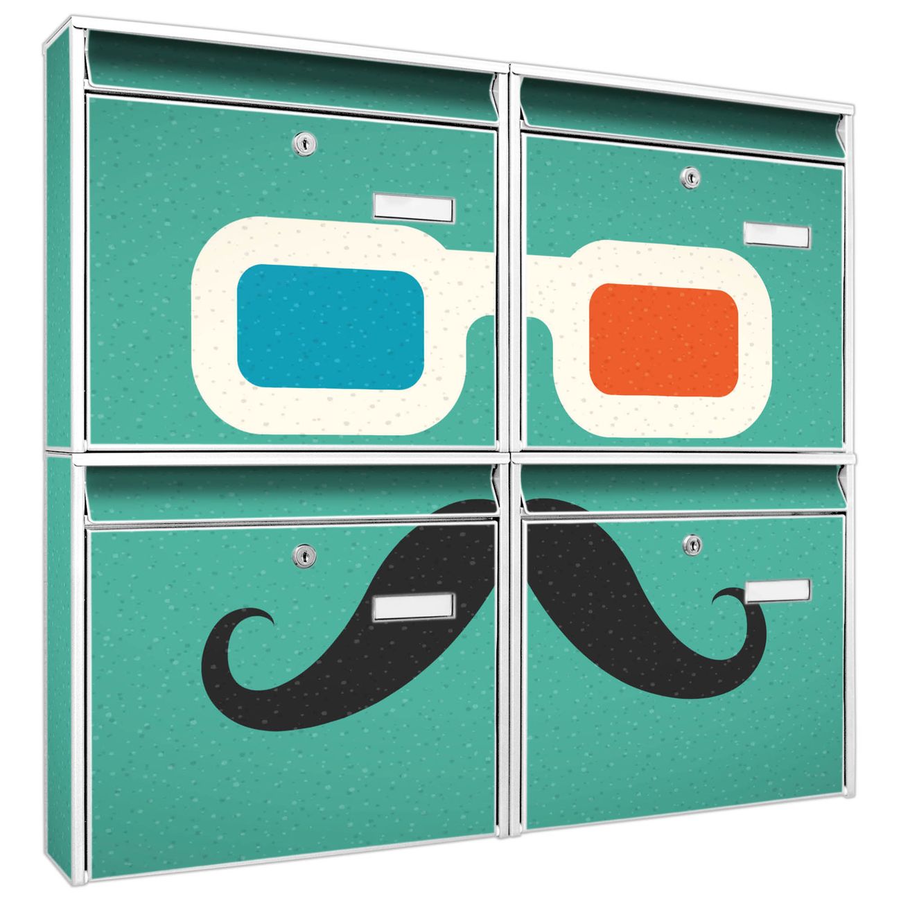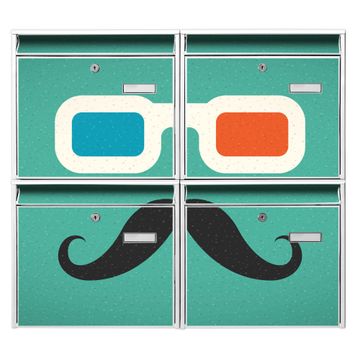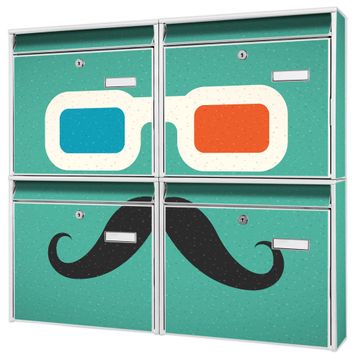 FUNKTION: Die Burg-Wächter Briefkastenanlage mit Motiv Kinobrille bietet Ihnen ausreichend Fassungsvermögen um auch A4 und C4 Sendungen zu empfangen. Das integrierte Namensschild lässt sich individuell beschriften. Wählen Sie aus den Grundfarben weiß, silber und schwarz. DESIGN: Die 4 Briefkästen haben ein ansprechendes und zeitloses Design, ohne dabei auf Funktionalität zu verzichten. Das Material ist sehr stabil, wetterfest und rostfrei. Durch das Motiv Kinobrille werden die Postkästen zu einem Blickfang. DETAILS: Die Postkästen bestehen aus verzinktem Stahl der zusätzlich mit Klarlack versiegelt wurde. Die Kästen sind gesamt 64,5cm hoch, 72,5cm breit und 10cm tief. Das Motiv besteht aus einer wetter- und UV-festen Folie, die Ihren Briefkasten zusätzlich vor Kratzern schützt. Die Postkästen werden mit Montagematerial, je einem Namensschild und je zwei Schlüsseln geliefert. NUTZEN: Das Briefkastenset eignet sich für die Wandmontage, die Größe bietet genügend Platz für Sendungen aller Art. Das zeitlose Design sowie die stabile Bauart bieten Ihnen einen treuen Begleiter für Ihre Post. BANJADO: