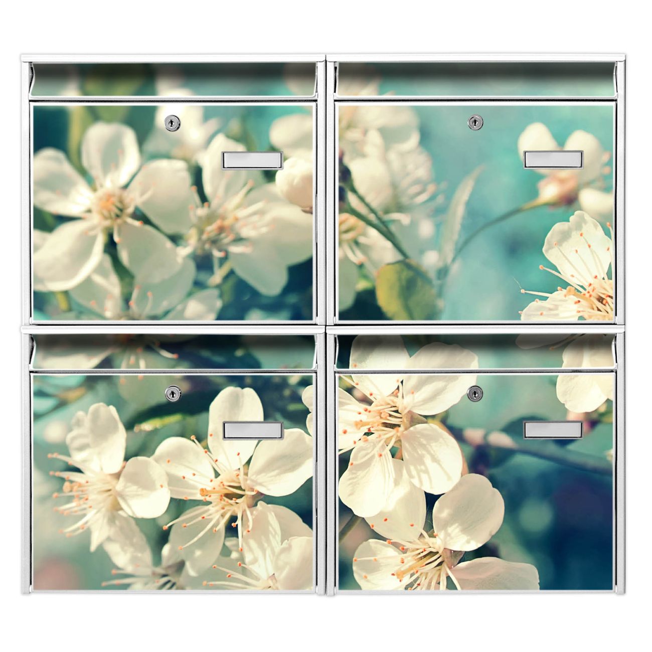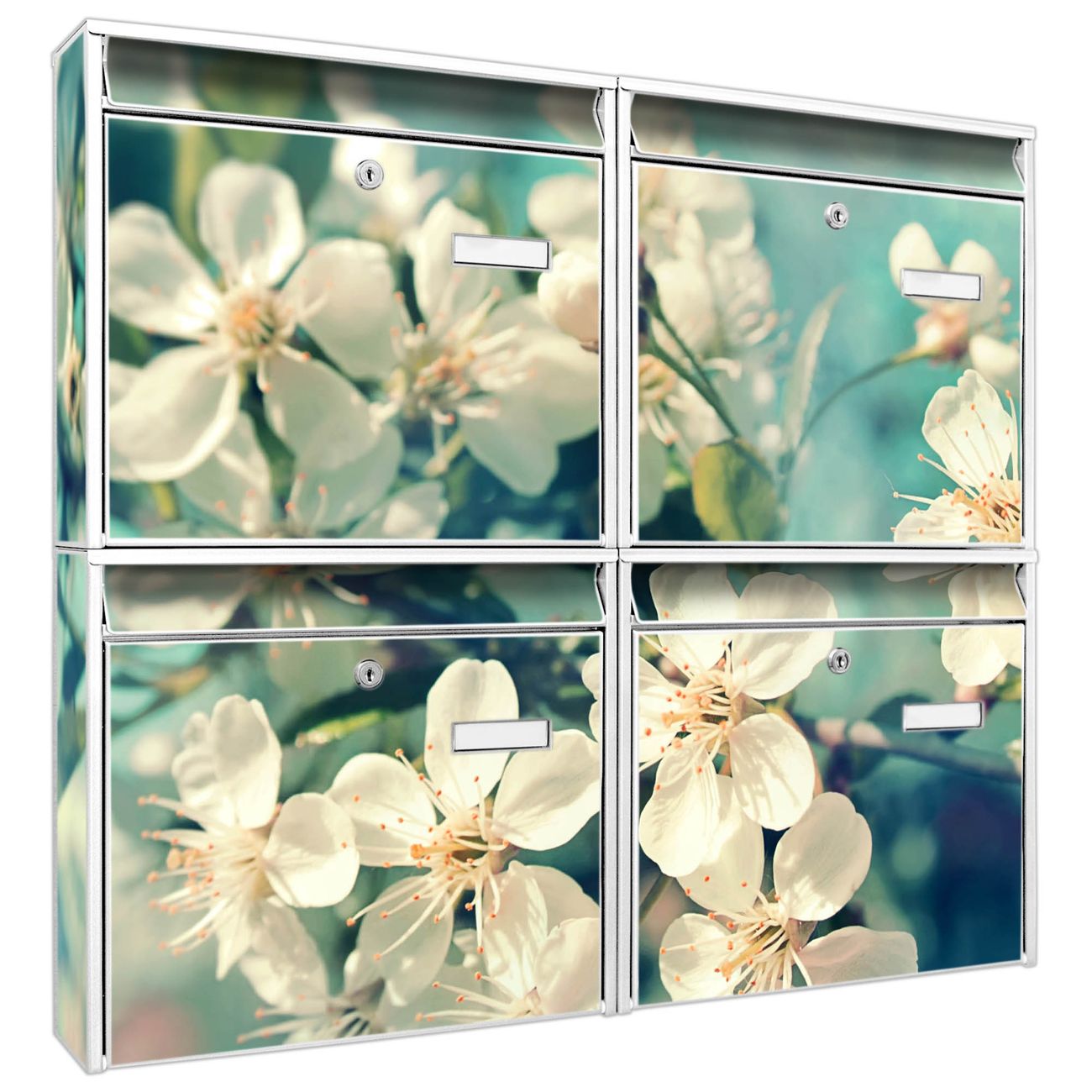 FUNKTION: Die Burg-Wächter Briefkastenanlage mit Motiv Kirschblüten 2 bietet Ihnen ausreichend Fassungsvermögen um auch A4 und C4 Sendungen zu empfangen. Das integrierte Namensschild lässt sich individuell beschriften. Wählen Sie aus den Grundfarben weiß, silber und schwarz. DESIGN: Die 4 Briefkästen haben ein ansprechendes und zeitloses Design, ohne dabei auf Funktionalität zu verzichten. Das Material ist sehr stabil, wetterfest und rostfrei. Durch das Motiv Kirschblüten 2 werden die Postkästen zu einem Blickfang. DETAILS: Die Postkästen bestehen aus verzinktem Stahl der zusätzlich mit Klarlack versiegelt wurde. Die Kästen sind gesamt 64,5cm hoch, 72,5cm breit und 10cm tief. Das Motiv besteht aus einer wetter- und UV-festen Folie, die Ihren Briefkasten zusätzlich vor Kratzern schützt. Die Postkästen werden mit Montagematerial, je einem Namensschild und je zwei Schlüsseln geliefert. NUTZEN: Das Briefkastenset eignet sich für die Wandmontage, die Größe bietet genügend Platz für Sendungen aller Art. Das zeitlose Design sowie die stabile Bauart bieten Ihnen einen treuen Begleiter für Ihre Post. BANJADO: