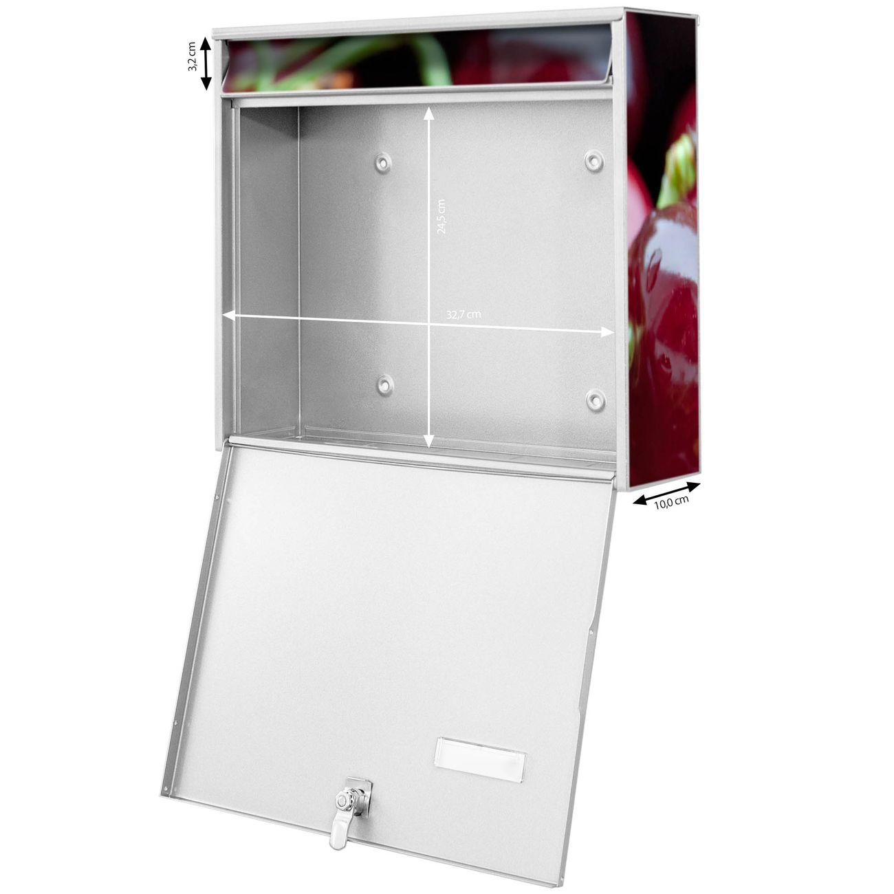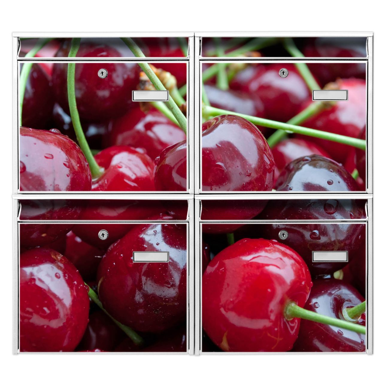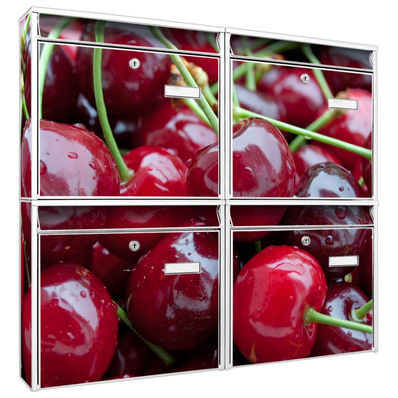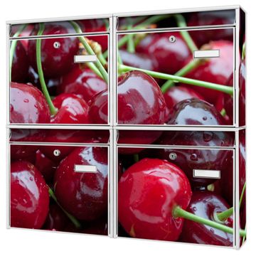 FUNKTION: Die Burg-Wächter Briefkastenanlage mit Motiv Kirschen bietet Ihnen ausreichend Fassungsvermögen um auch A4 und C4 Sendungen zu empfangen. Das integrierte Namensschild lässt sich individuell beschriften. Wählen Sie aus den Grundfarben weiß, silber und schwarz. DESIGN: Die 4 Briefkästen haben ein ansprechendes und zeitloses Design, ohne dabei auf Funktionalität zu verzichten. Das Material ist sehr stabil, wetterfest und rostfrei. Durch das Motiv Kirschen werden die Postkästen zu einem Blickfang. DETAILS: Die Postkästen bestehen aus verzinktem Stahl der zusätzlich mit Klarlack versiegelt wurde. Die Kästen sind gesamt 64,5cm hoch, 72,5cm breit und 10cm tief. Das Motiv besteht aus einer wetter- und UV-festen Folie, die Ihren Briefkasten zusätzlich vor Kratzern schützt. Die Postkästen werden mit Montagematerial, je einem Namensschild und je zwei Schlüsseln geliefert. NUTZEN: Das Briefkastenset eignet sich für die Wandmontage, die Größe bietet genügend Platz für Sendungen aller Art. Das zeitlose Design sowie die stabile Bauart bieten Ihnen einen treuen Begleiter für Ihre Post. BANJADO: