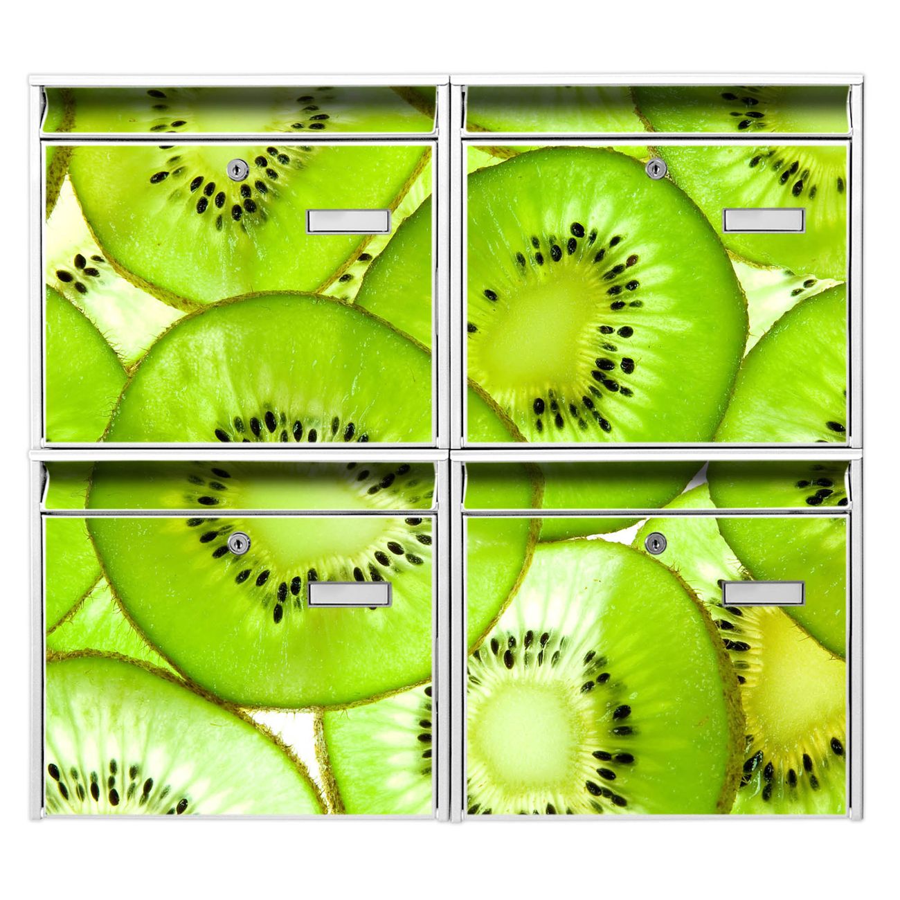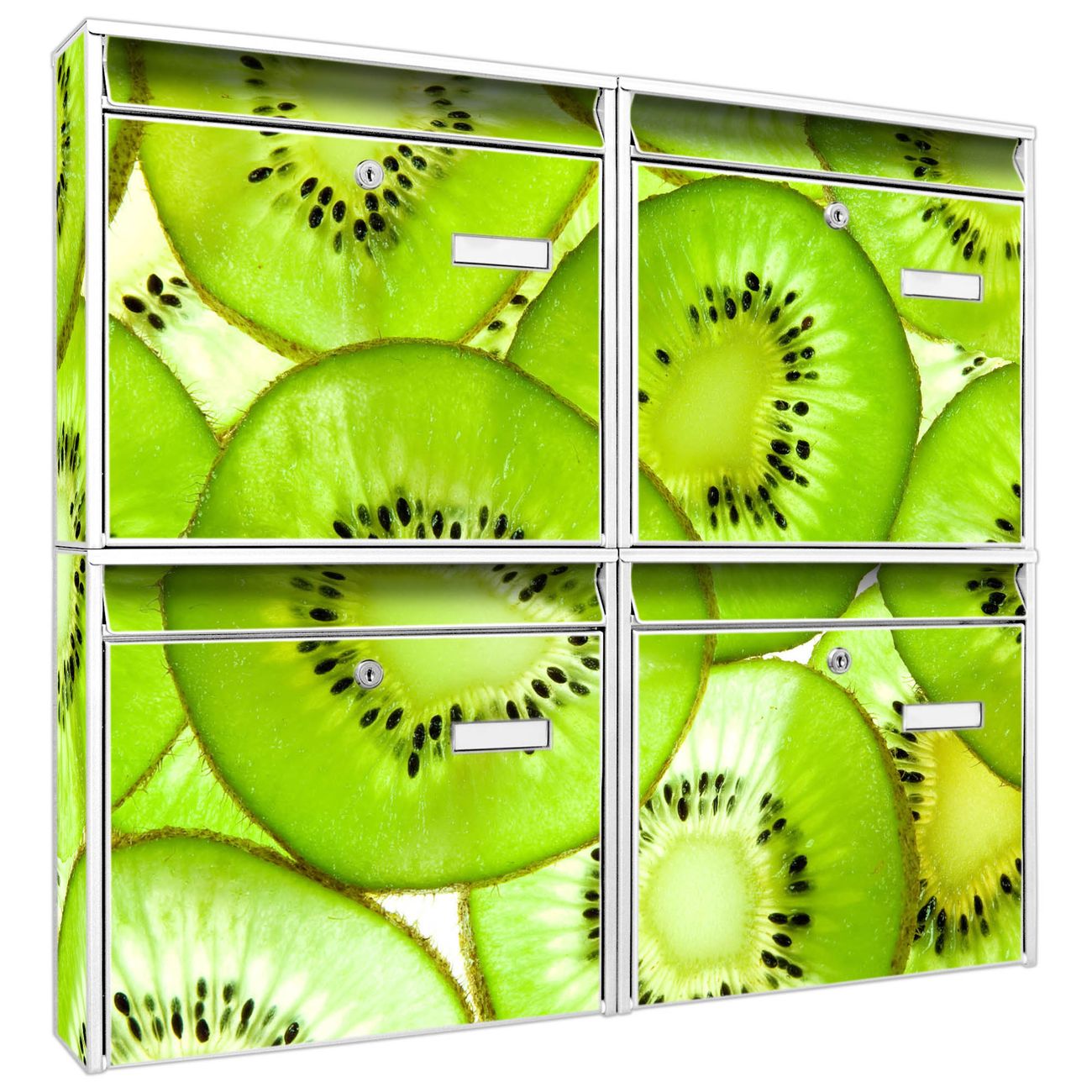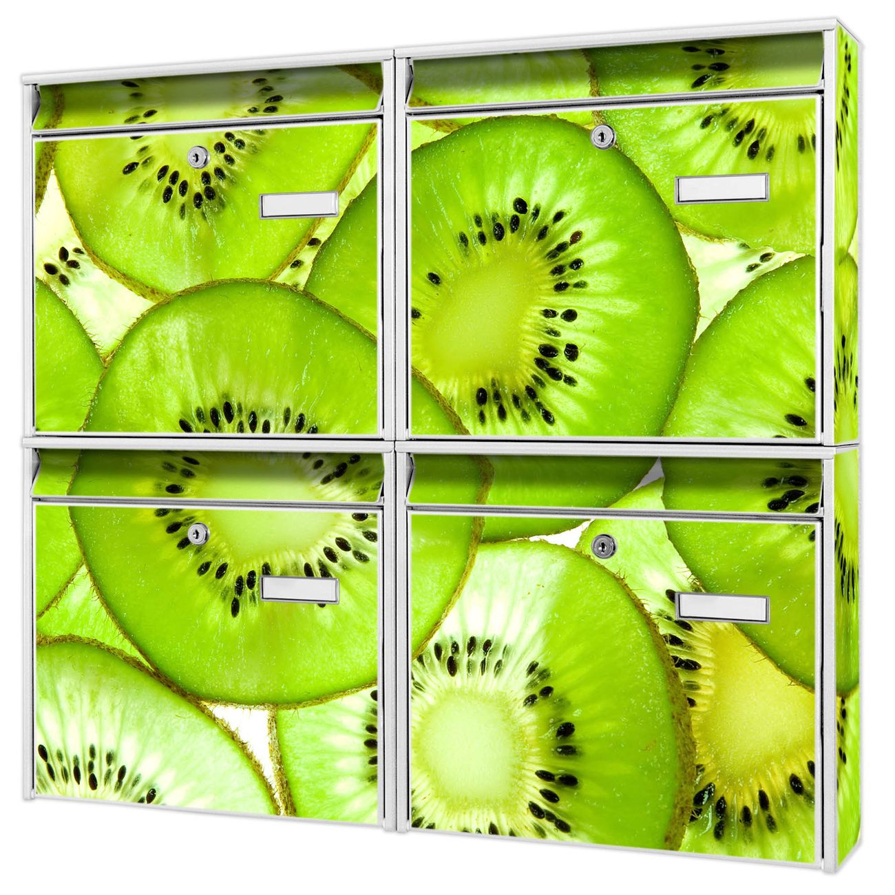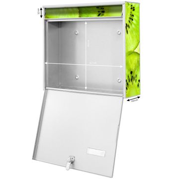 FUNKTION: Die Burg-Wächter Briefkastenanlage mit Motiv Kiwi bietet Ihnen ausreichend Fassungsvermögen um auch A4 und C4 Sendungen zu empfangen. Das integrierte Namensschild lässt sich individuell beschriften. Wählen Sie aus den Grundfarben weiß, silber und schwarz. DESIGN: Die 4 Briefkästen haben ein ansprechendes und zeitloses Design, ohne dabei auf Funktionalität zu verzichten. Das Material ist sehr stabil, wetterfest und rostfrei. Durch das Motiv Kiwi werden die Postkästen zu einem Blickfang. DETAILS: Die Postkästen bestehen aus verzinktem Stahl der zusätzlich mit Klarlack versiegelt wurde. Die Kästen sind gesamt 64,5cm hoch, 72,5cm breit und 10cm tief. Das Motiv besteht aus einer wetter- und UV-festen Folie, die Ihren Briefkasten zusätzlich vor Kratzern schützt. Die Postkästen werden mit Montagematerial, je einem Namensschild und je zwei Schlüsseln geliefert. NUTZEN: Das Briefkastenset eignet sich für die Wandmontage, die Größe bietet genügend Platz für Sendungen aller Art. Das zeitlose Design sowie die stabile Bauart bieten Ihnen einen treuen Begleiter für Ihre Post. BANJADO: