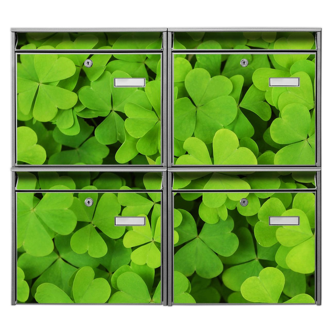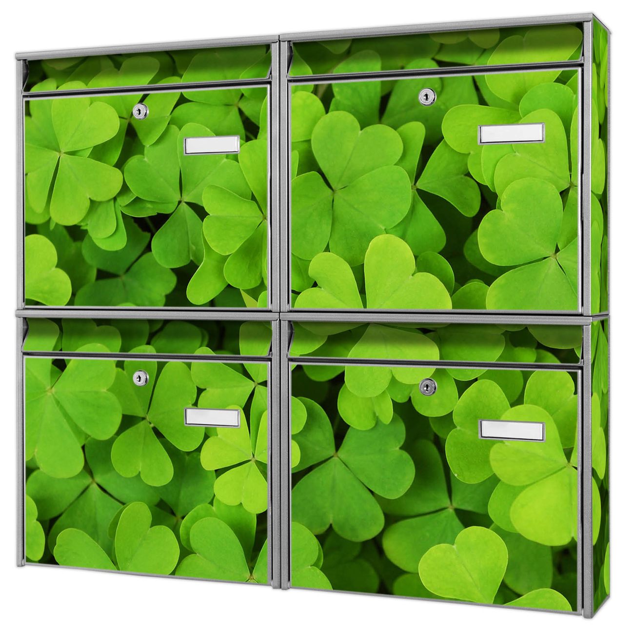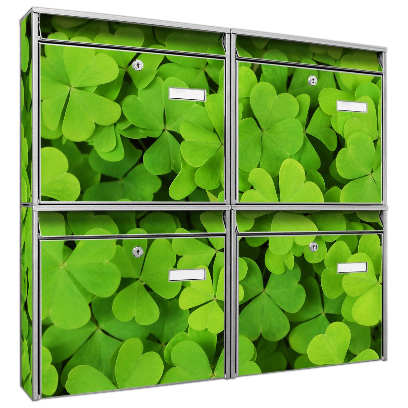 FUNKTION: Die Burg-Wächter Briefkastenanlage mit Motiv Klee bietet Ihnen ausreichend Fassungsvermögen um auch A4 und C4 Sendungen zu empfangen. Das integrierte Namensschild lässt sich individuell beschriften. Wählen Sie aus den Grundfarben weiß, silber und schwarz. DESIGN: Die 4 Briefkästen haben ein ansprechendes und zeitloses Design, ohne dabei auf Funktionalität zu verzichten. Das Material ist sehr stabil, wetterfest und rostfrei. Durch das Motiv Klee werden die Postkästen zu einem Blickfang. DETAILS: Die Postkästen bestehen aus verzinktem Stahl der zusätzlich mit Klarlack versiegelt wurde. Die Kästen sind gesamt 64,5cm hoch, 72,5cm breit und 10cm tief. Das Motiv besteht aus einer wetter- und UV-festen Folie, die Ihren Briefkasten zusätzlich vor Kratzern schützt. Die Postkästen werden mit Montagematerial, je einem Namensschild und je zwei Schlüsseln geliefert. NUTZEN: Das Briefkastenset eignet sich für die Wandmontage, die Größe bietet genügend Platz für Sendungen aller Art. Das zeitlose Design sowie die stabile Bauart bieten Ihnen einen treuen Begleiter für Ihre Post. BANJADO: